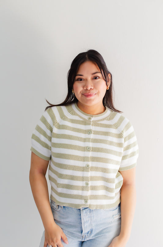 Raglan Short Sleeve Crew Neck Sage & White Stripped Boxy Sweater