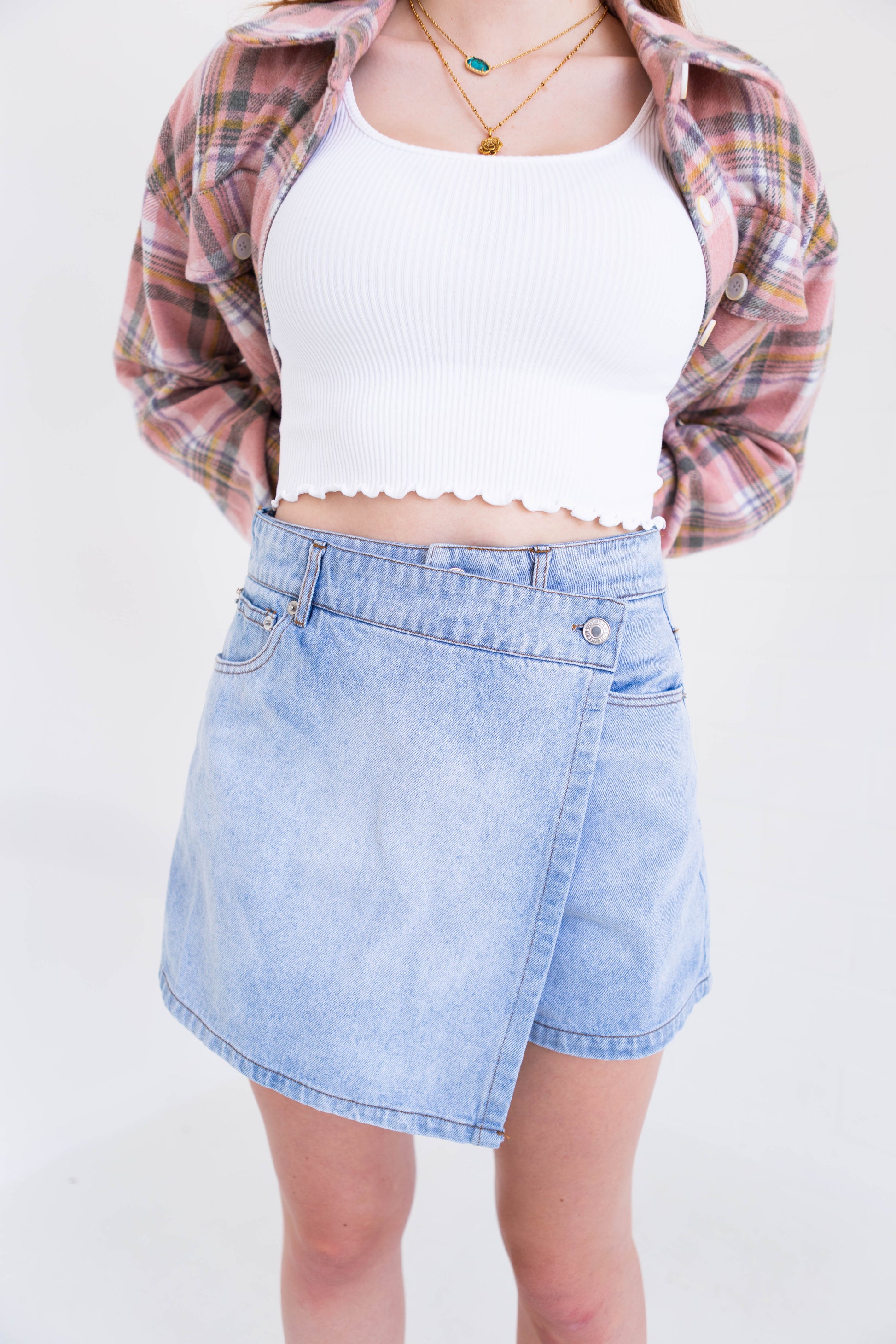 A washed denim skort featuring side pockets and front closure Details: Self : 92% Cotton 8% Polyester Size & Fit - Model is 5`9" And Wearing Size Small - Measurements Taken From Size Small - Approx. Length: 14"