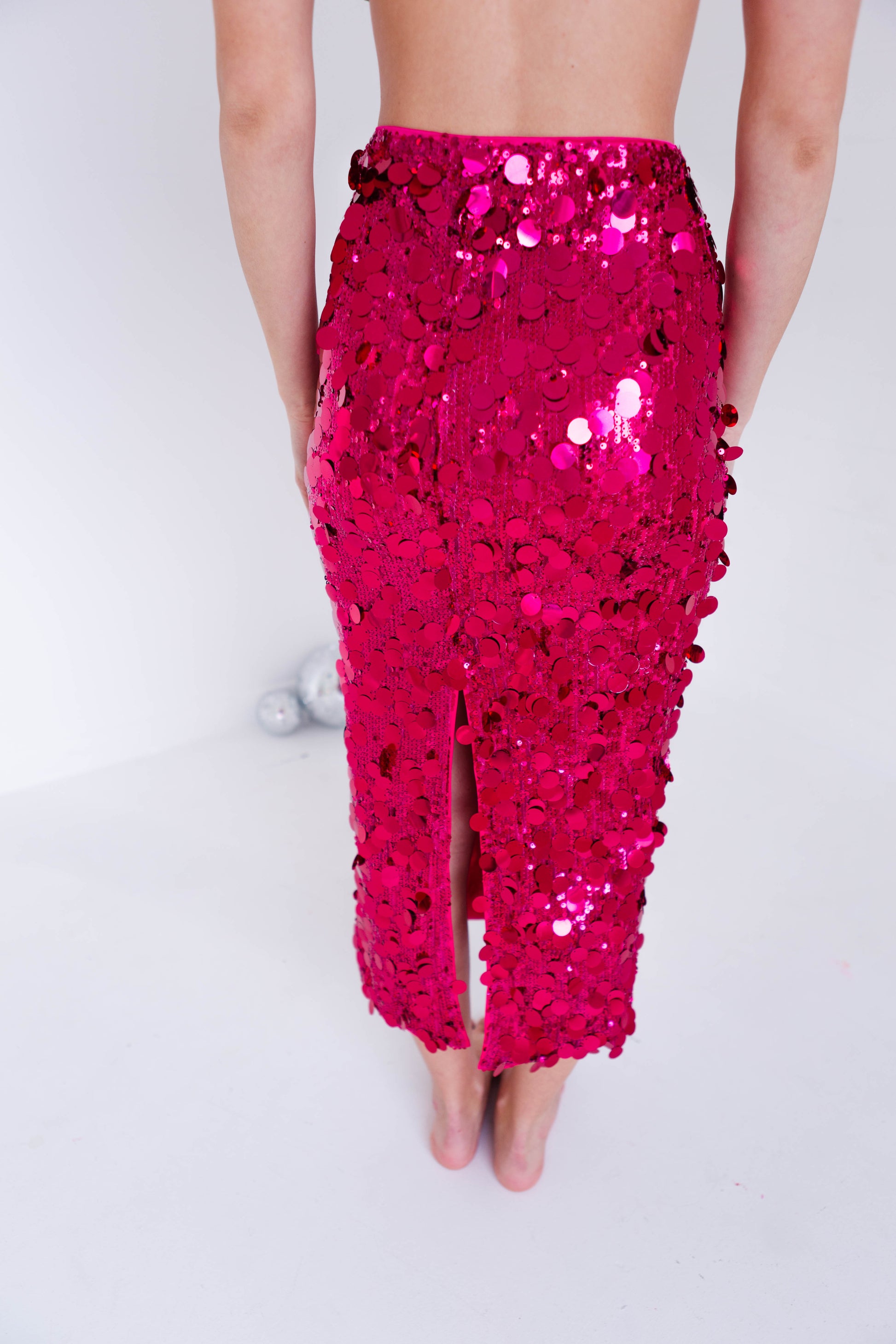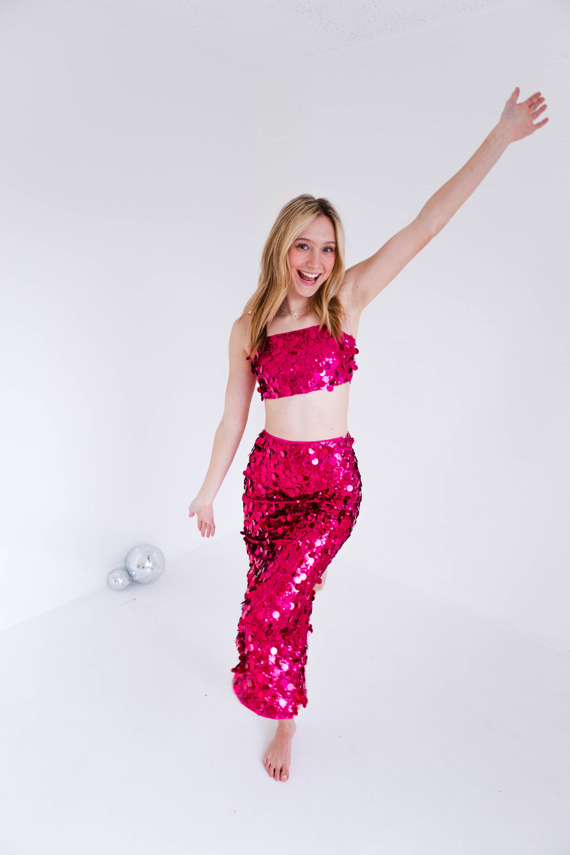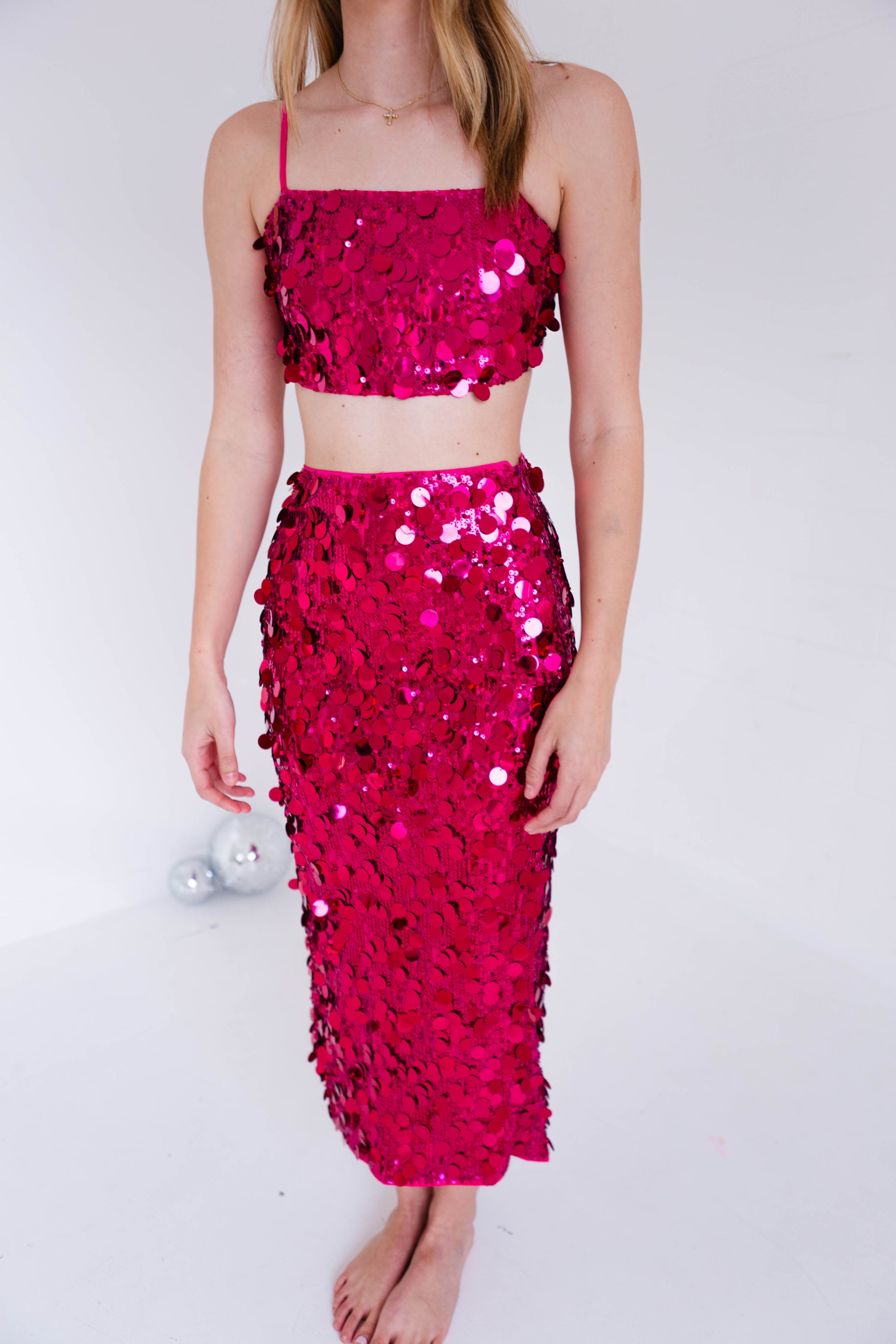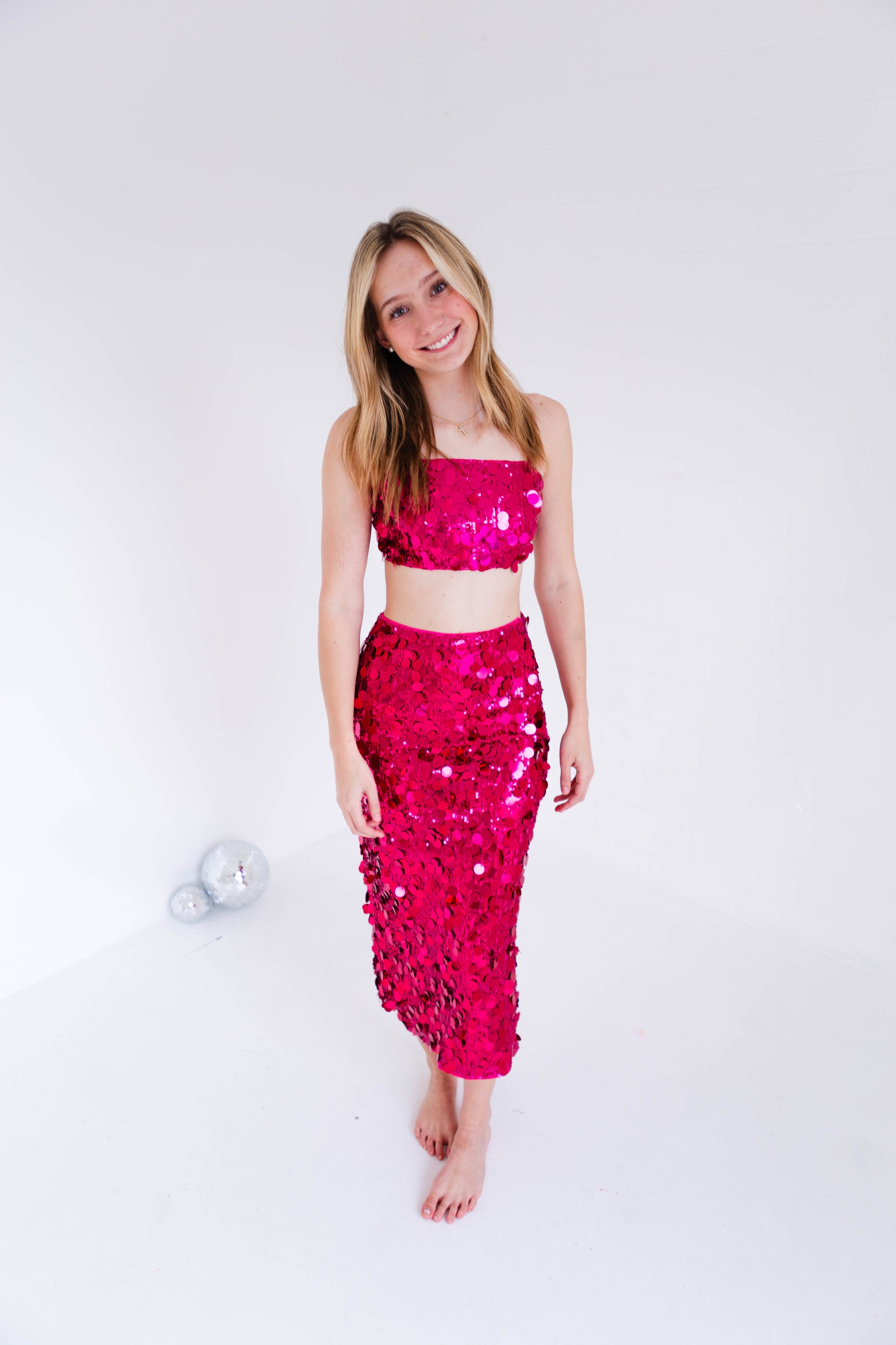 Shimmer and shine in our Barbie Pink Sequin Set, perfect for turning heads and feeling like a beauty queen. With a crop top and midi skirt, this outfit is versatile for any occasion, from bachelorette weekends to prom to wedding guest attire. Get ready to make the whole place shimmer in this bejeweled ensemble!