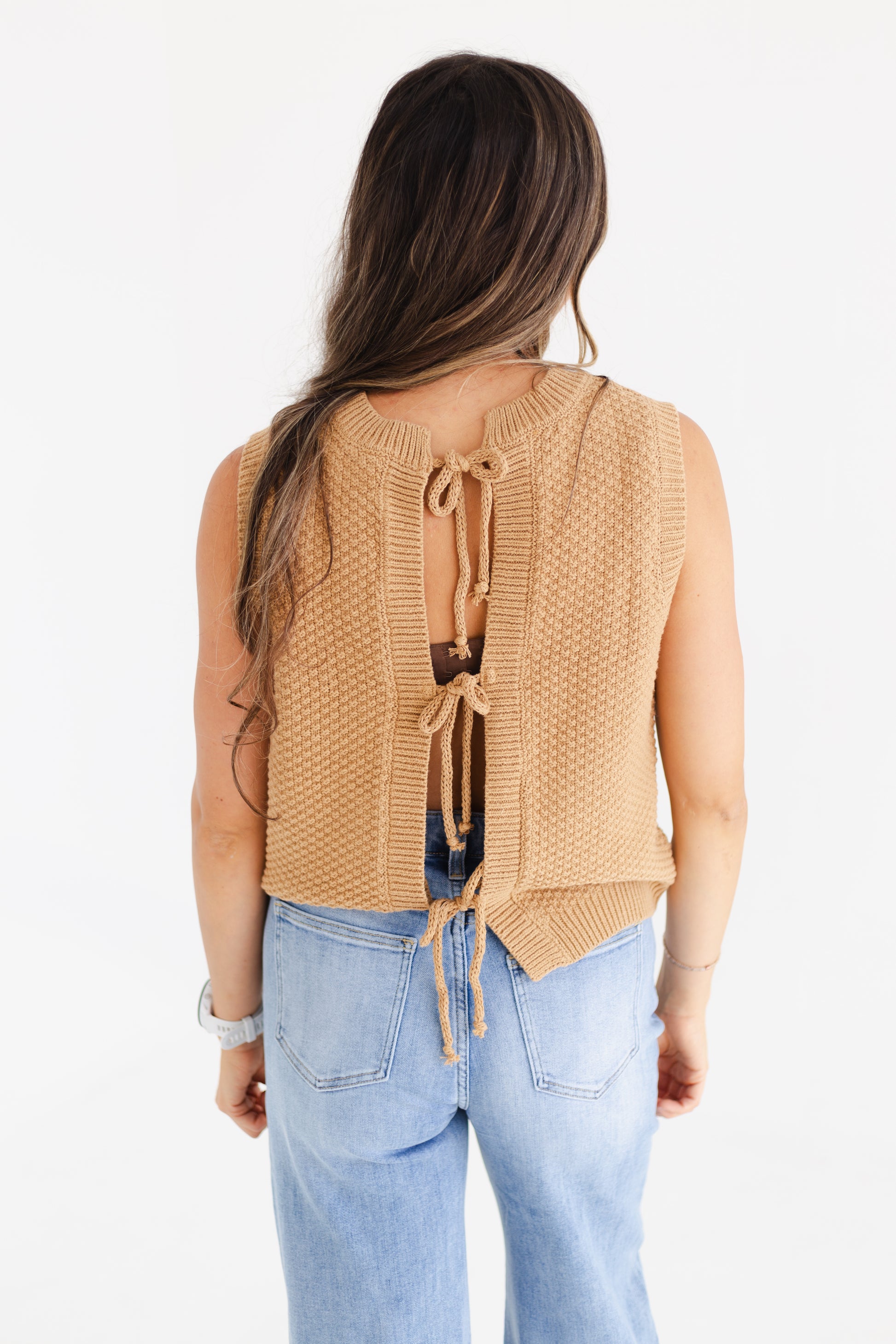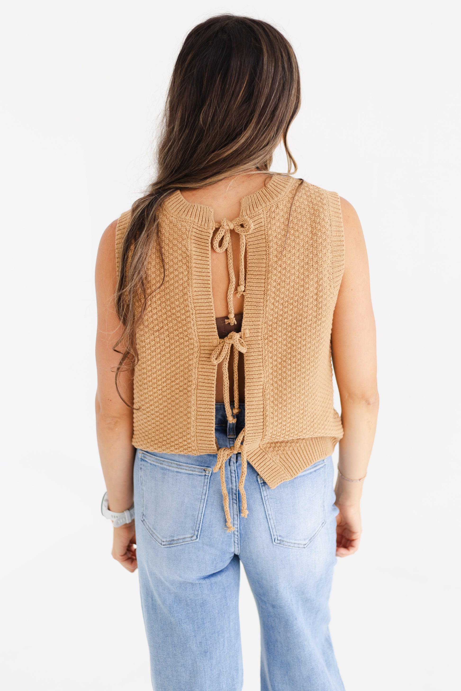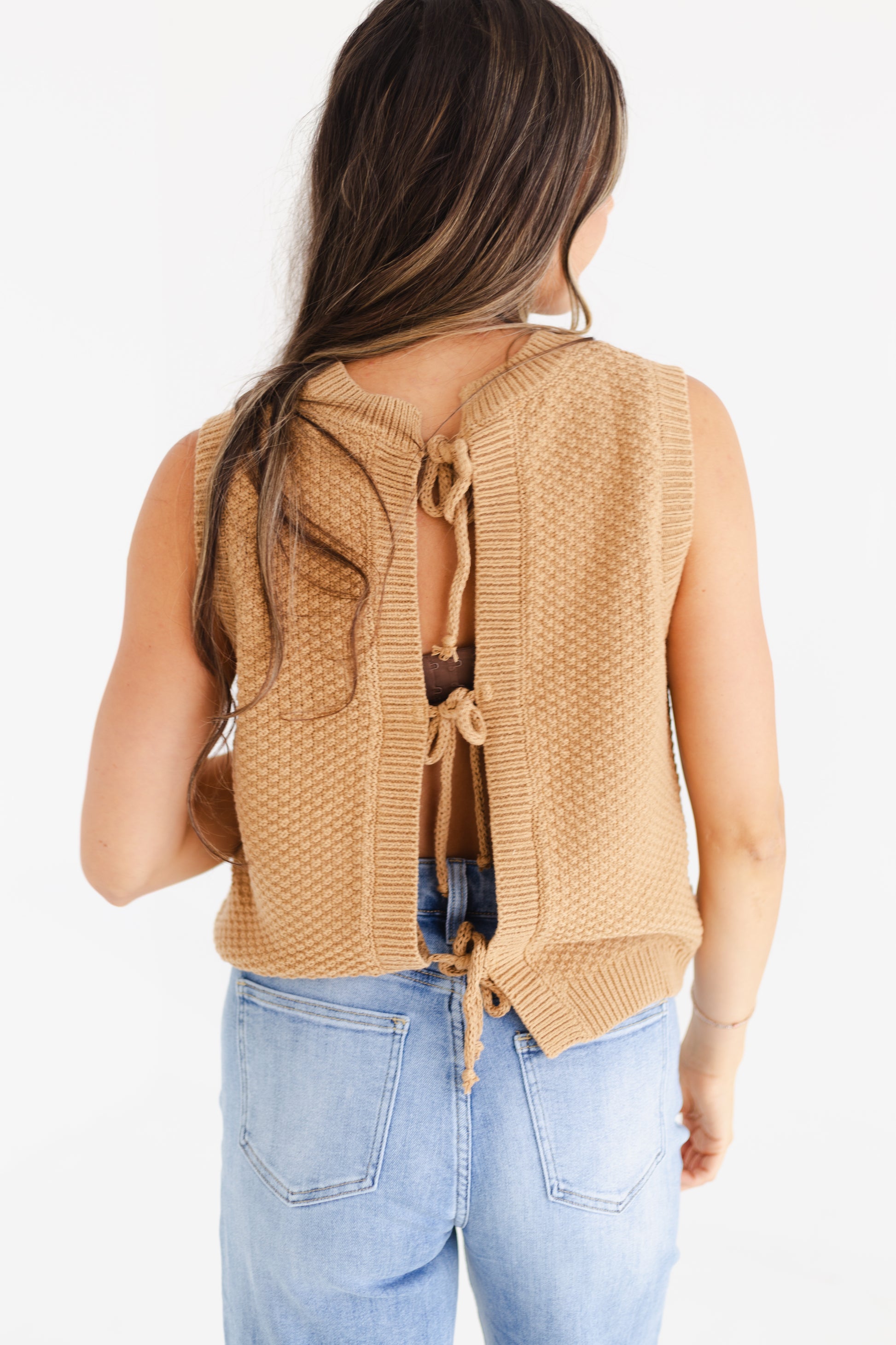This caramel sweater vest is the perfect mix of cozy and cute, made from a soft blend of 60% cotton and 40% acrylic. The textured fabric and playful self back ties give it a fun, girly vibe that’s ideal for layering over your favorite tops or wearing it alone. Lightweight and comfy, it’s a must-have piece to elevate your everyday style with a fresh, youthful twist.