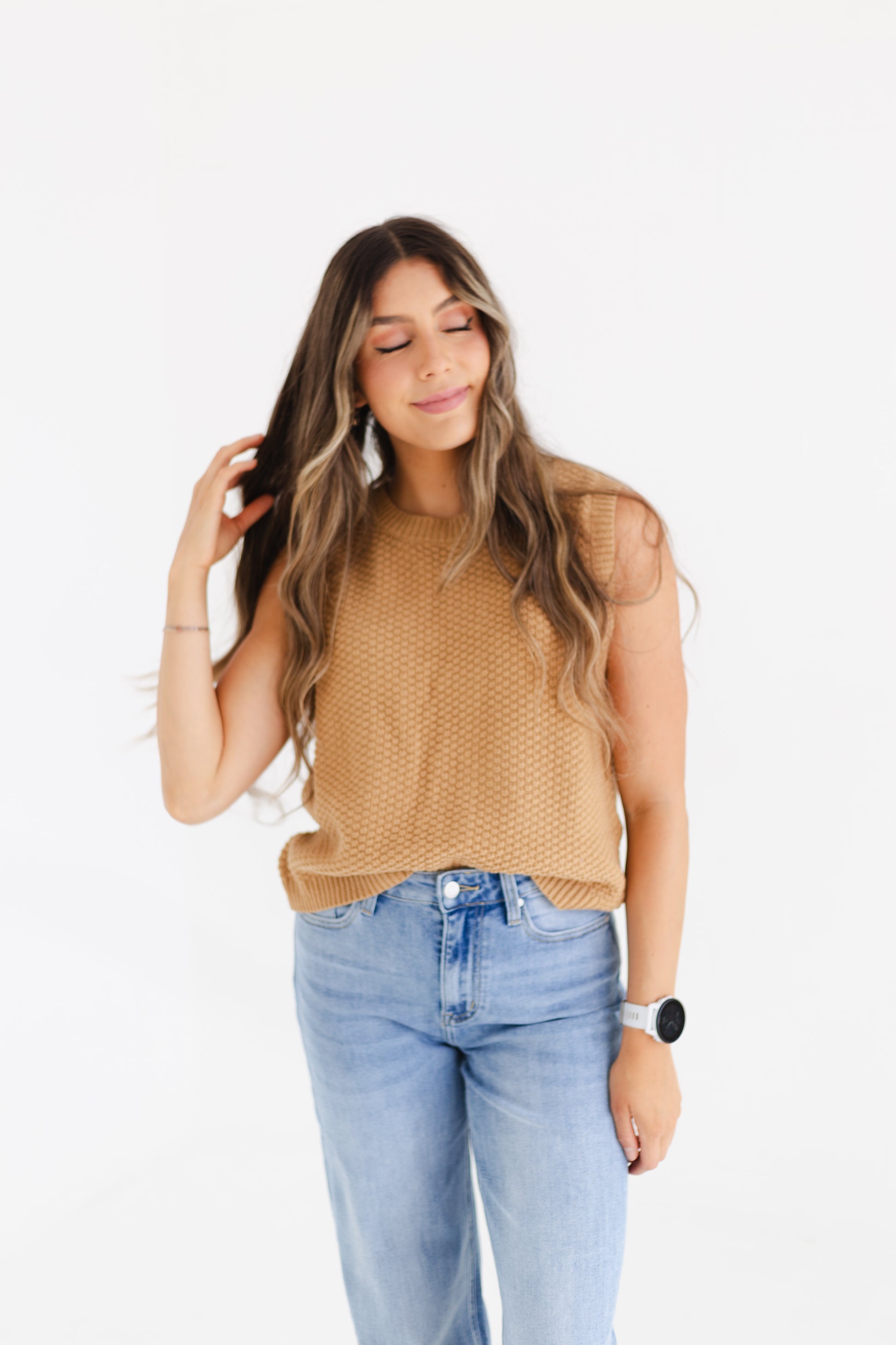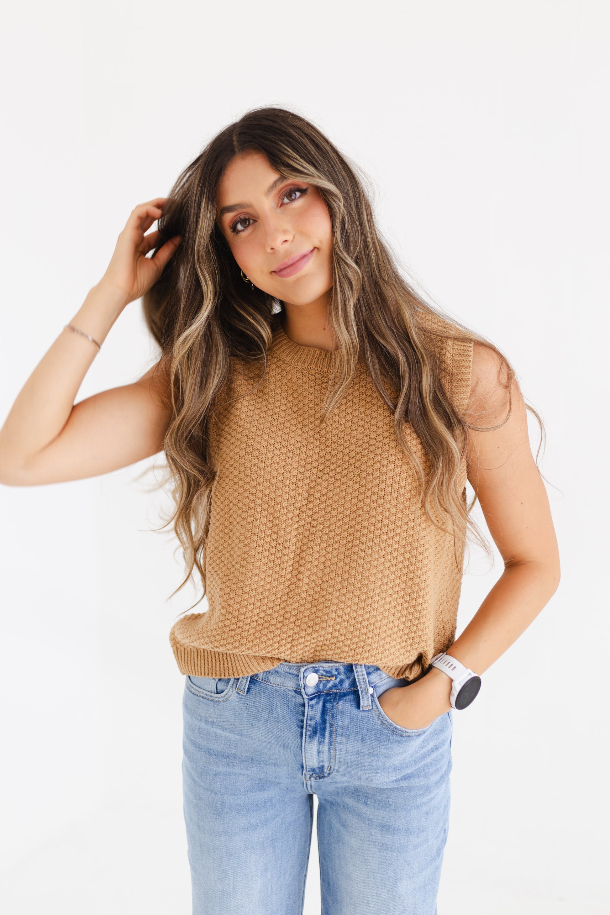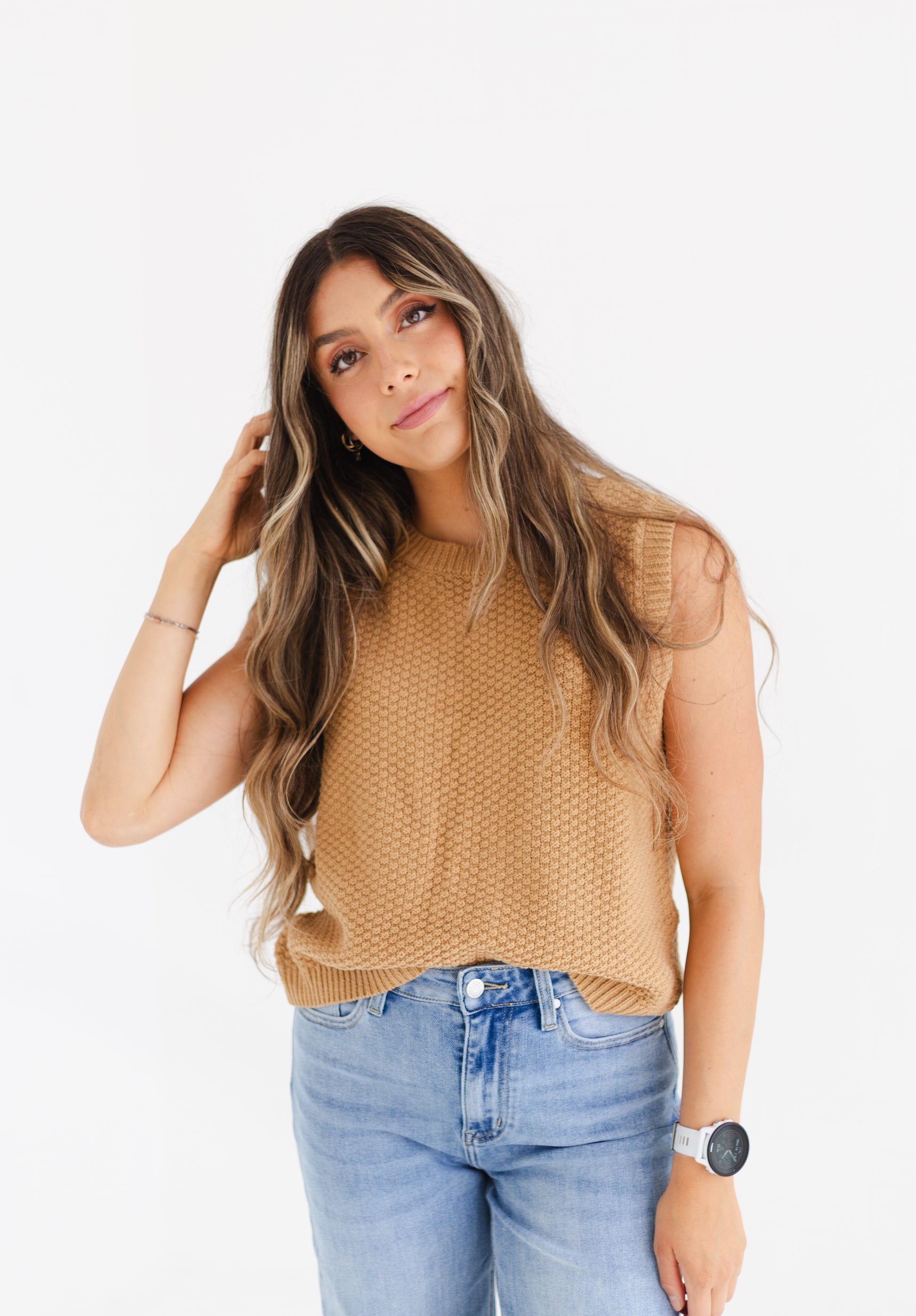 This caramel sweater vest is the perfect mix of cozy and cute, made from a soft blend of 60% cotton and 40% acrylic. The textured fabric and playful self back ties give it a fun, girly vibe that’s ideal for layering over your favorite tops or wearing it alone. Lightweight and comfy, it’s a must-have piece to elevate your everyday style with a fresh, youthful twist.