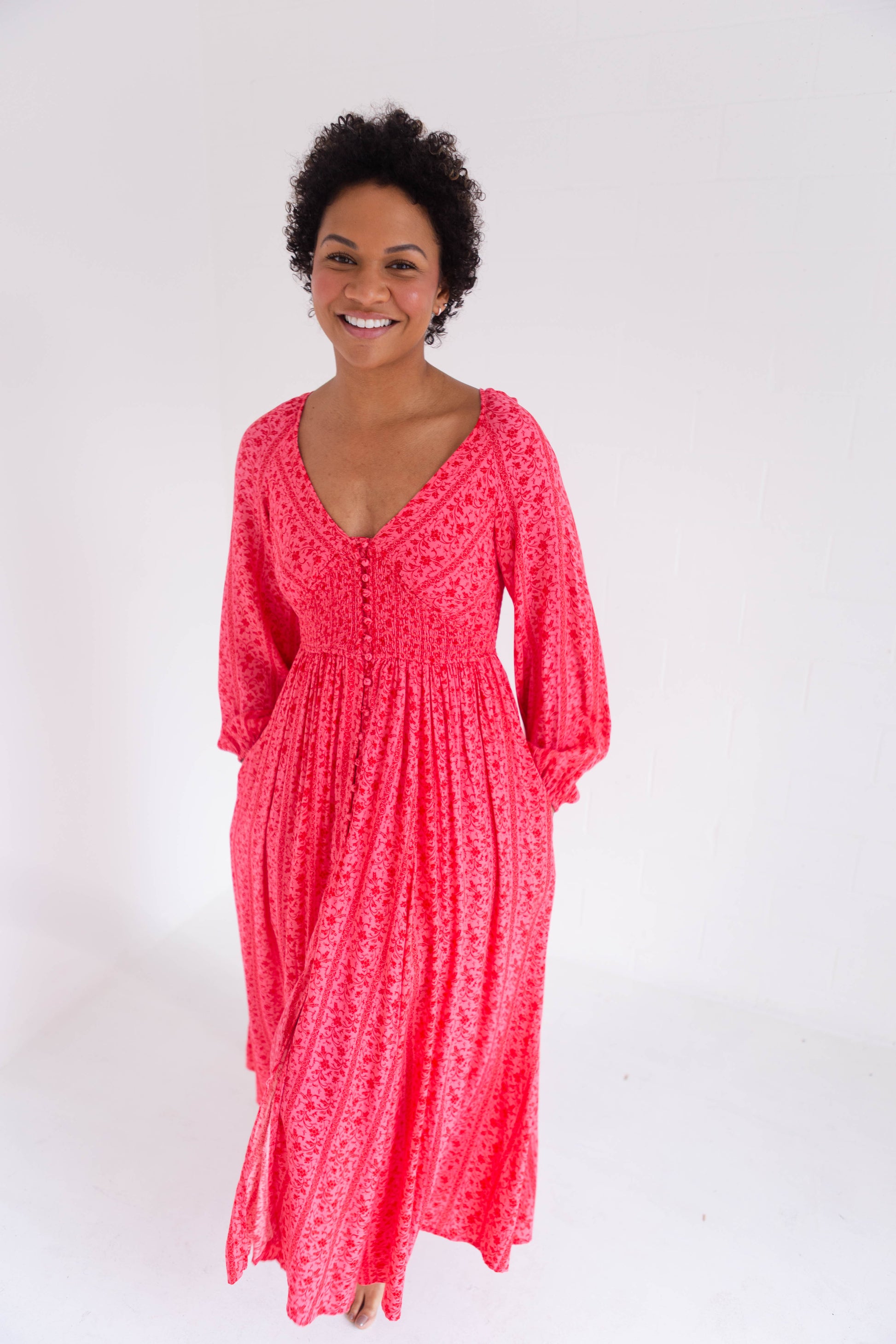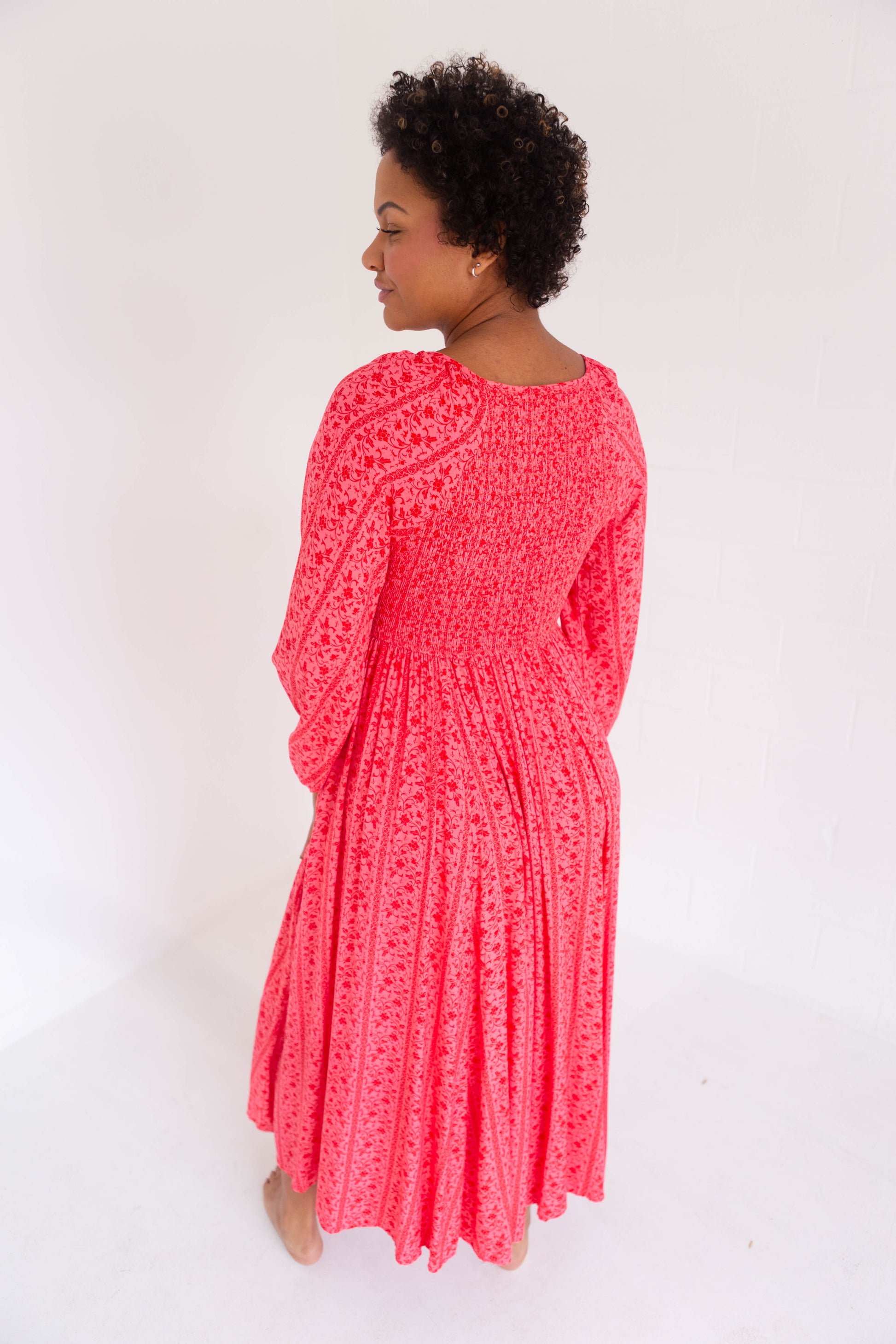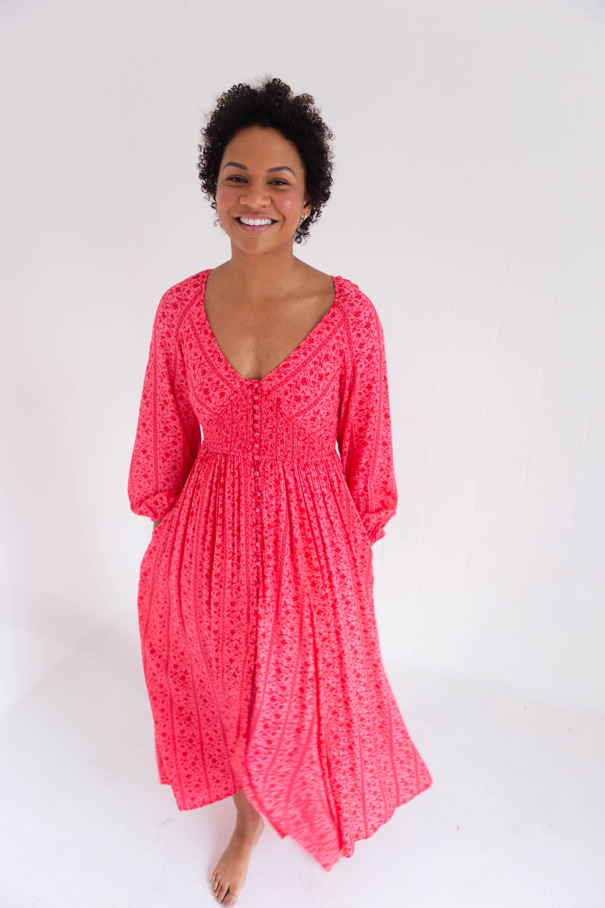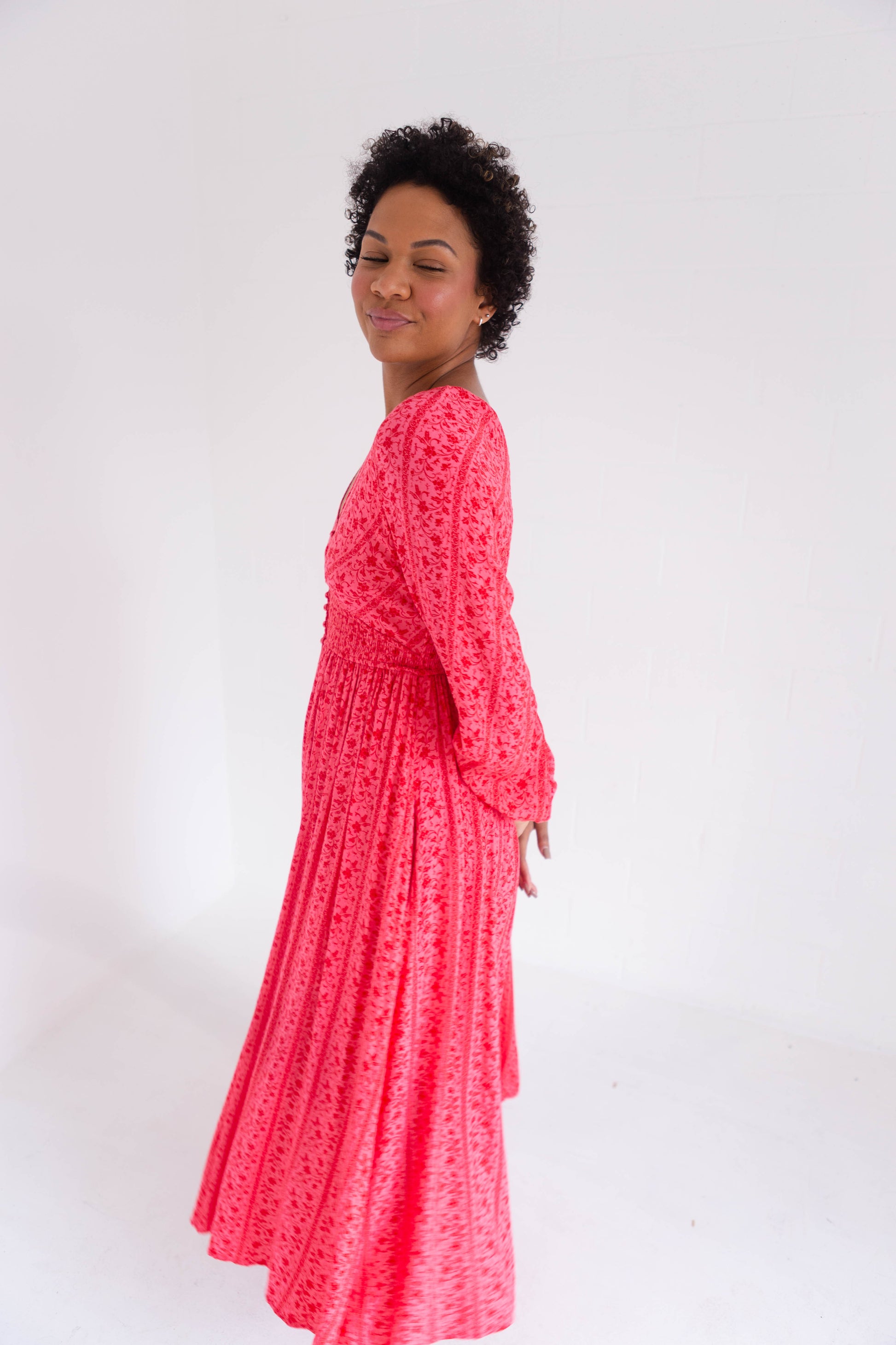 This dress is a "berry" good choice for any occasion! With long sleeves, smocked details for stretch, and pockets, it's both fashionable and functional. Plus, the v-neck adds a touch of flirty fun! Natalia is 5'7" wearing a small.