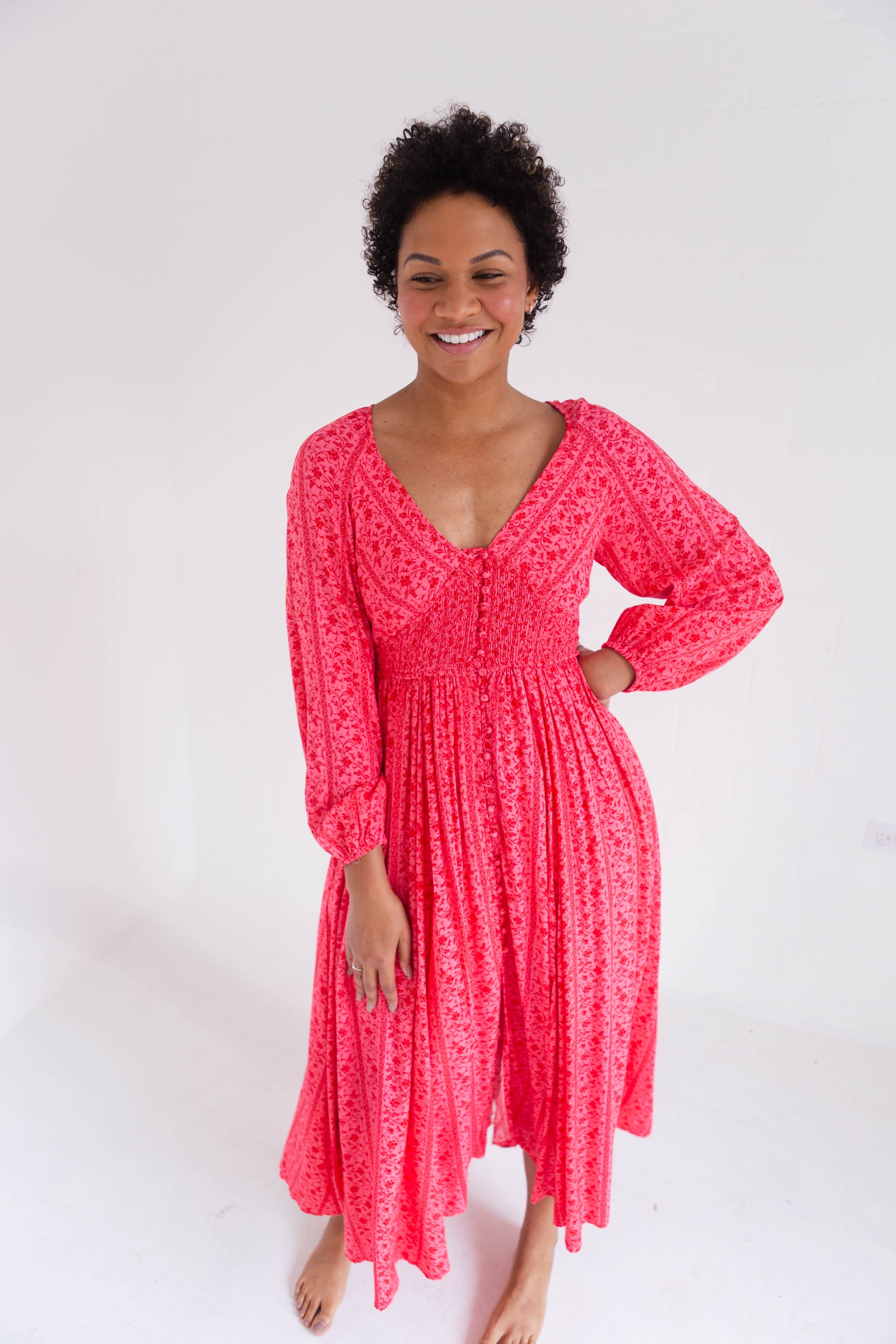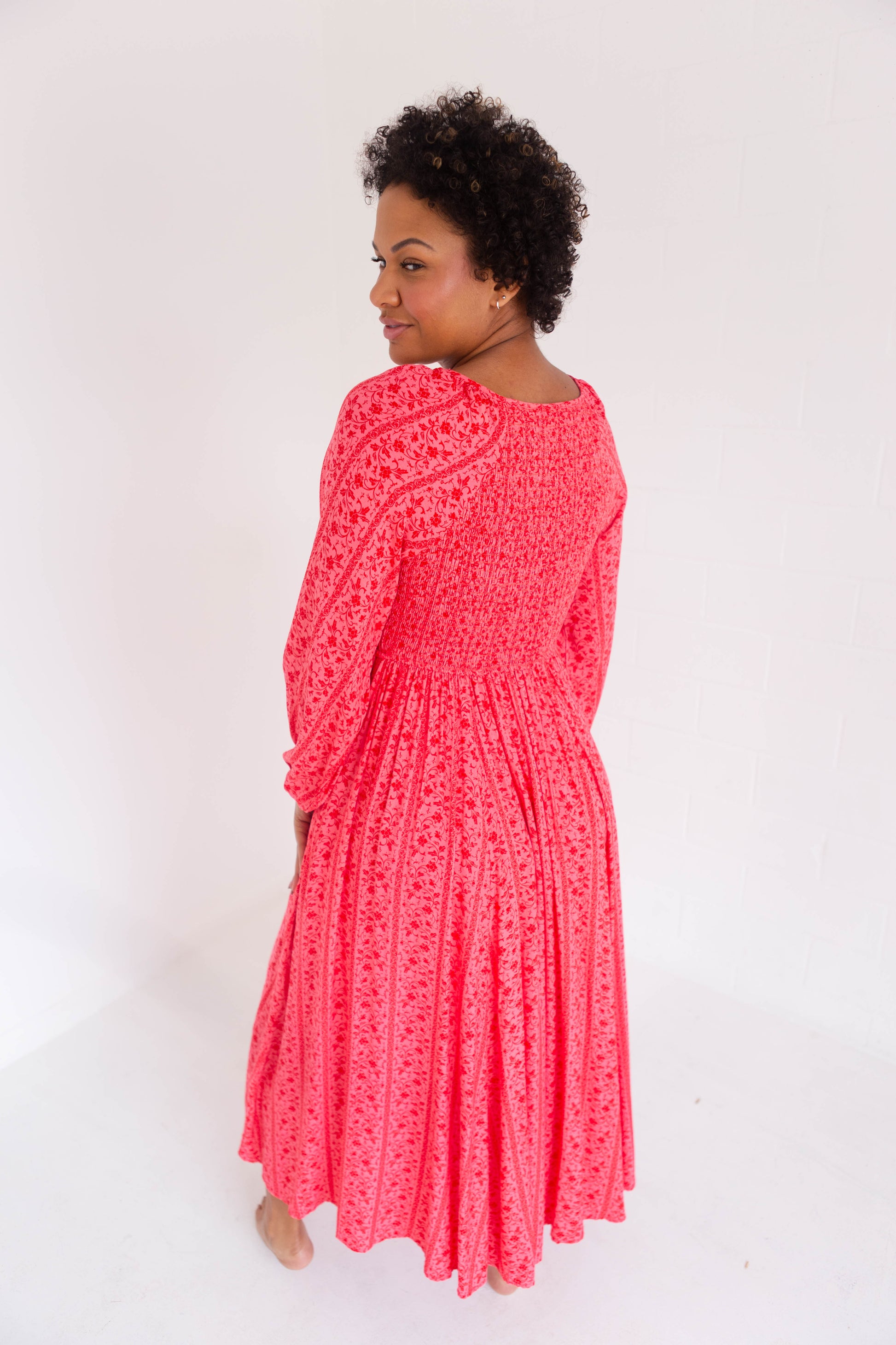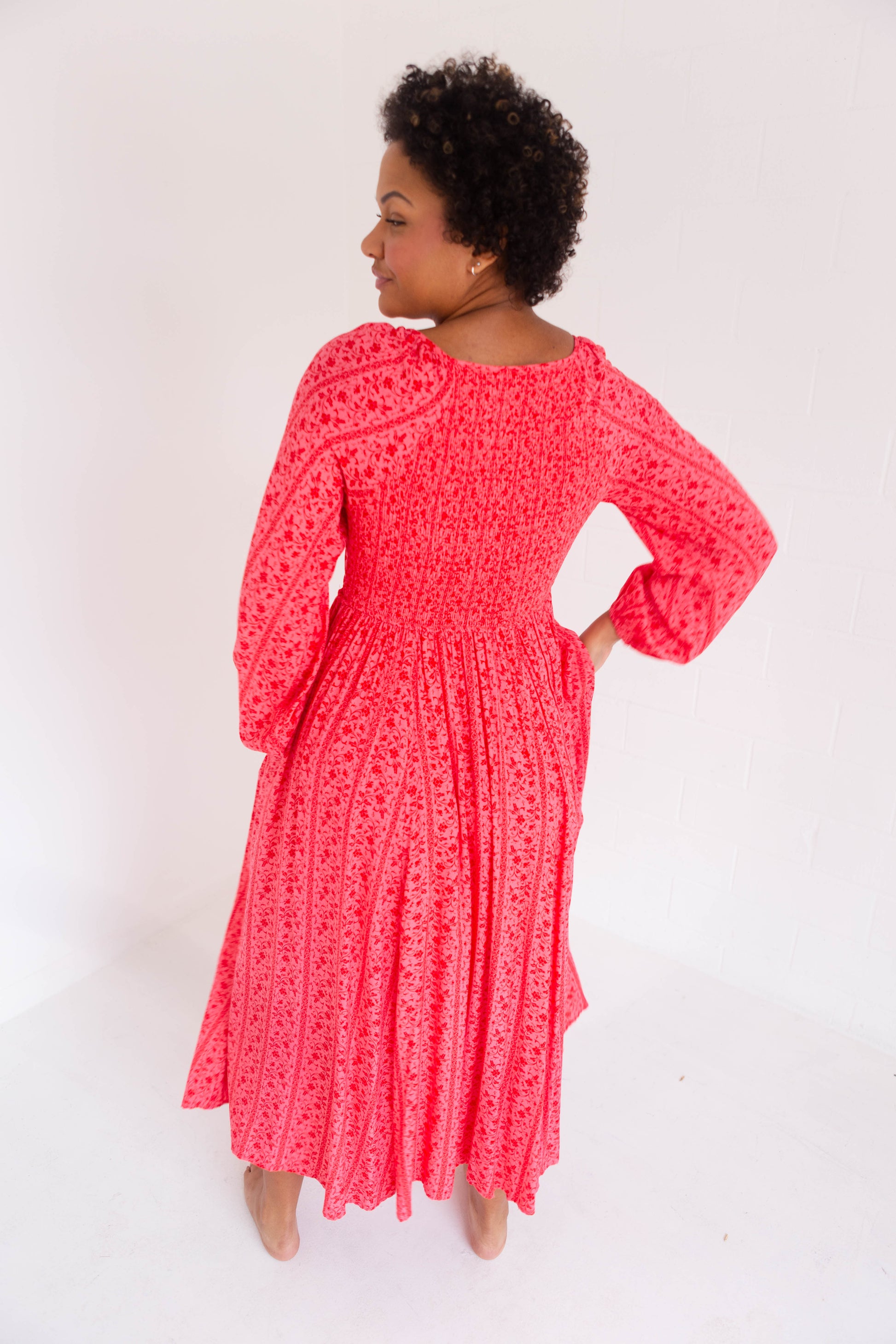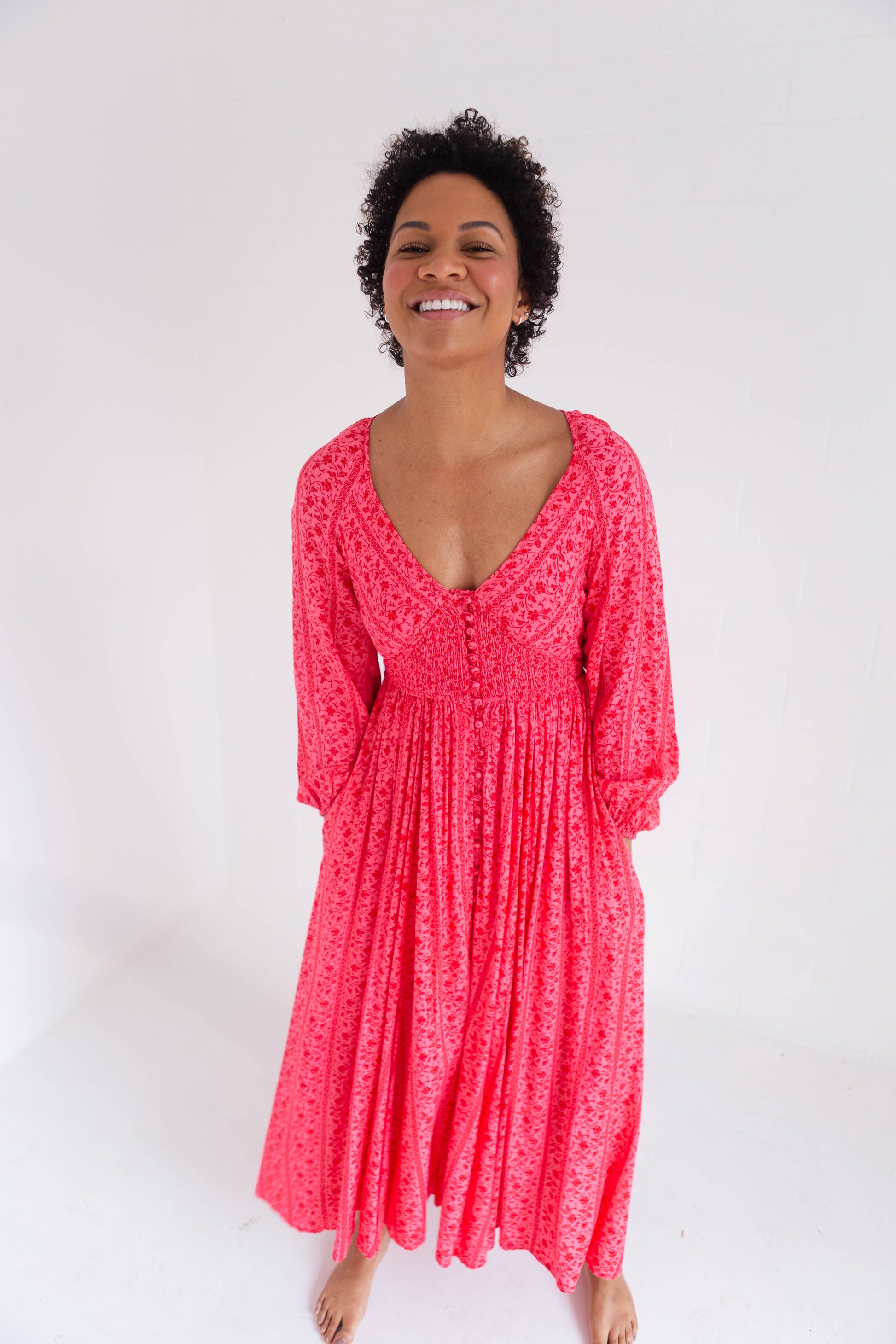 This dress is a "berry" good choice for any occasion! With long sleeves, smocked details for stretch, and pockets, it's both fashionable and functional. Plus, the v-neck adds a touch of flirty fun! Natalia is 5'7" wearing a small.