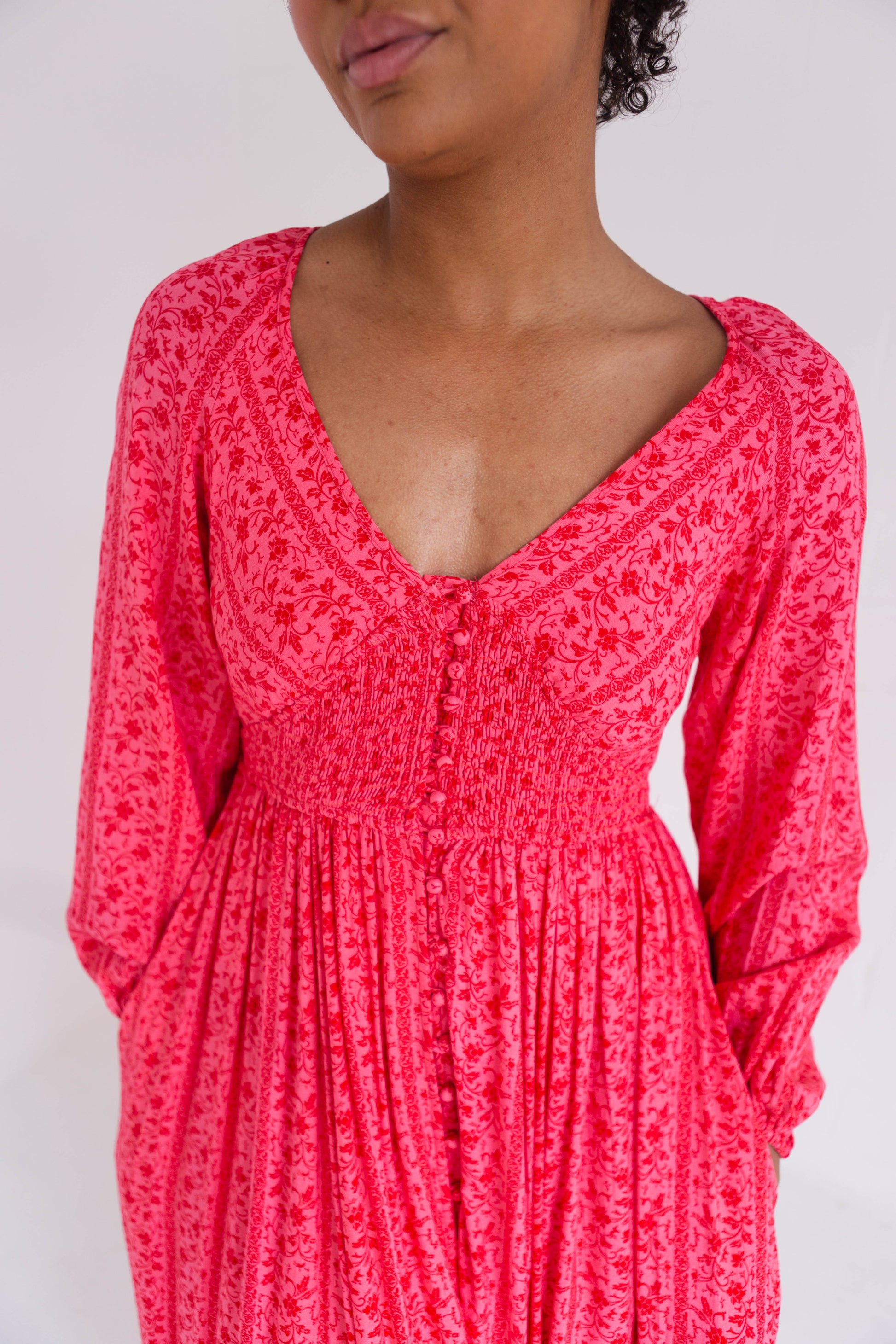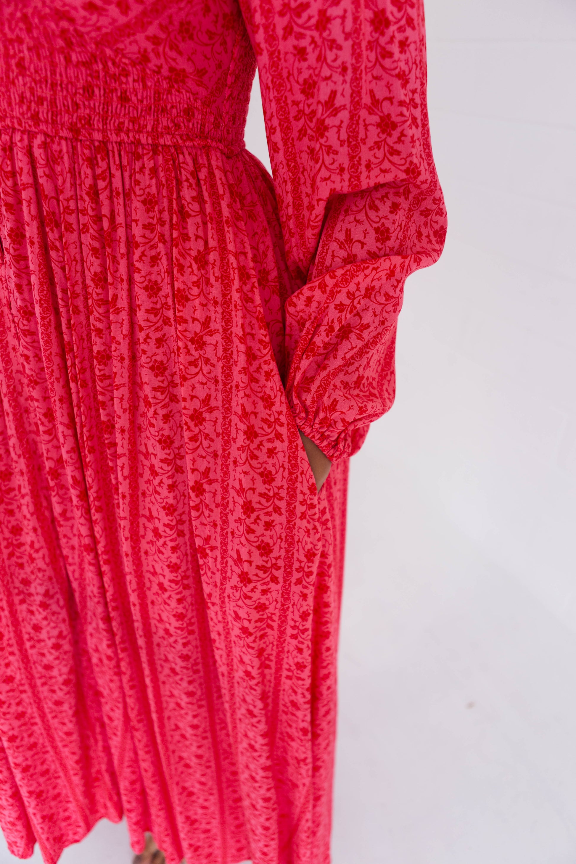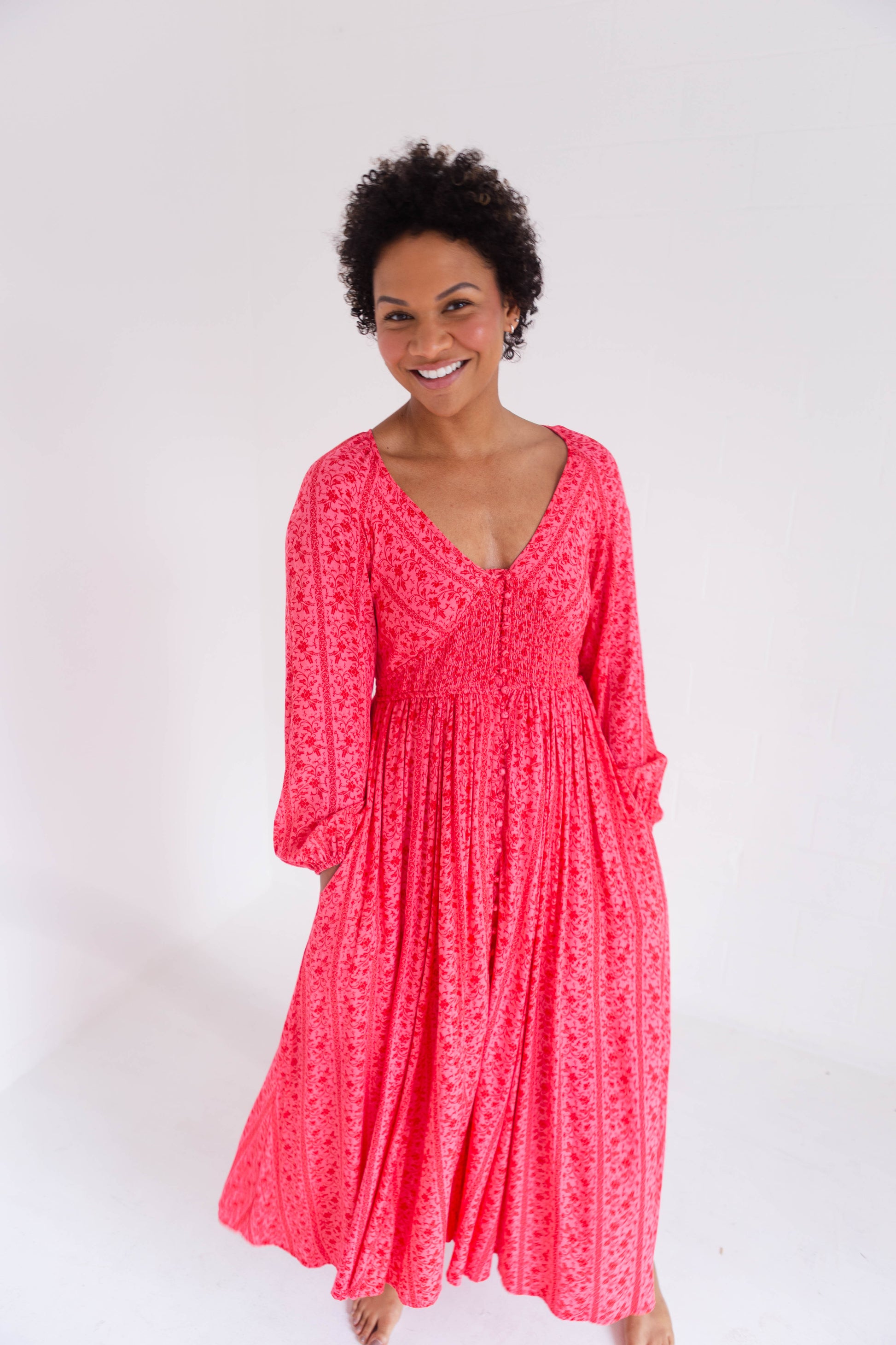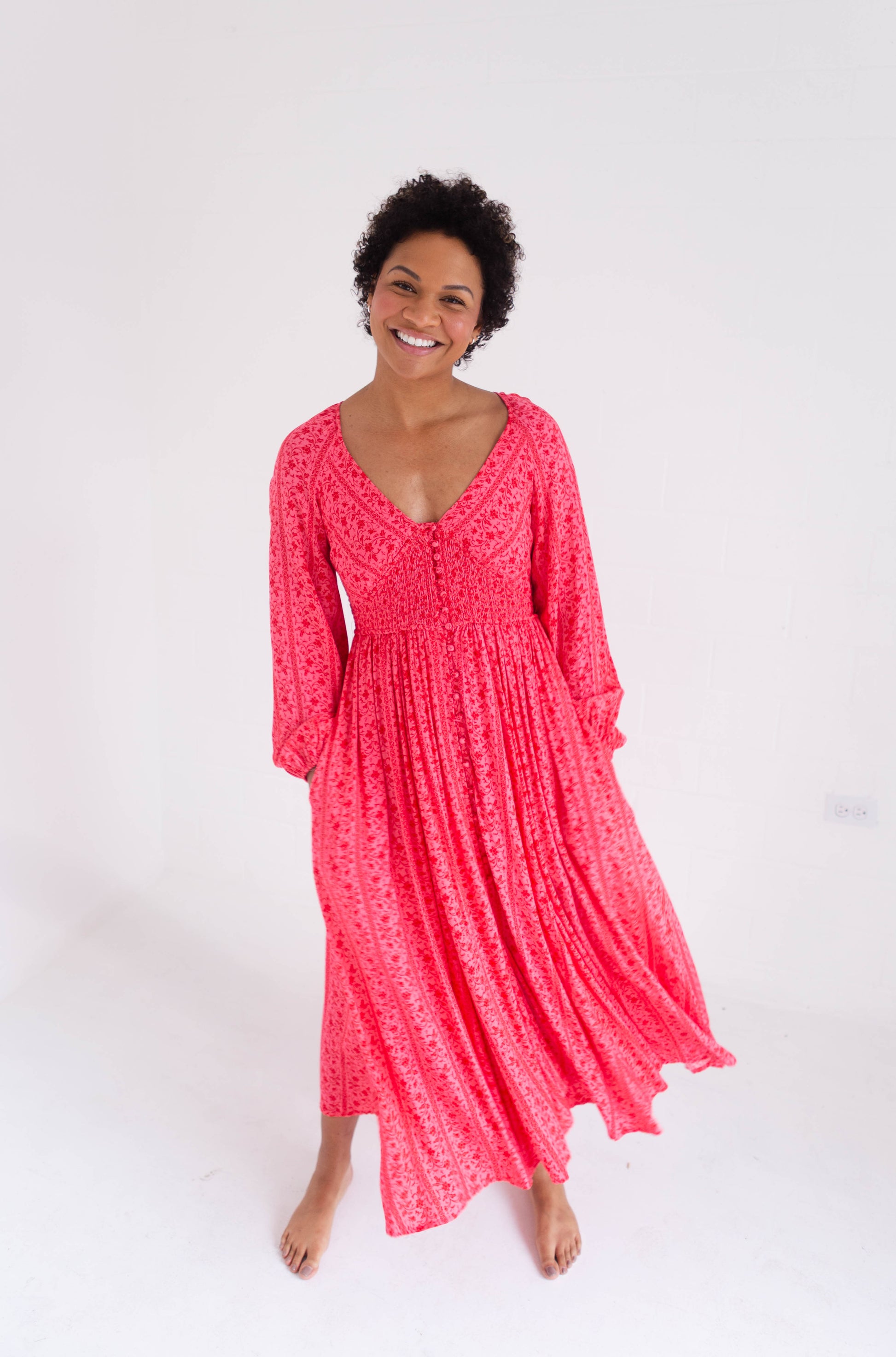 This dress is a "berry" good choice for any occasion! With long sleeves, smocked details for stretch, and pockets, it's both fashionable and functional. Plus, the v-neck adds a touch of flirty fun! Natalia is 5'7" wearing a small.