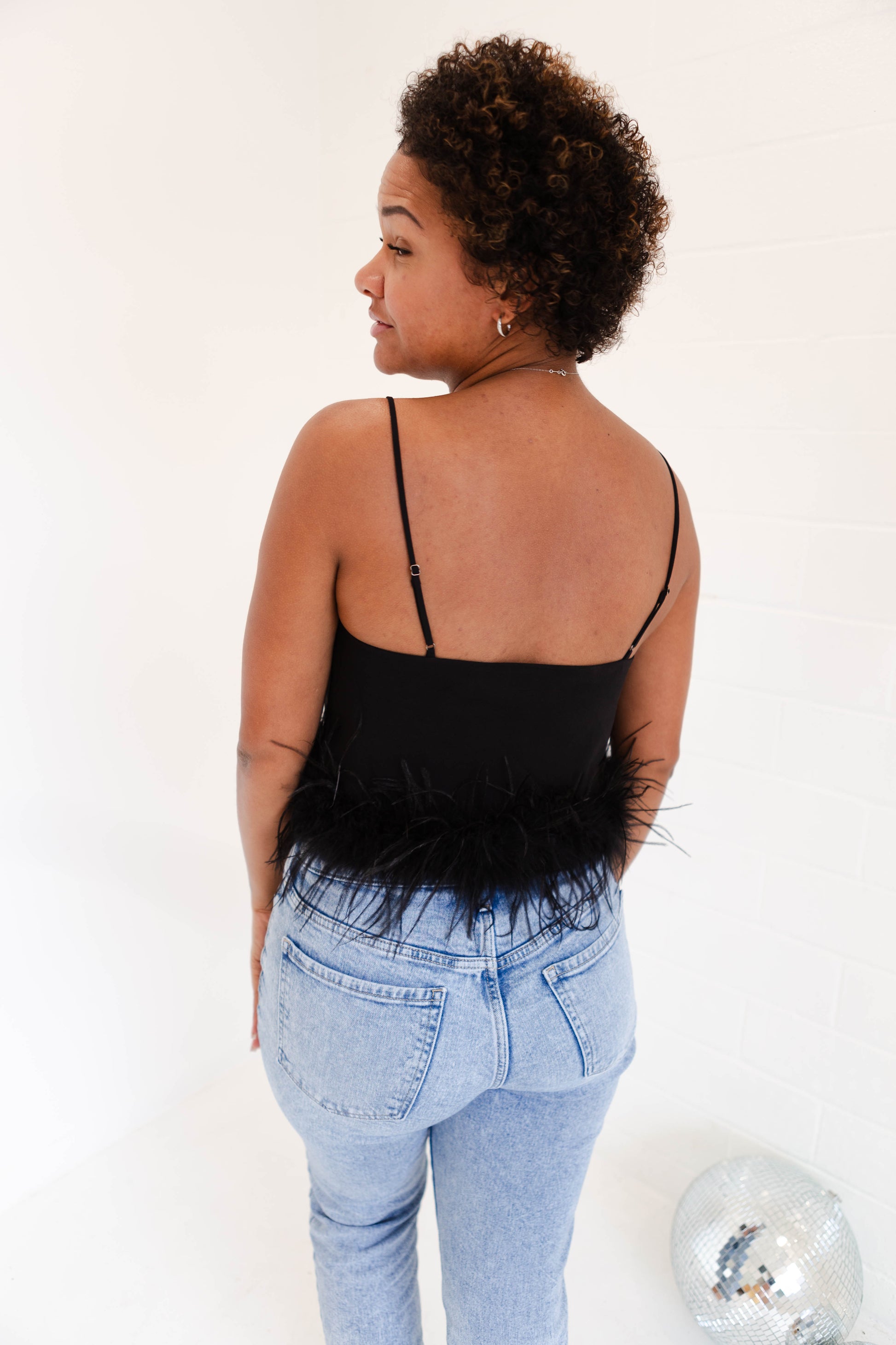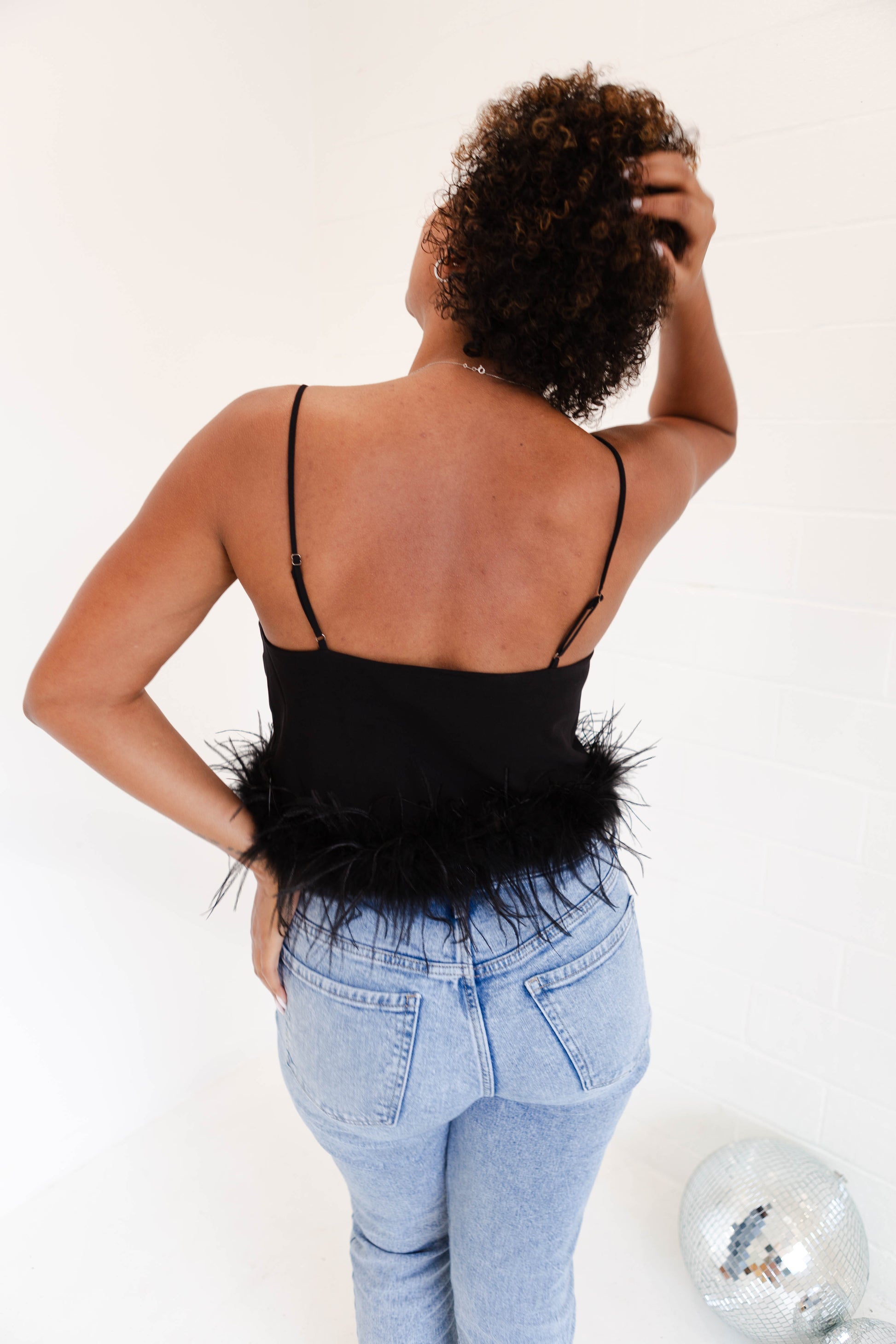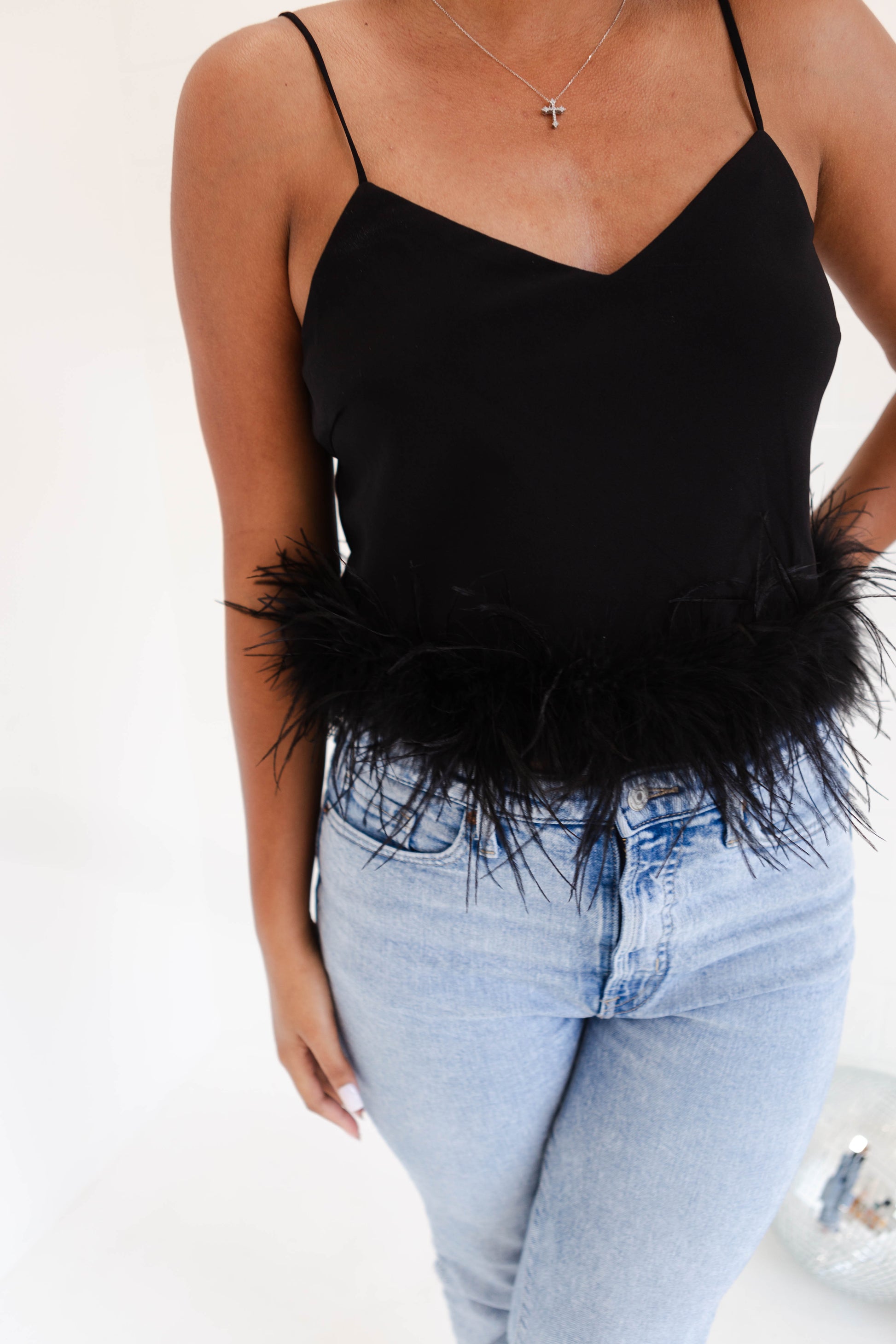 Stay cool and stylish in this silky tank top with adjustable straps. Its feather trim adds a fun touch, perfect for pairing with denim and heels for a look that will make you feel good. (Fashion tip: keep your cool with this feather top, just add denim and heels!)