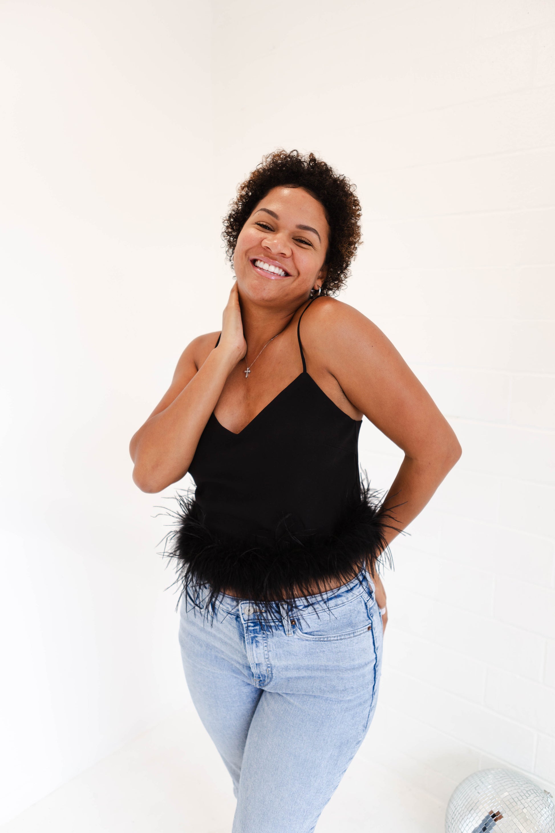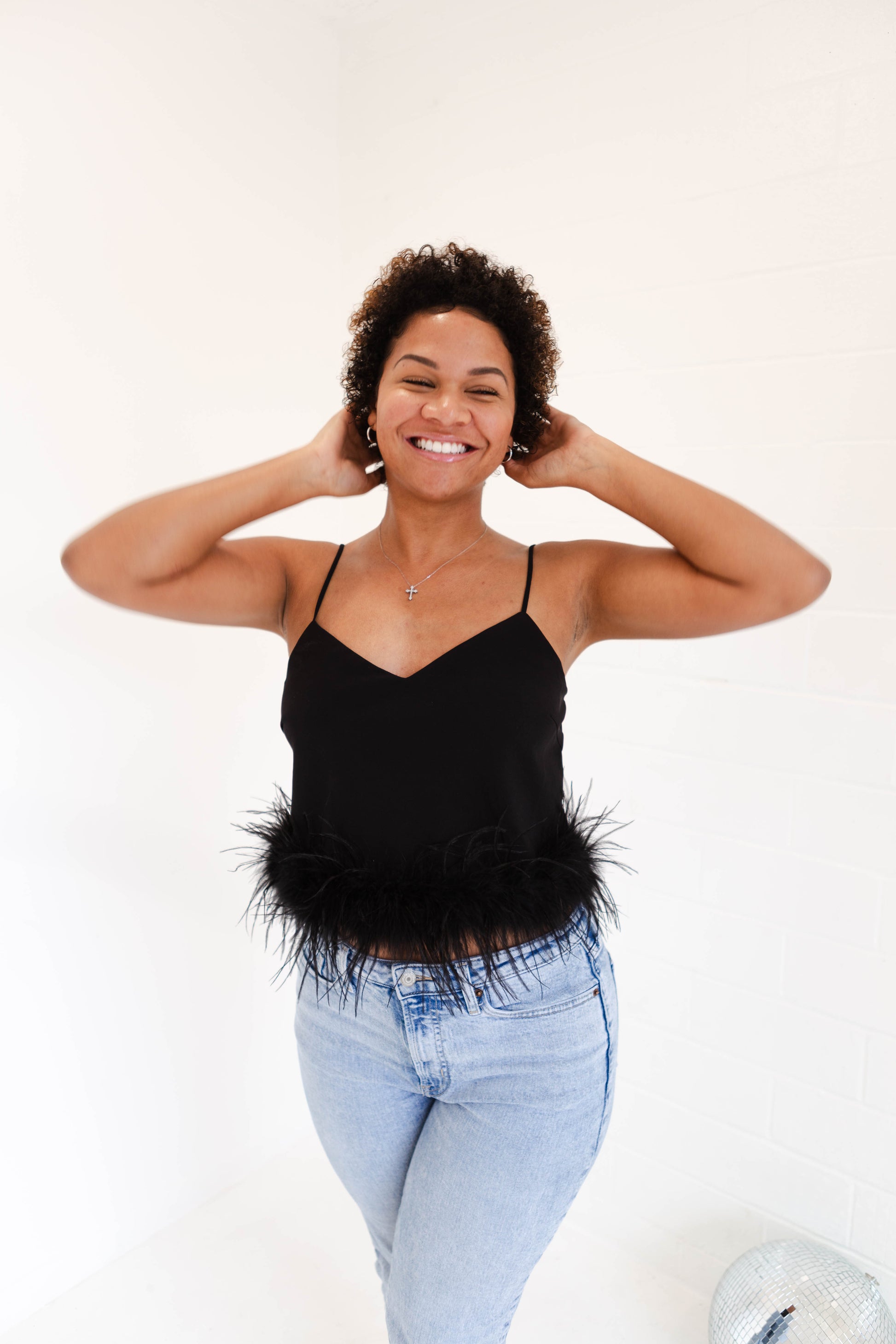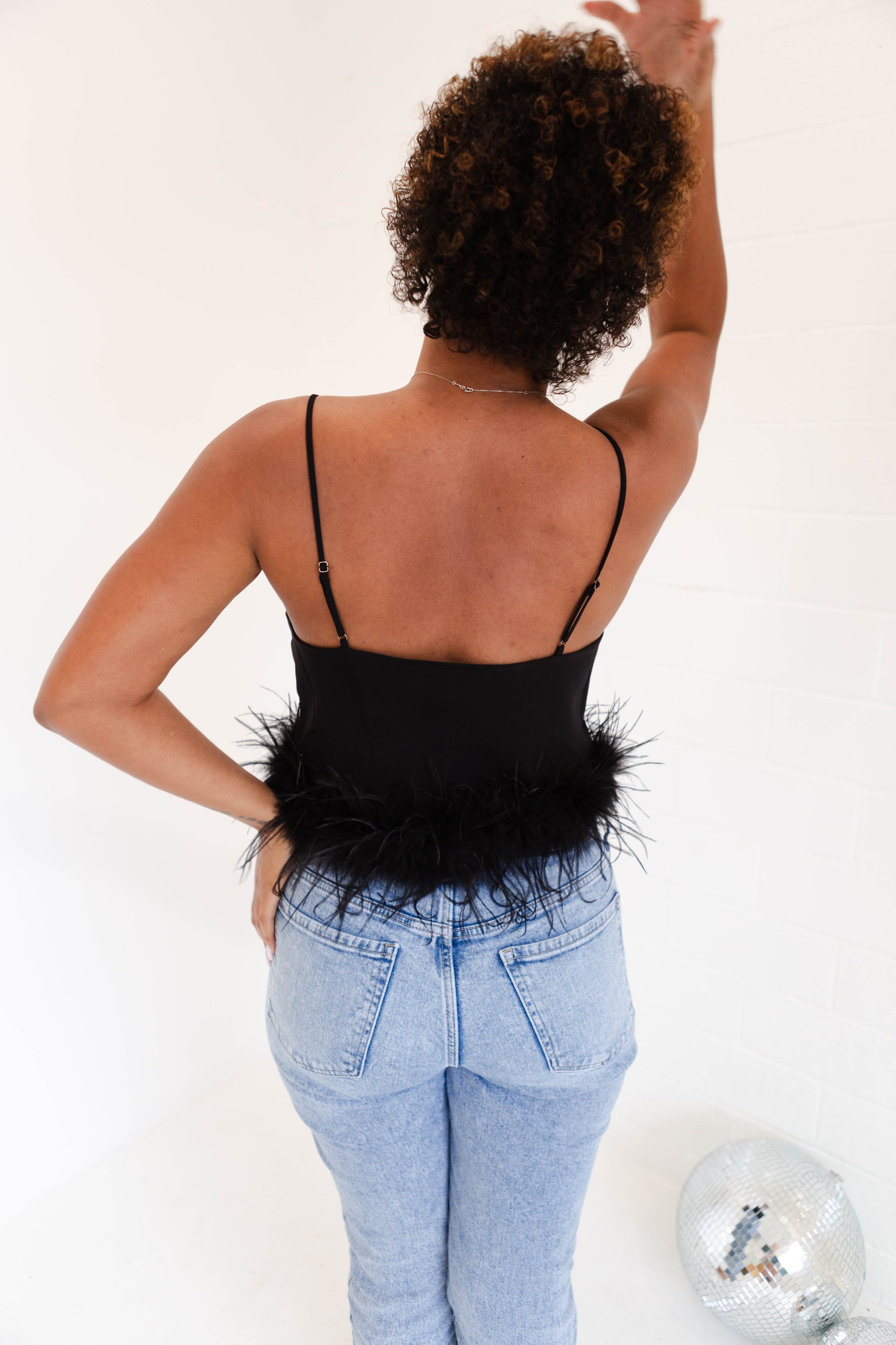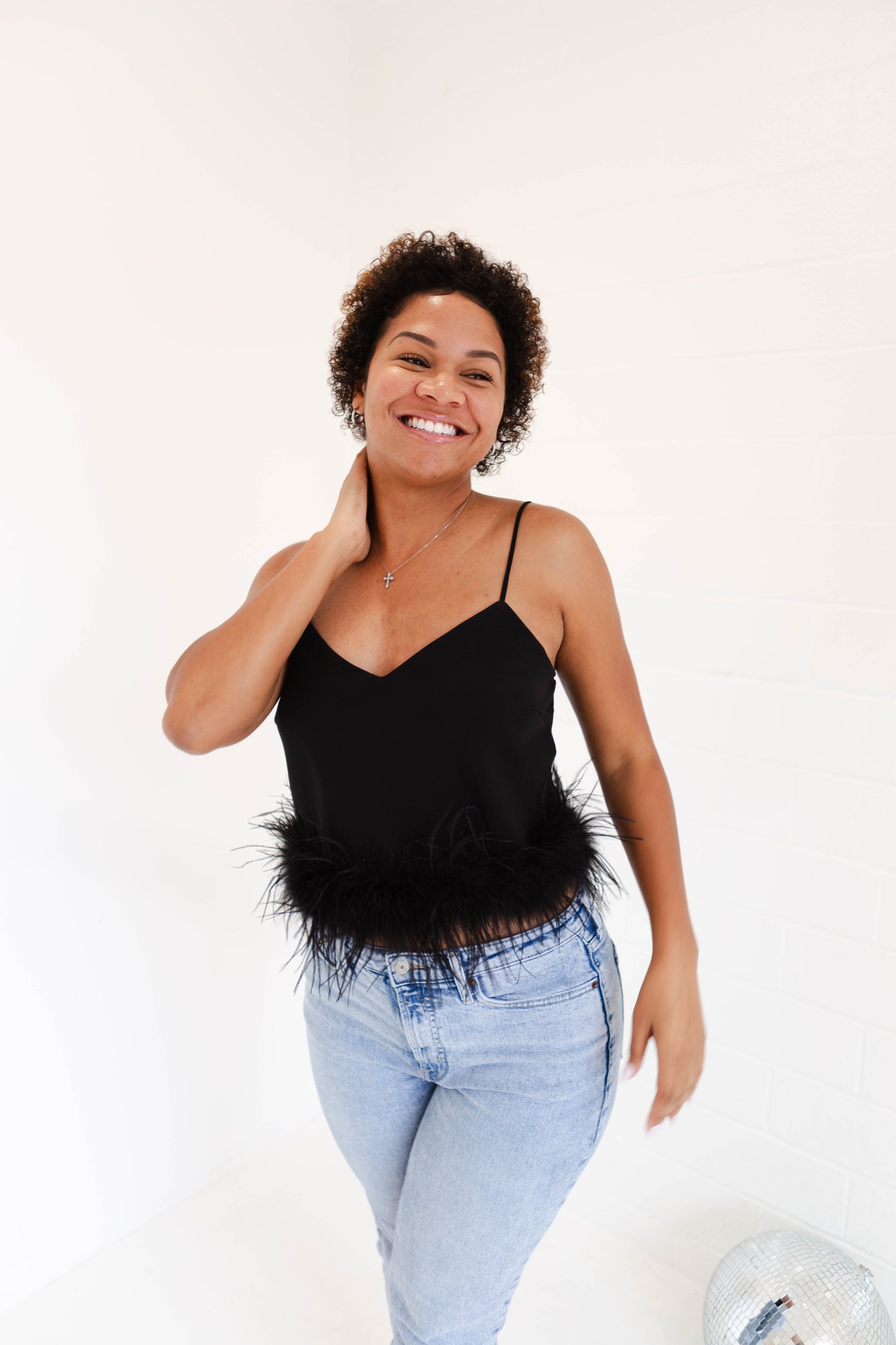Stay cool and stylish in this silky tank top with adjustable straps. Its feather trim adds a fun touch, perfect for pairing with denim and heels for a look that will make you feel good. (Fashion tip: keep your cool with this feather top, just add denim and heels!)