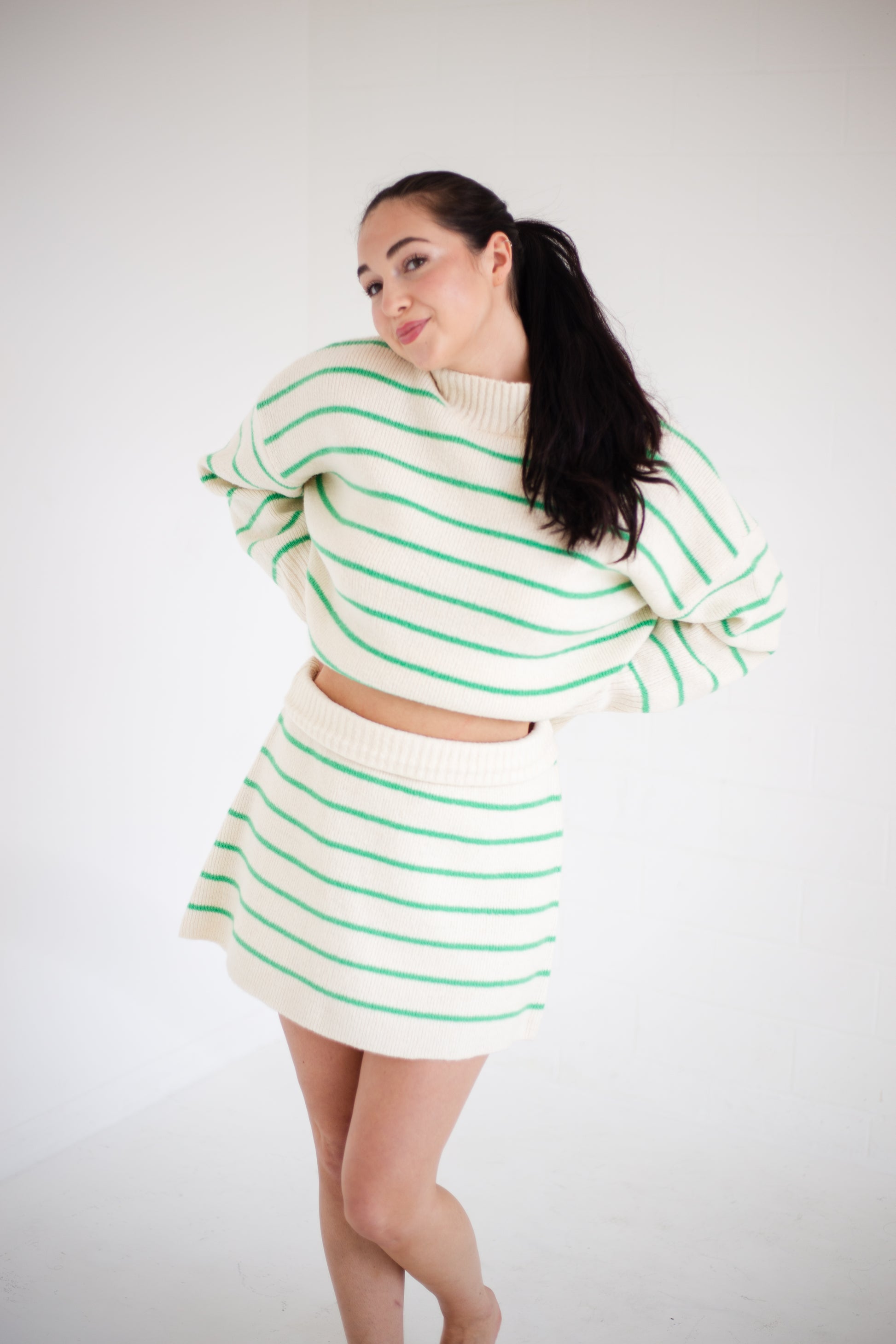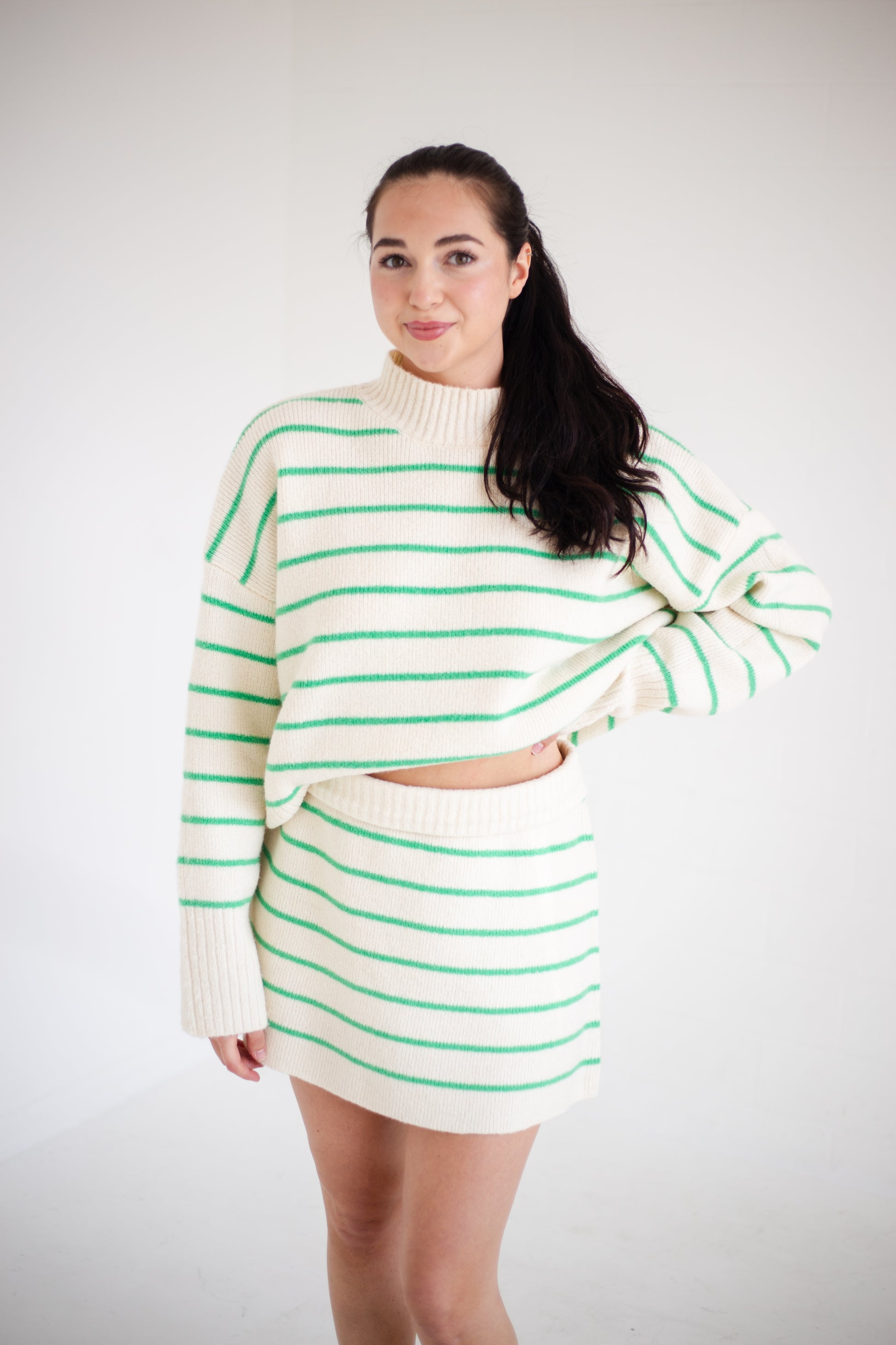Stay comfy and stylish this holiday season with our Cream & Green Striped Sweater Set. The stretchy and elastic waistband ensures the perfect fit, while the mock neck sweater adds a touch of girly fun. Perfect for Christmas celebrations or everyday wear. KK is 5'5" wearing the small.