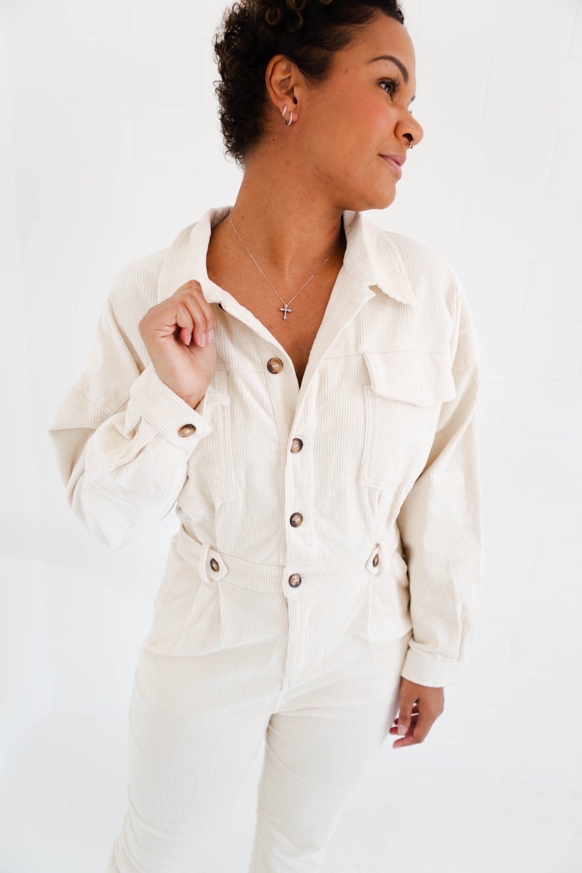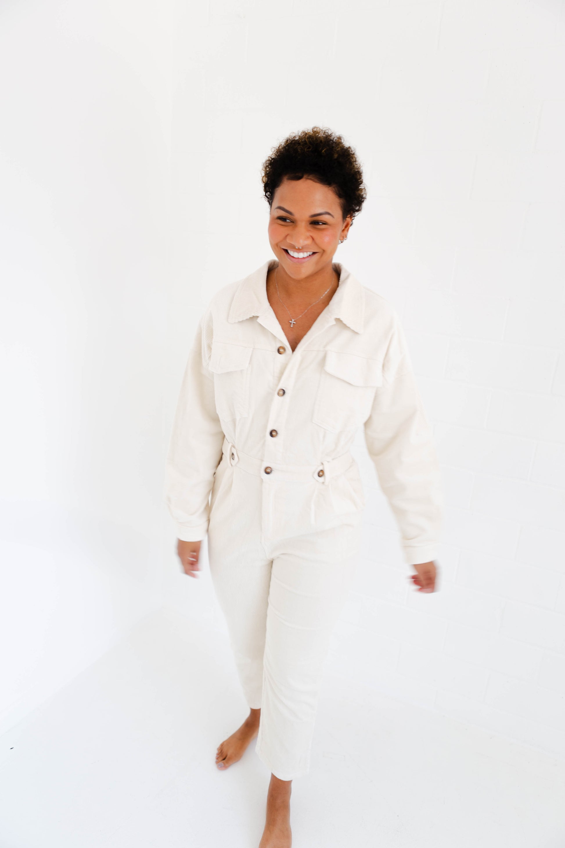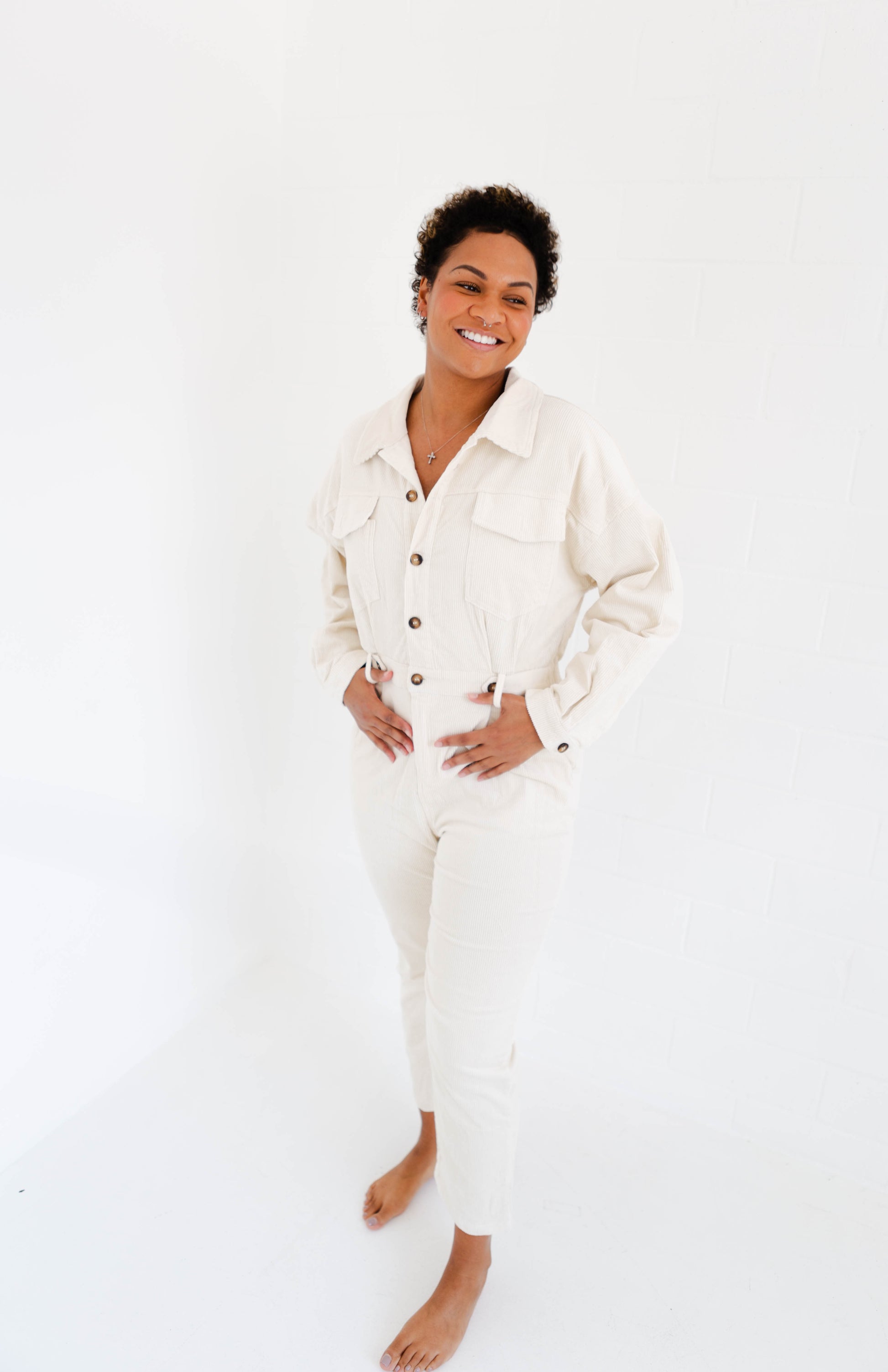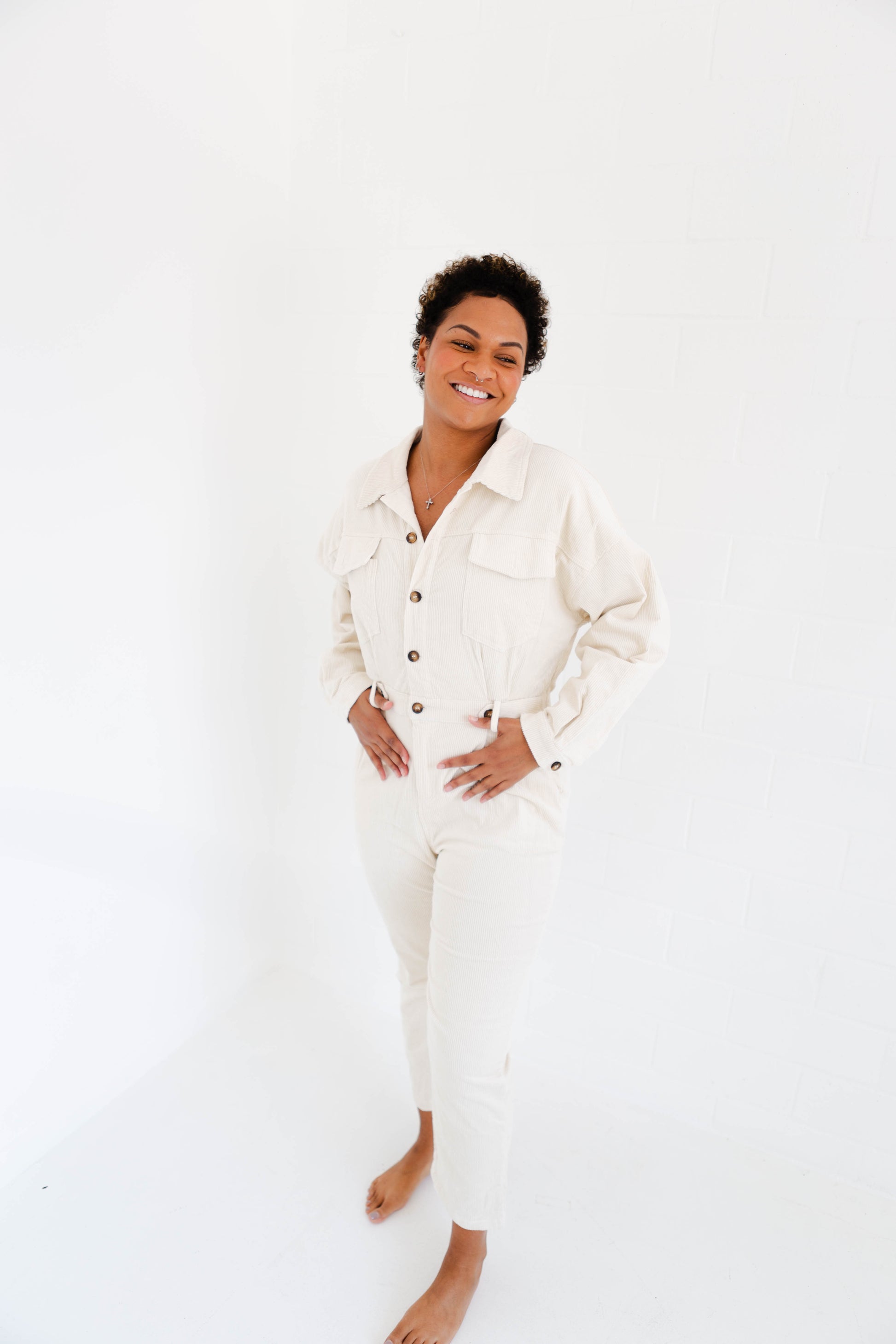Get ready to jump into fashion with our Cream Utility Jumpsuit! With a button-up design, tapered legs, and pockets for convenience, this versatile jumpsuit also features an elastic belt in the back for a comfortable fit. Perfect for any occasion, this jumpsuit is a must-have addition to your wardrobe. Natalia is 5'8" wearing the medium.