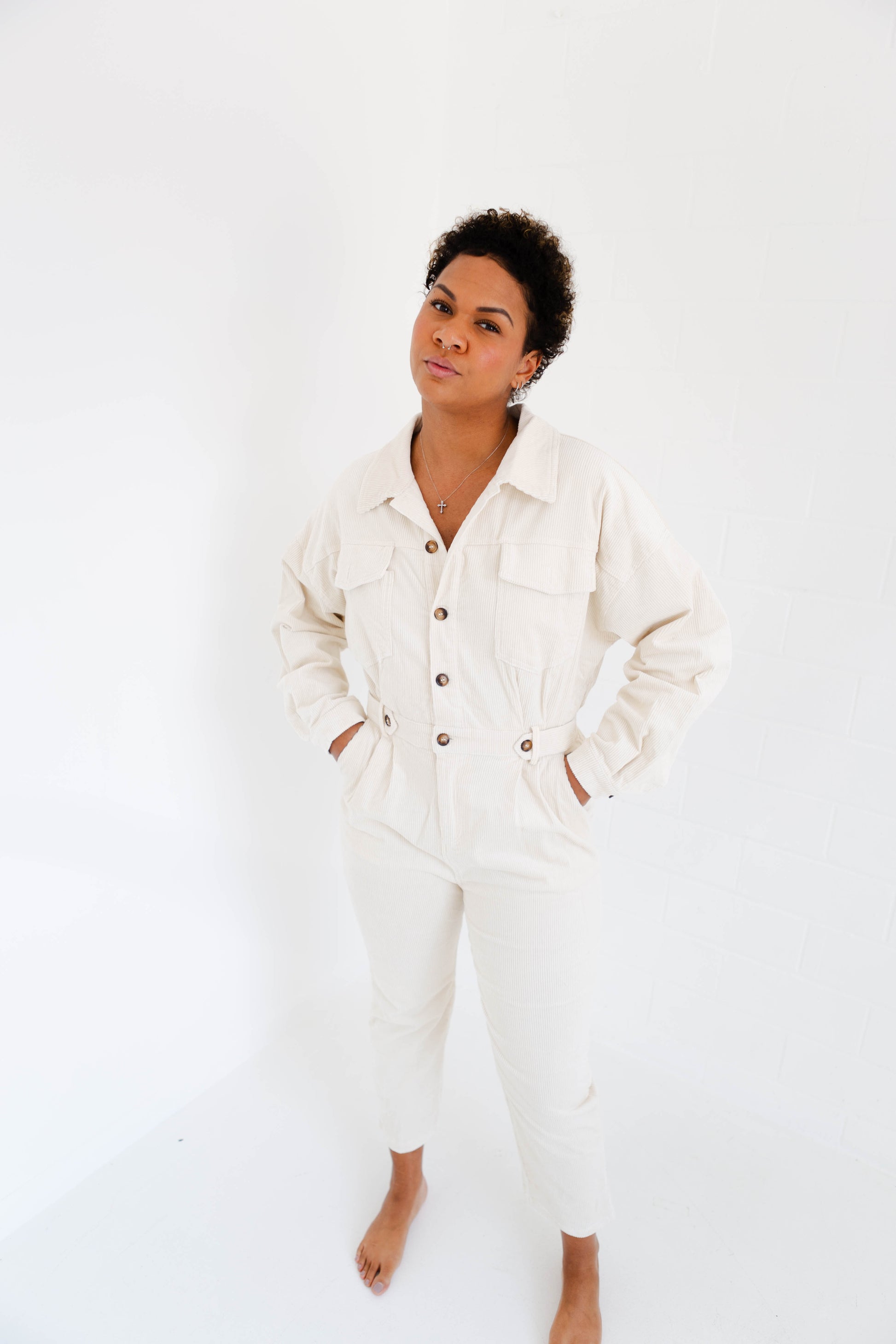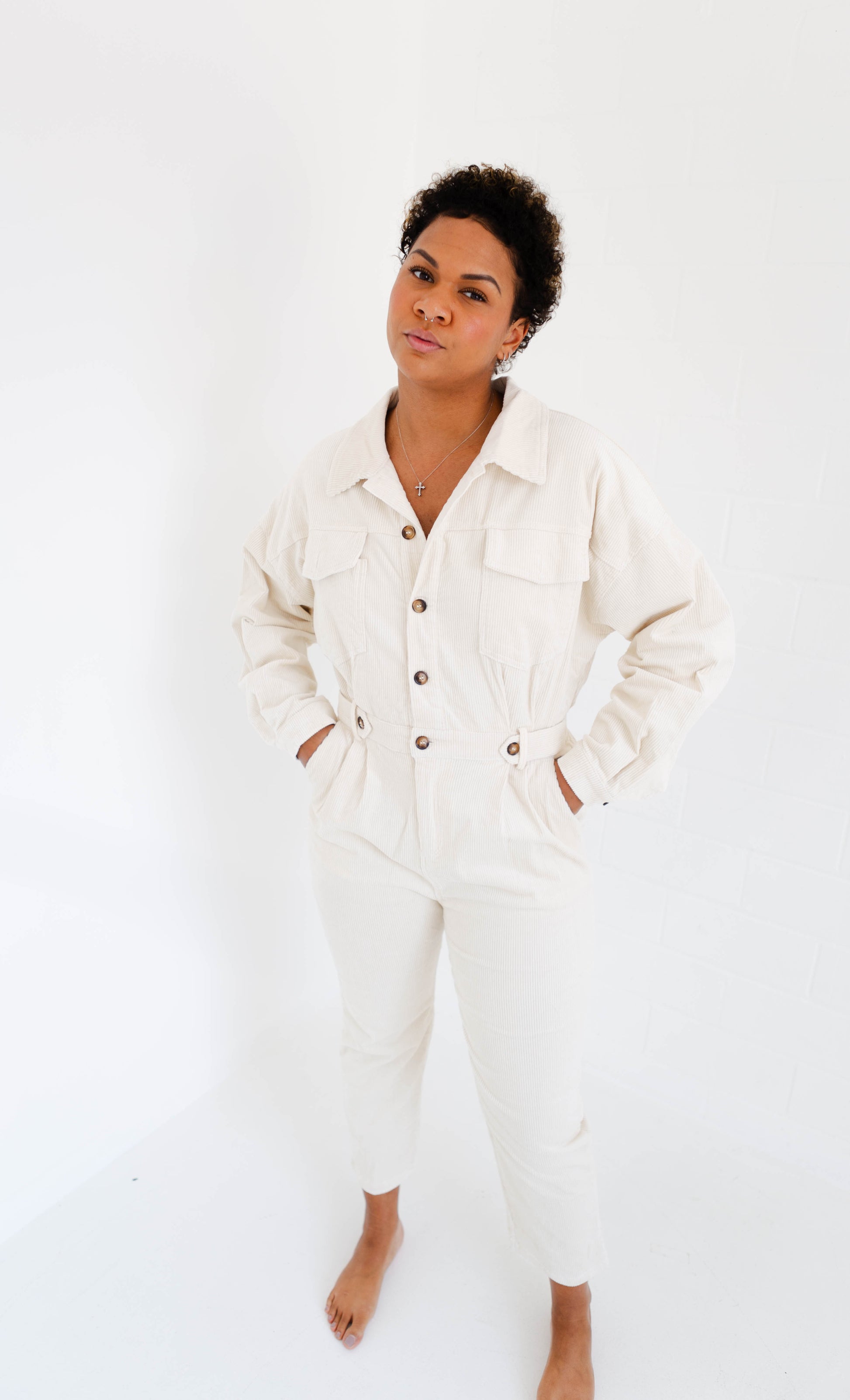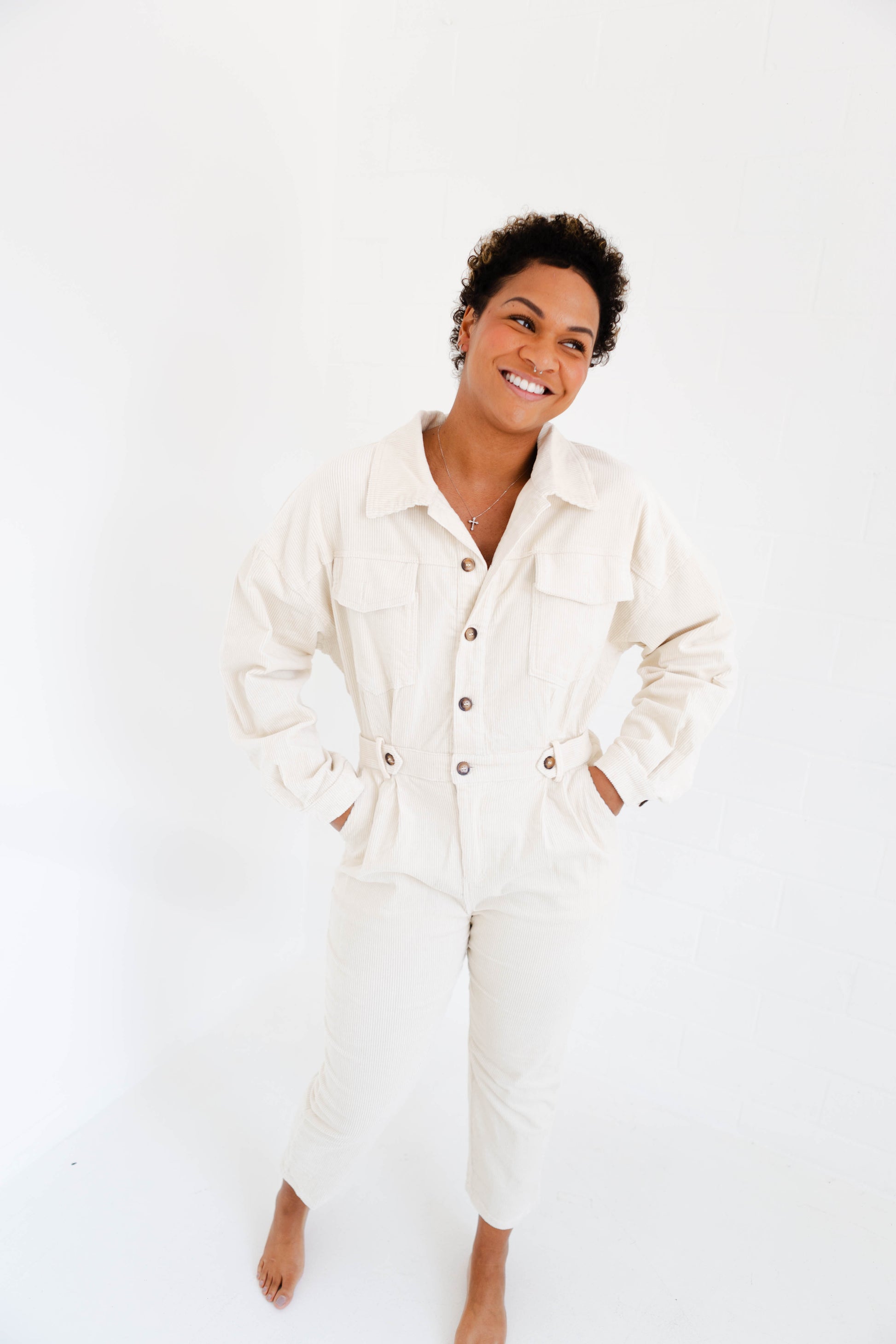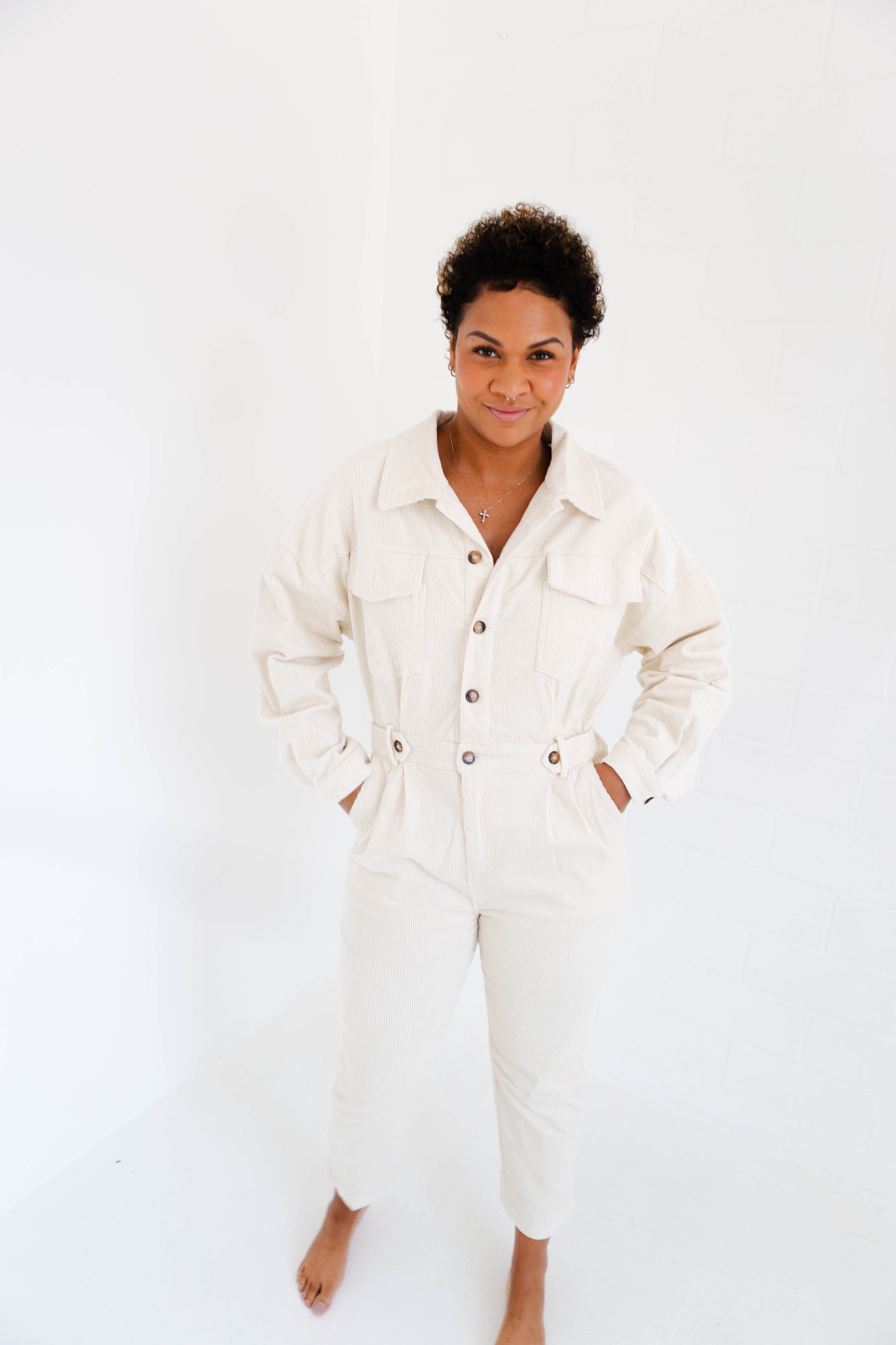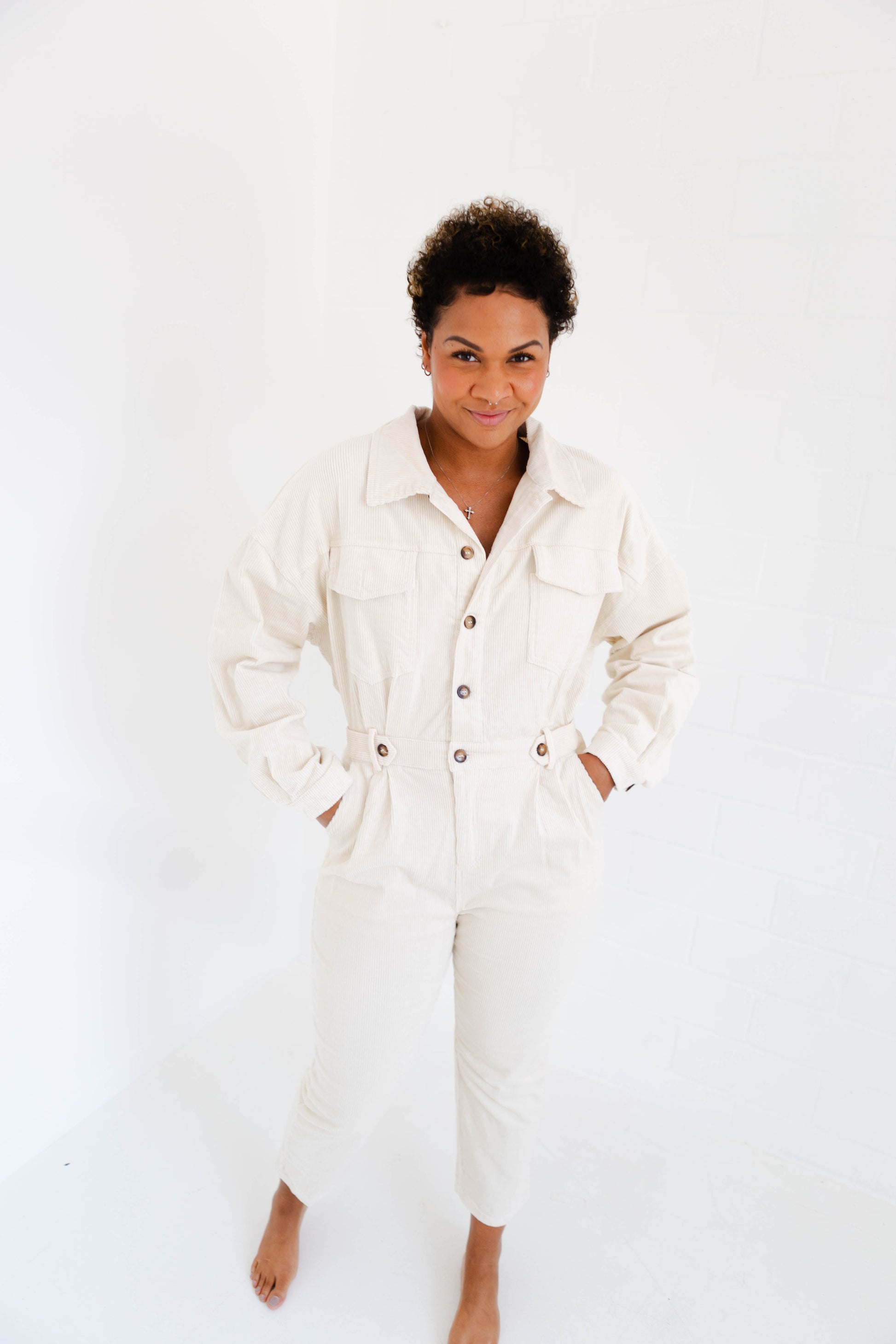 Get ready to jump into fashion with our Cream Utility Jumpsuit! With a button-up design, tapered legs, and pockets for convenience, this versatile jumpsuit also features an elastic belt in the back for a comfortable fit. Perfect for any occasion, this jumpsuit is a must-have addition to your wardrobe. Natalia is 5'8" wearing the medium.