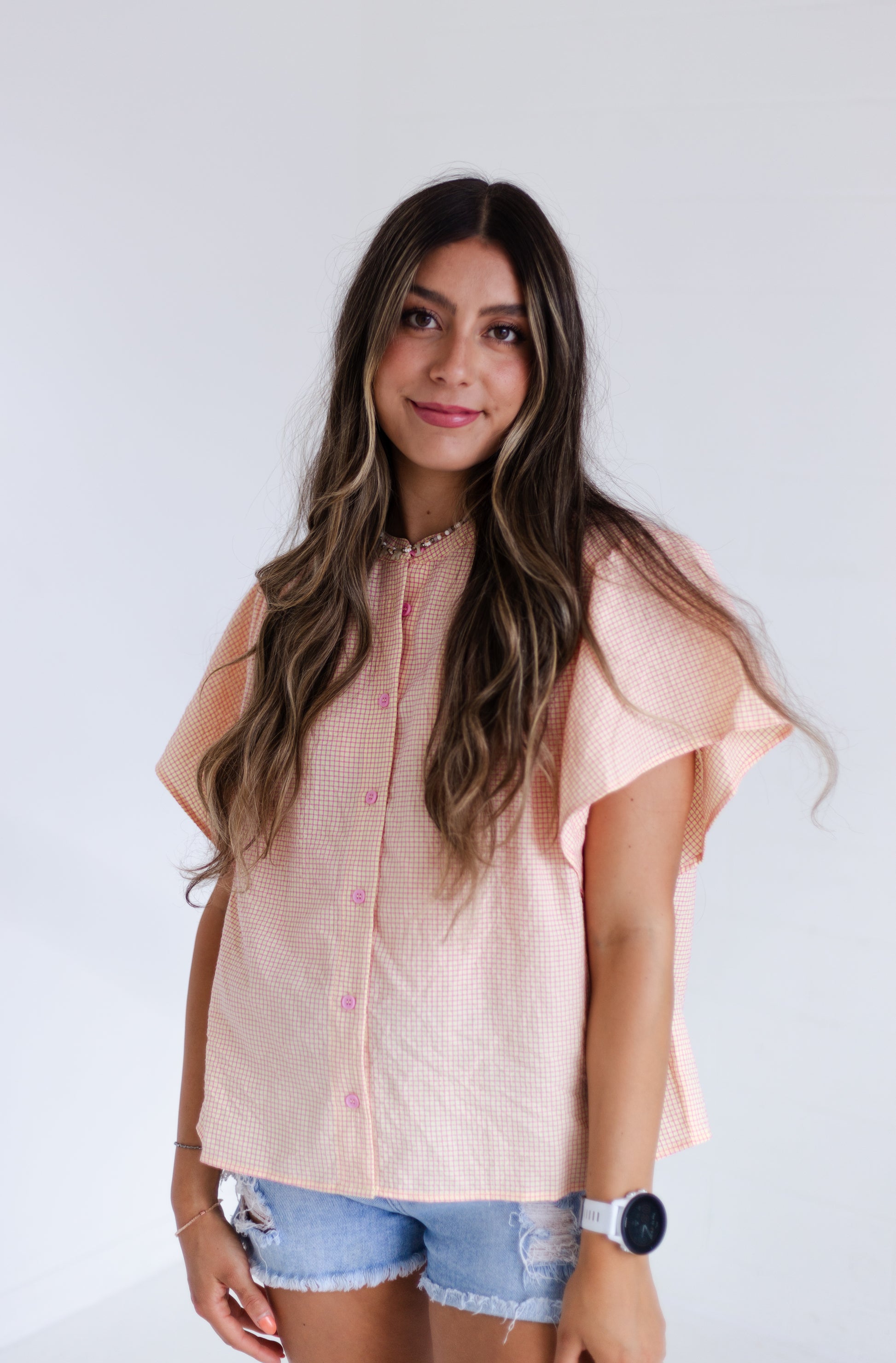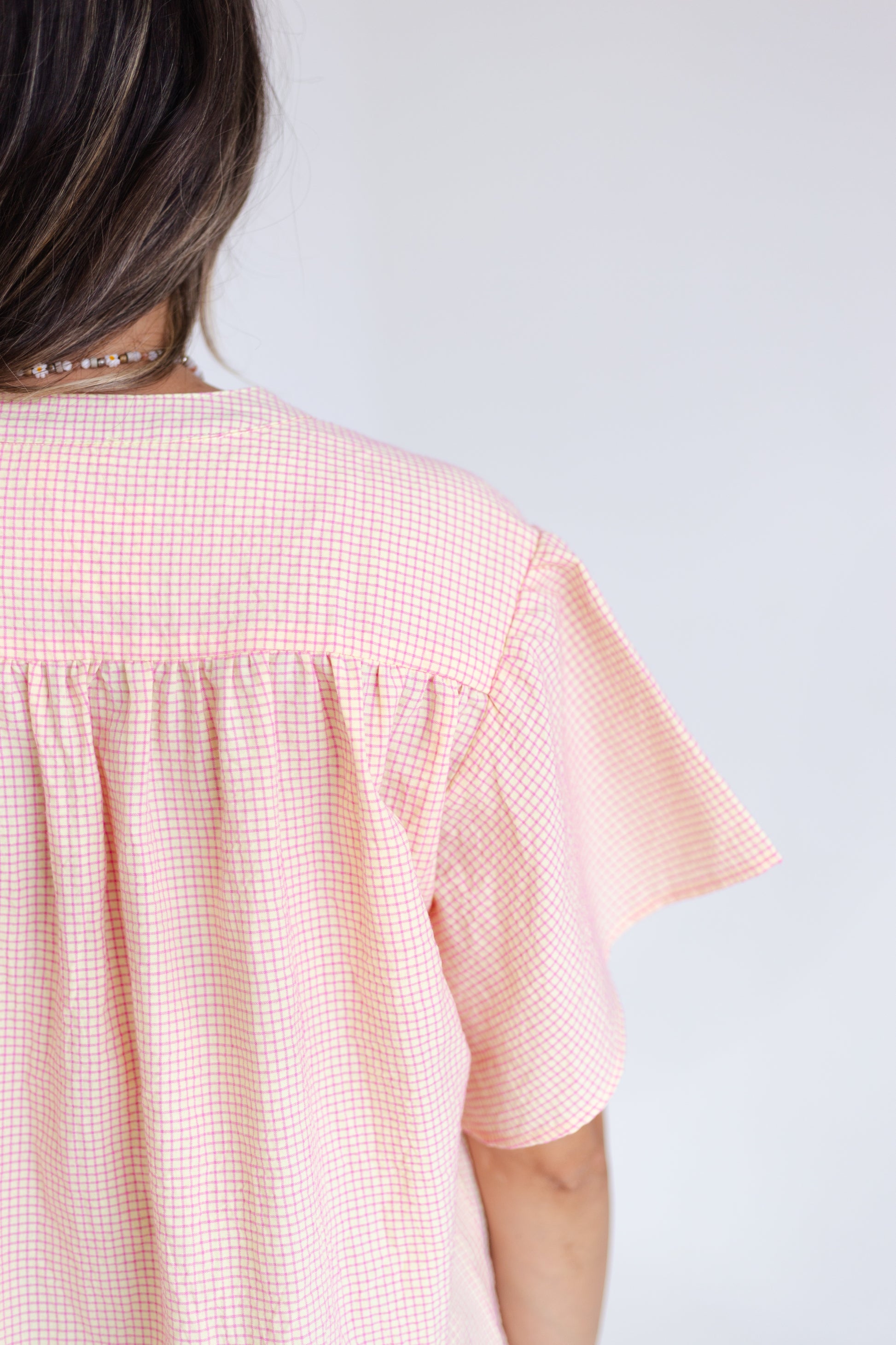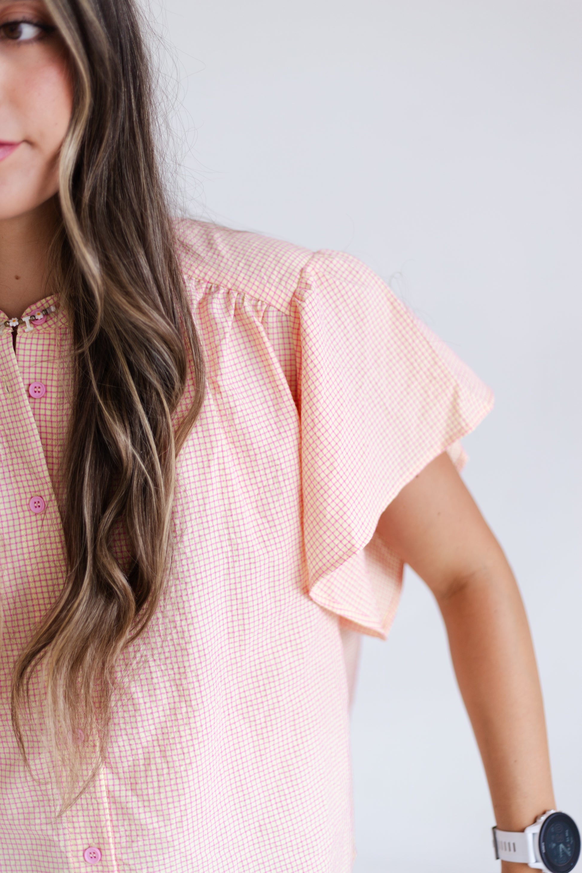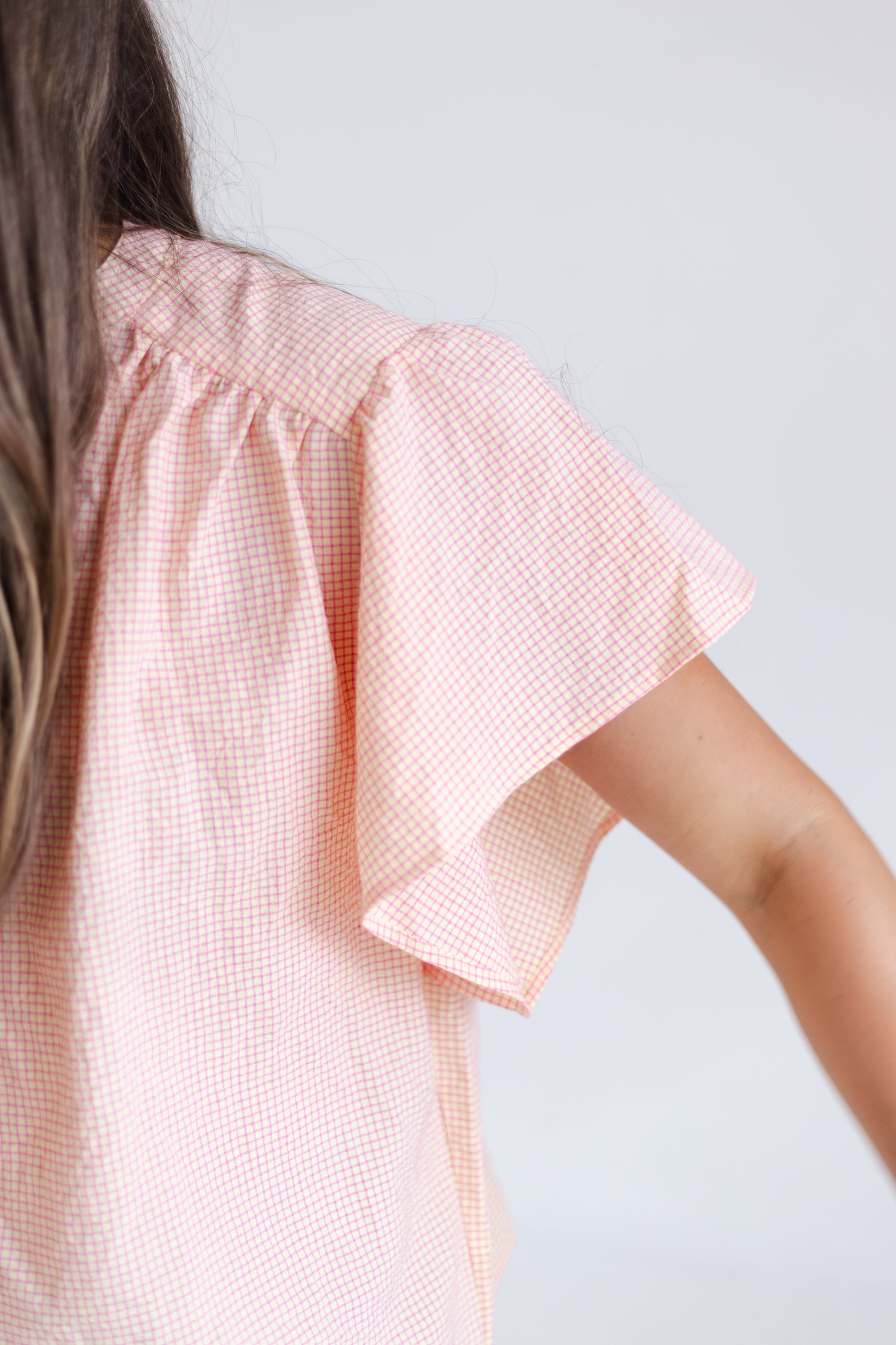 Add a pop of playful color to your wardrobe with the Daisy Pink Flutter Sleeve Blouse. Made from a vibrant gingham print, this blouse is perfect for adding a touch of fun to any outfit. Its flutter sleeves add a whimsical touch while keeping you cool and comfortable.