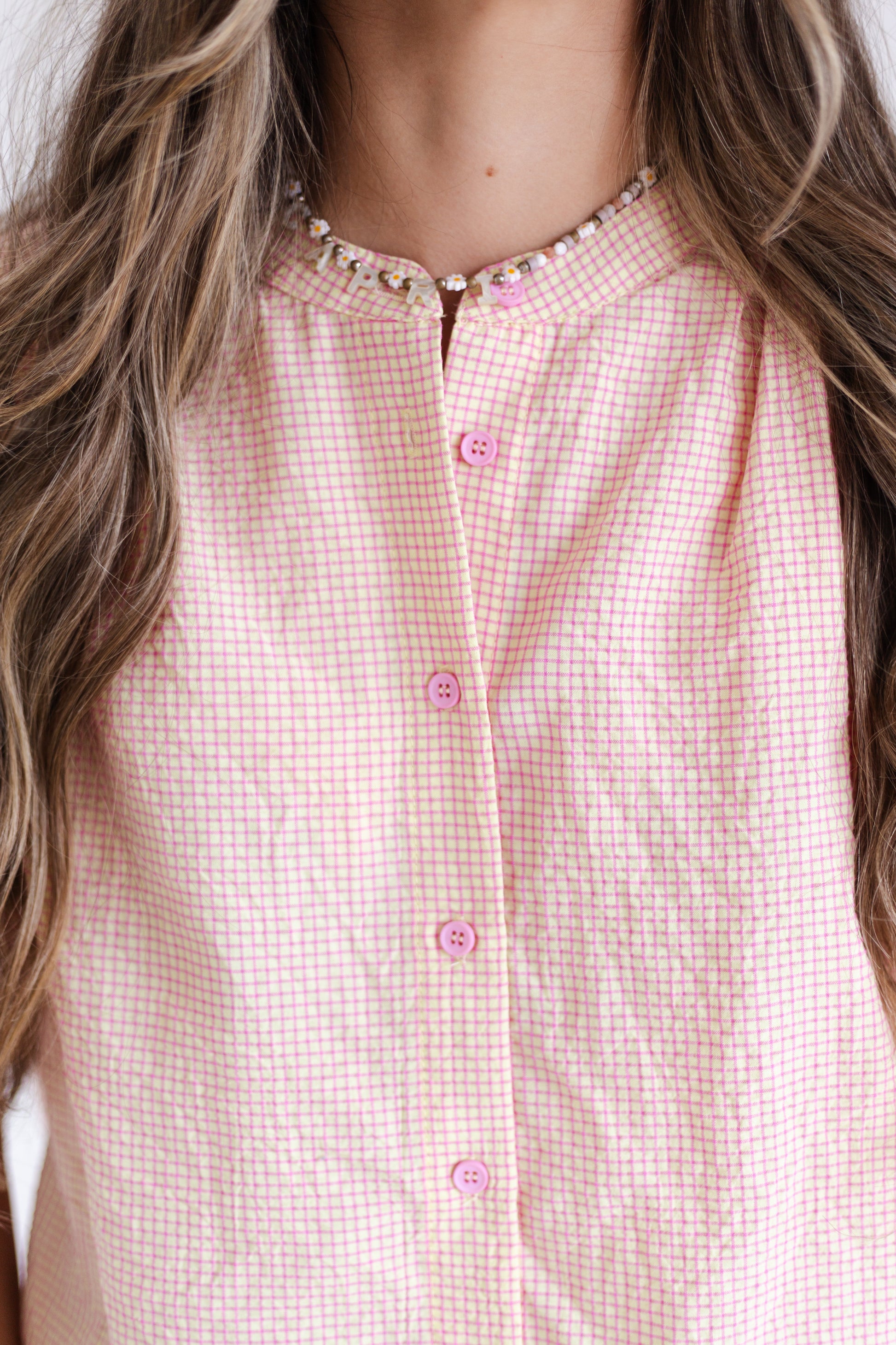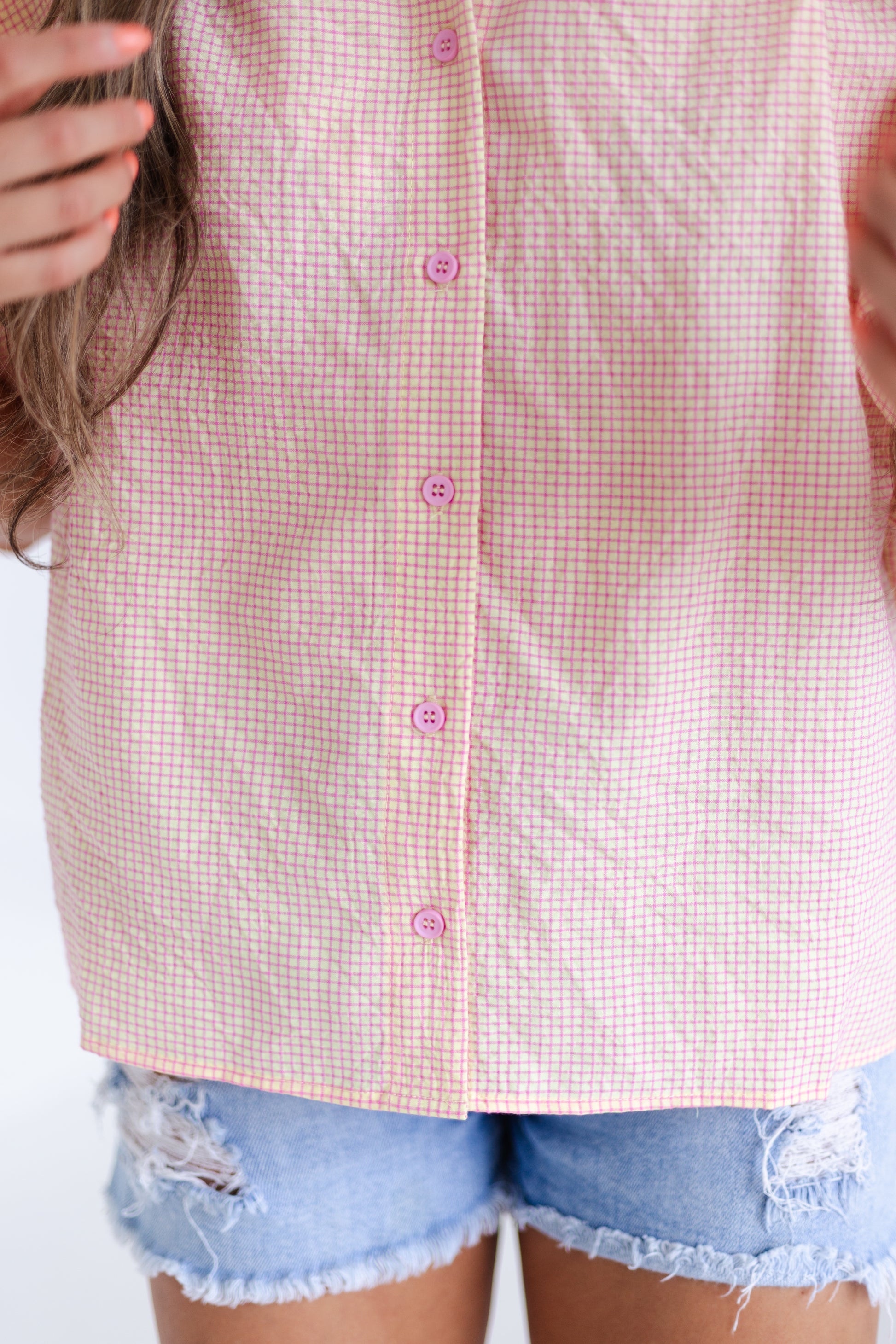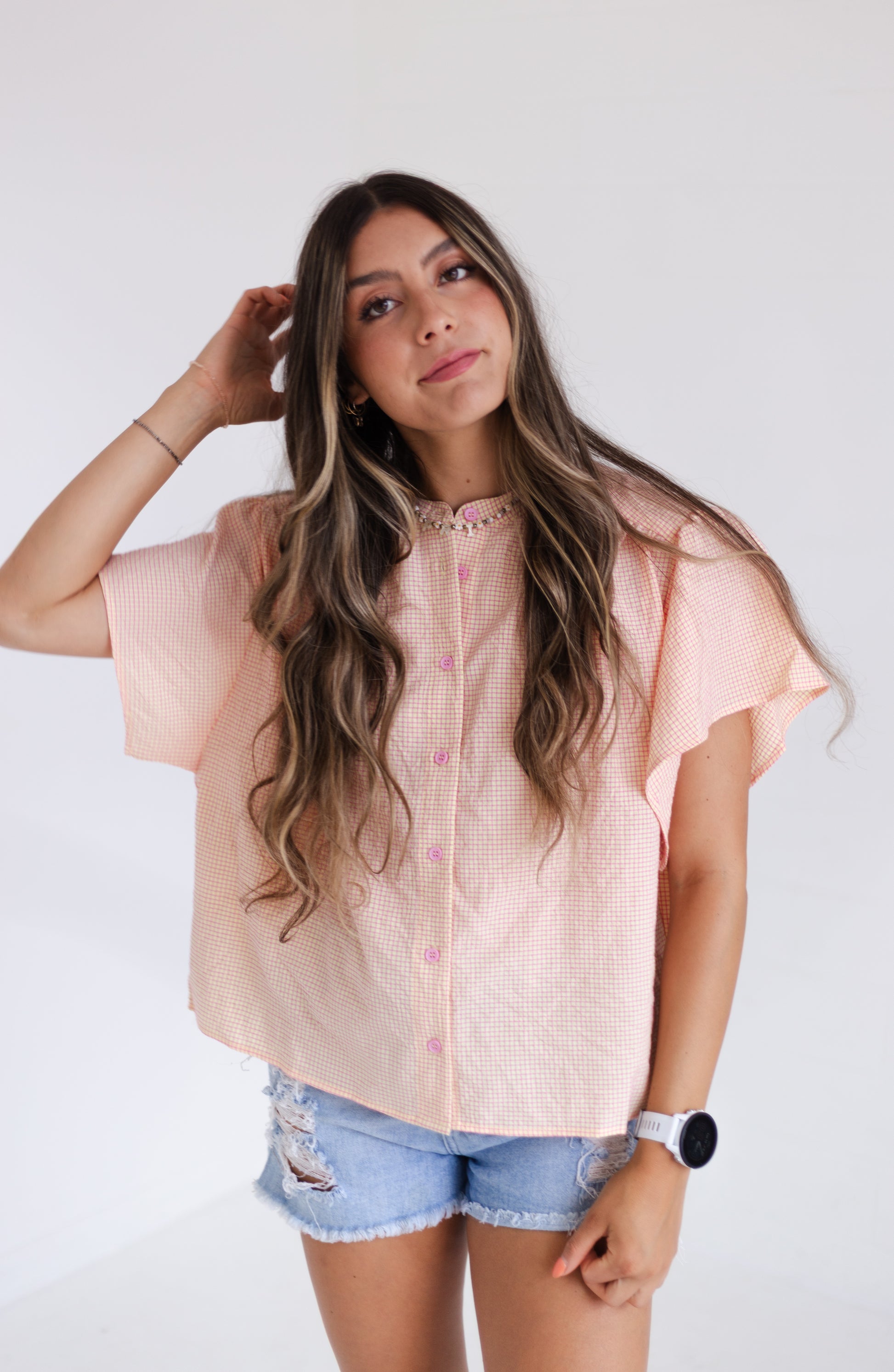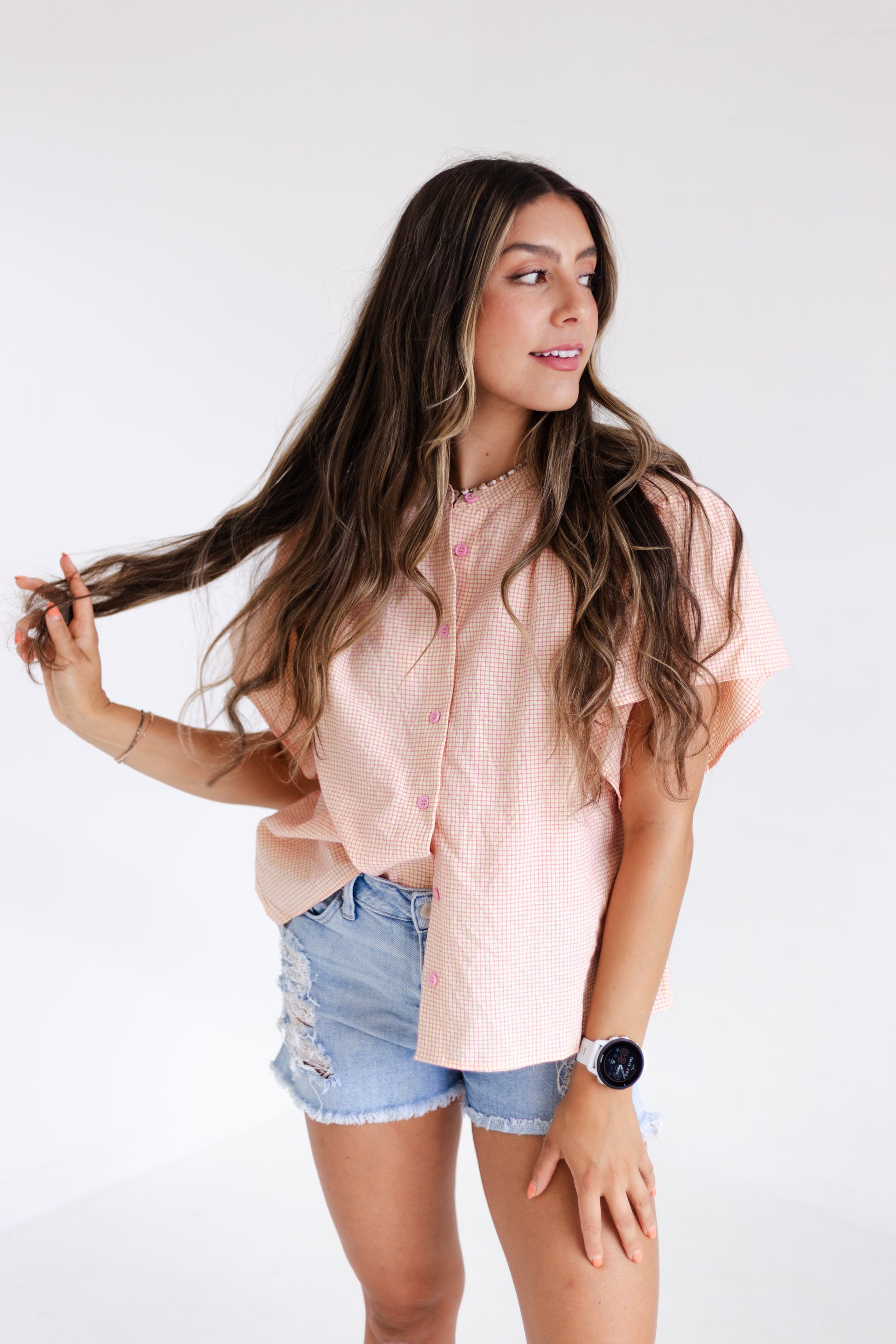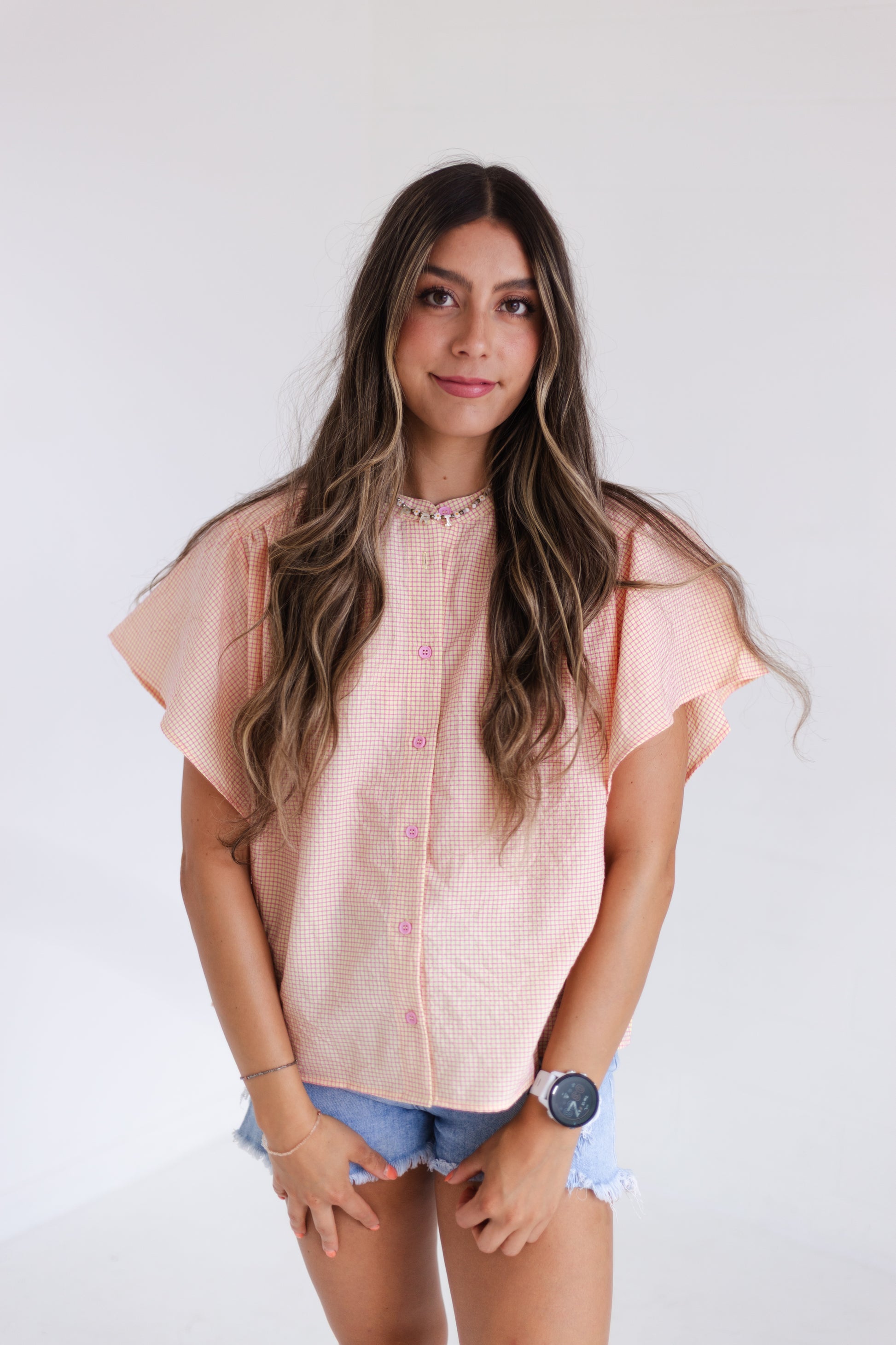 Add a pop of playful color to your wardrobe with the Daisy Pink Flutter Sleeve Blouse. Made from a vibrant gingham print, this blouse is perfect for adding a touch of fun to any outfit. Its flutter sleeves add a whimsical touch while keeping you cool and comfortable.