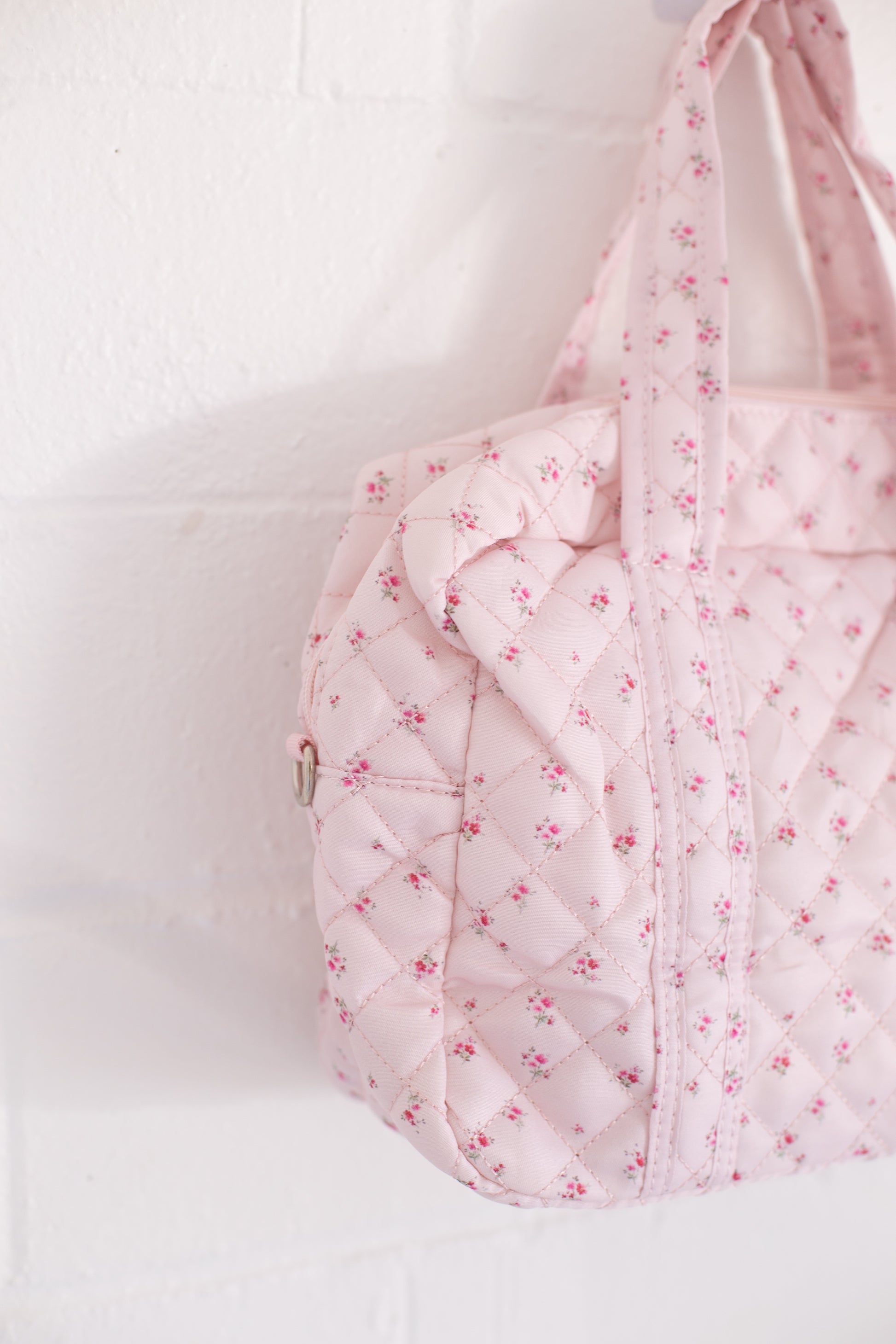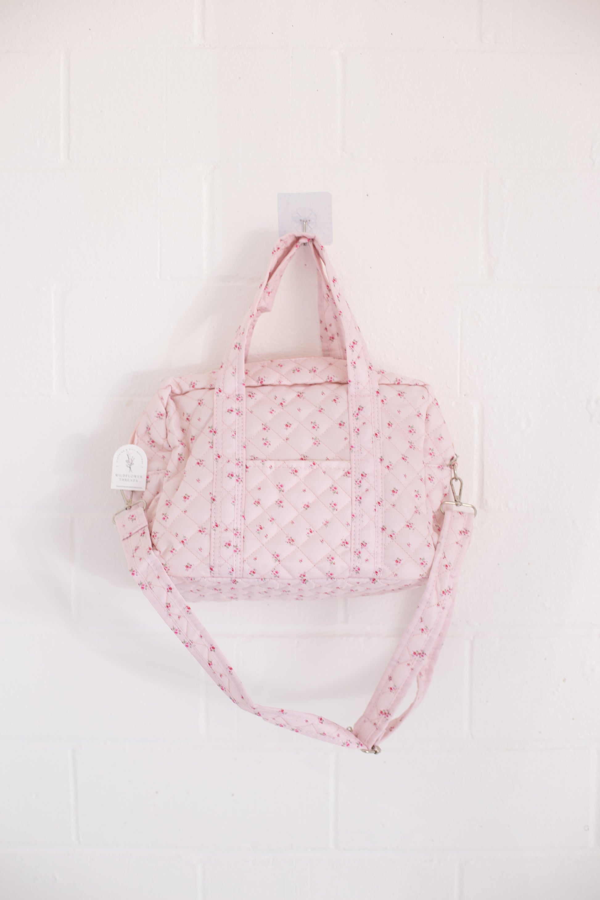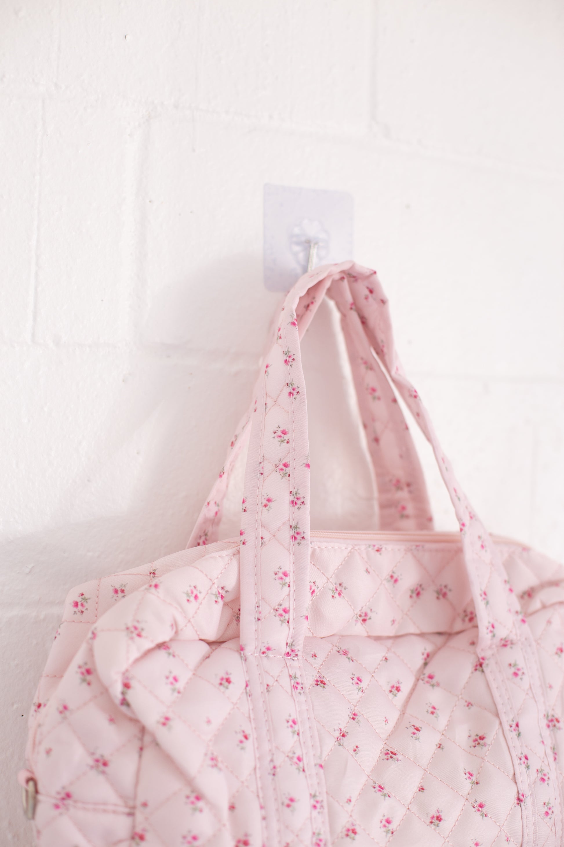 ntroducing the Dakota Baby Pink Floral Weekender Bag. With a stylish baby pink color and chic floral design, this bag is perfect for weekend getaways, travel, and even doubles as a trendy diaper bag. Upgrade your packing game and make a statement with this must-have weekender.