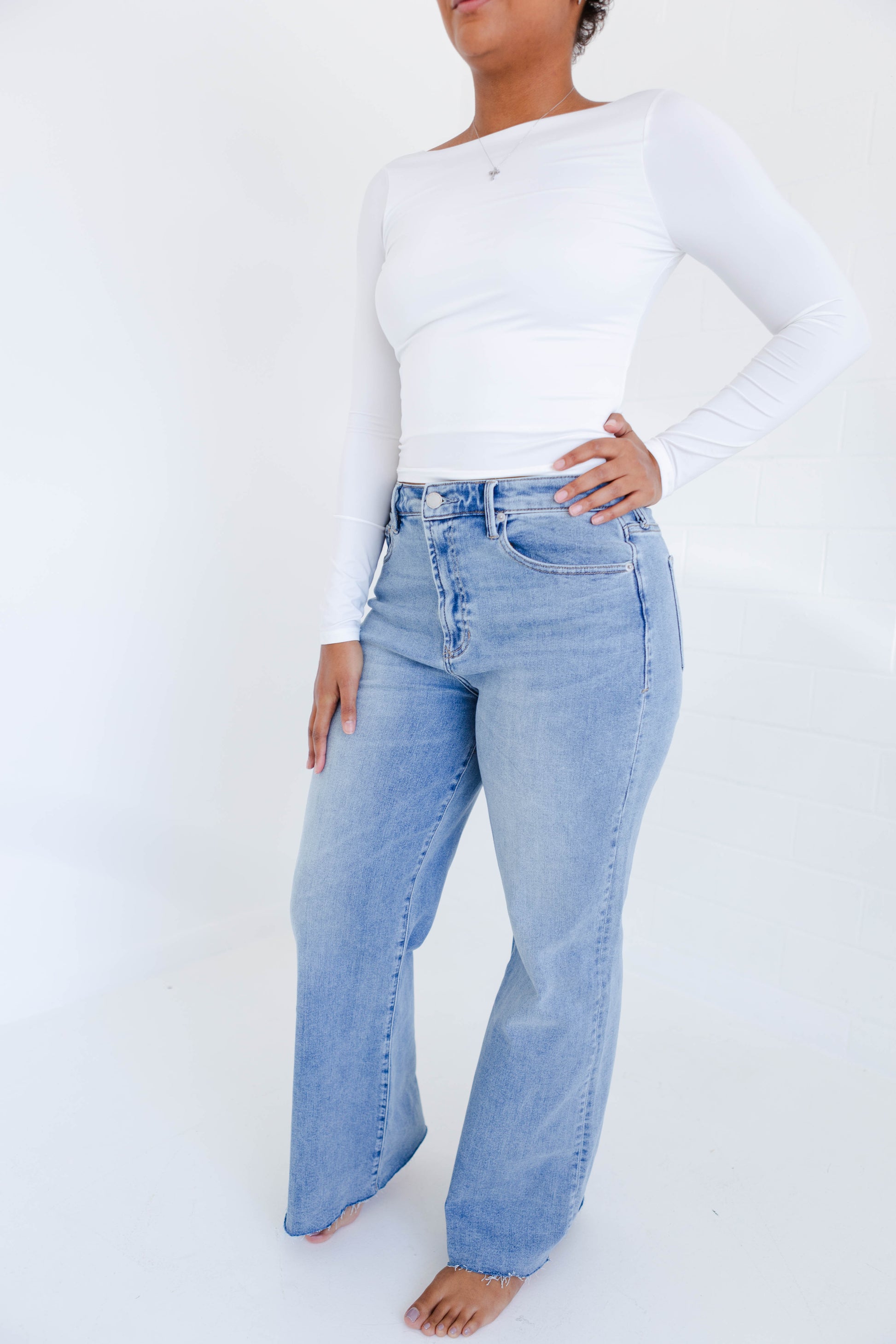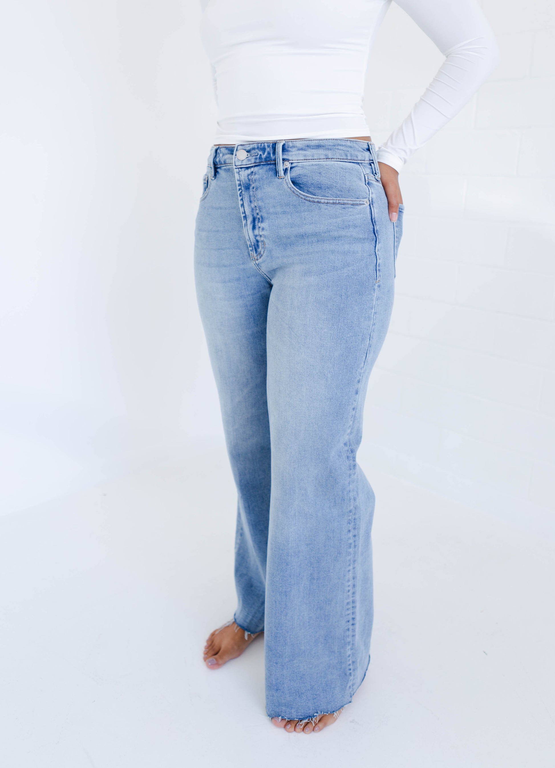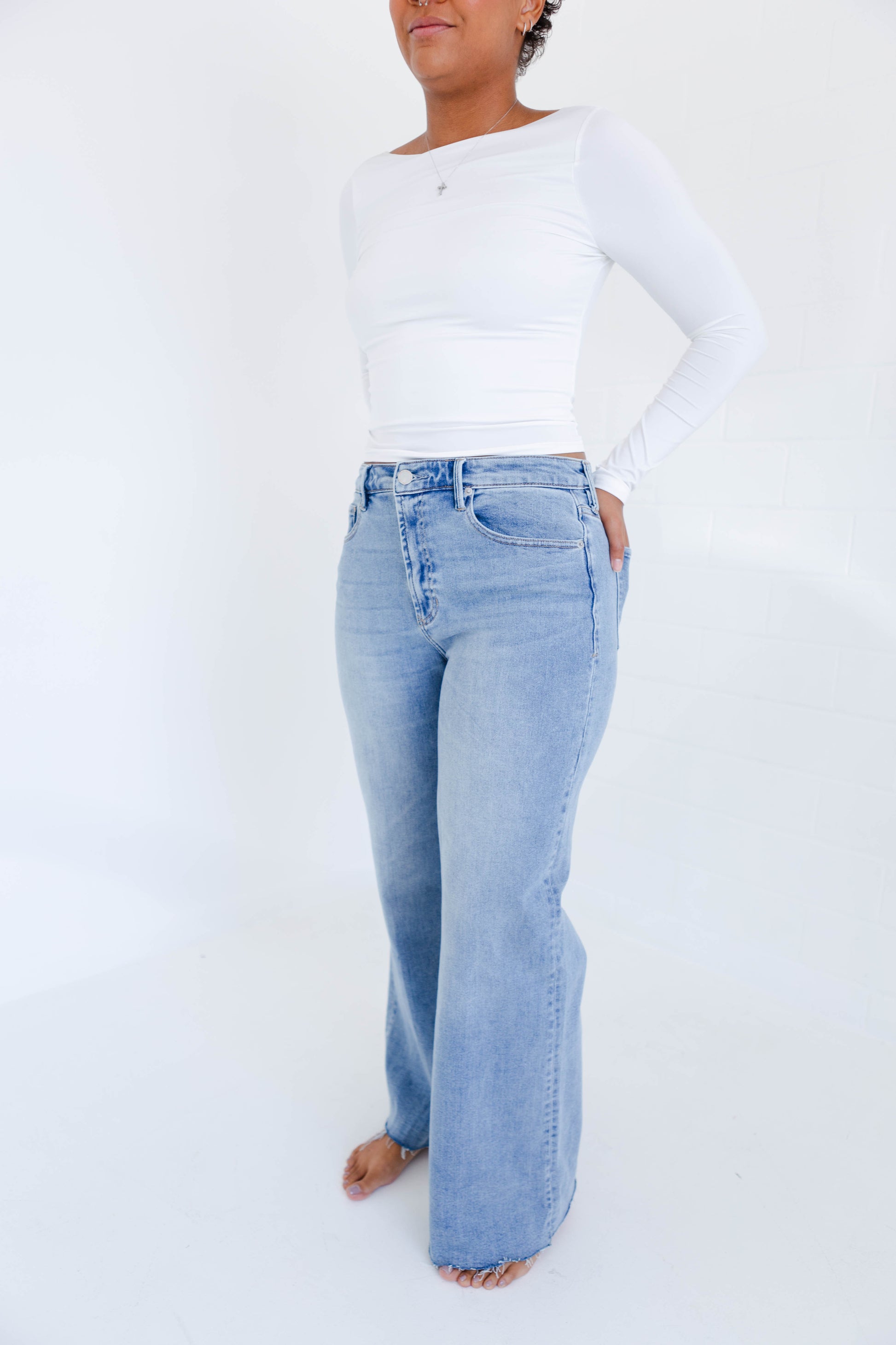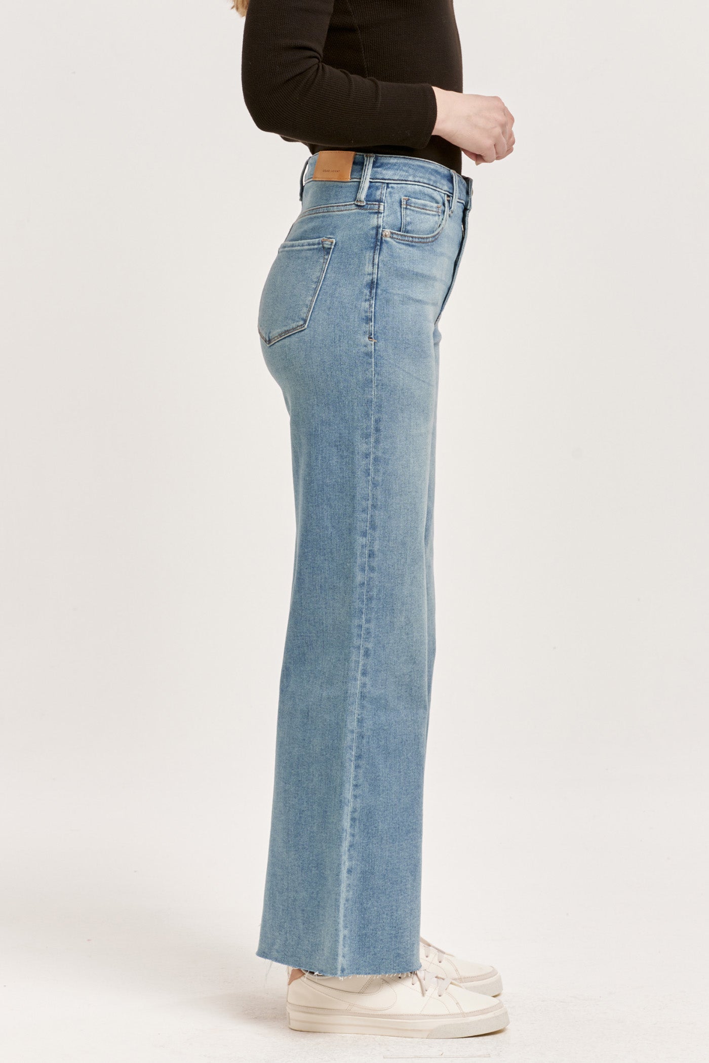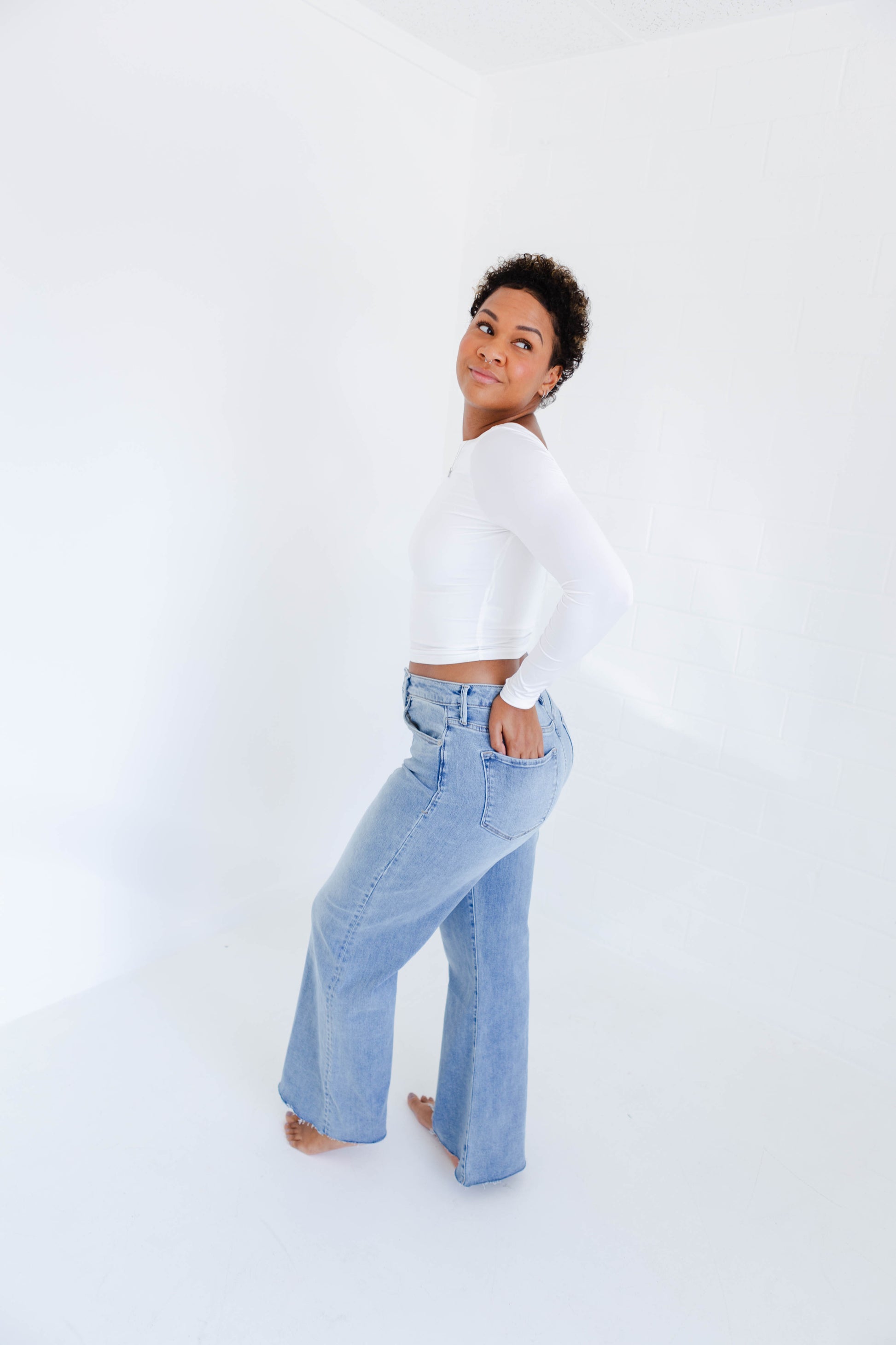 High rise wide leg jeans. It's cozy fit that sits at natural waist, embraces your natural curves and accentuates your hips and thigh. Full inseam on stretch denim accented with hand sanding hip whiskers & inseam chevrons, pocket grinding, tailor pressed seam lines, cut-off hem details, washed in complementary for any outings with buttery softness.