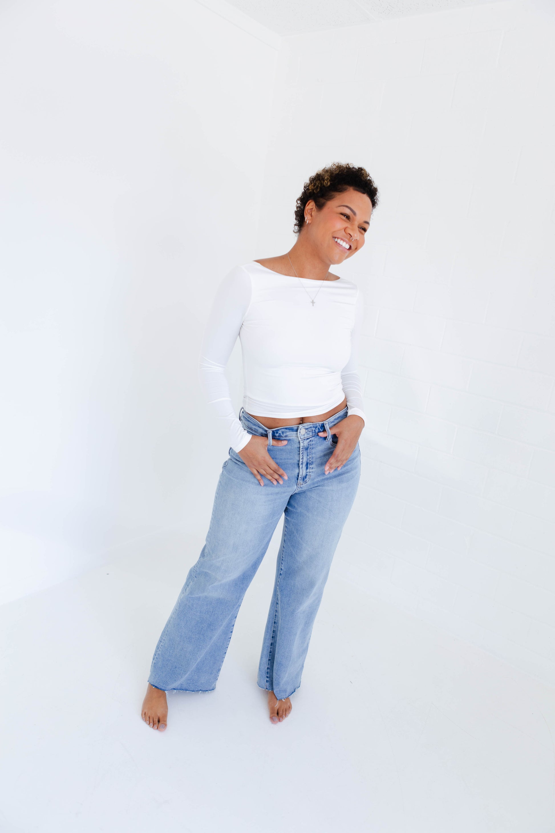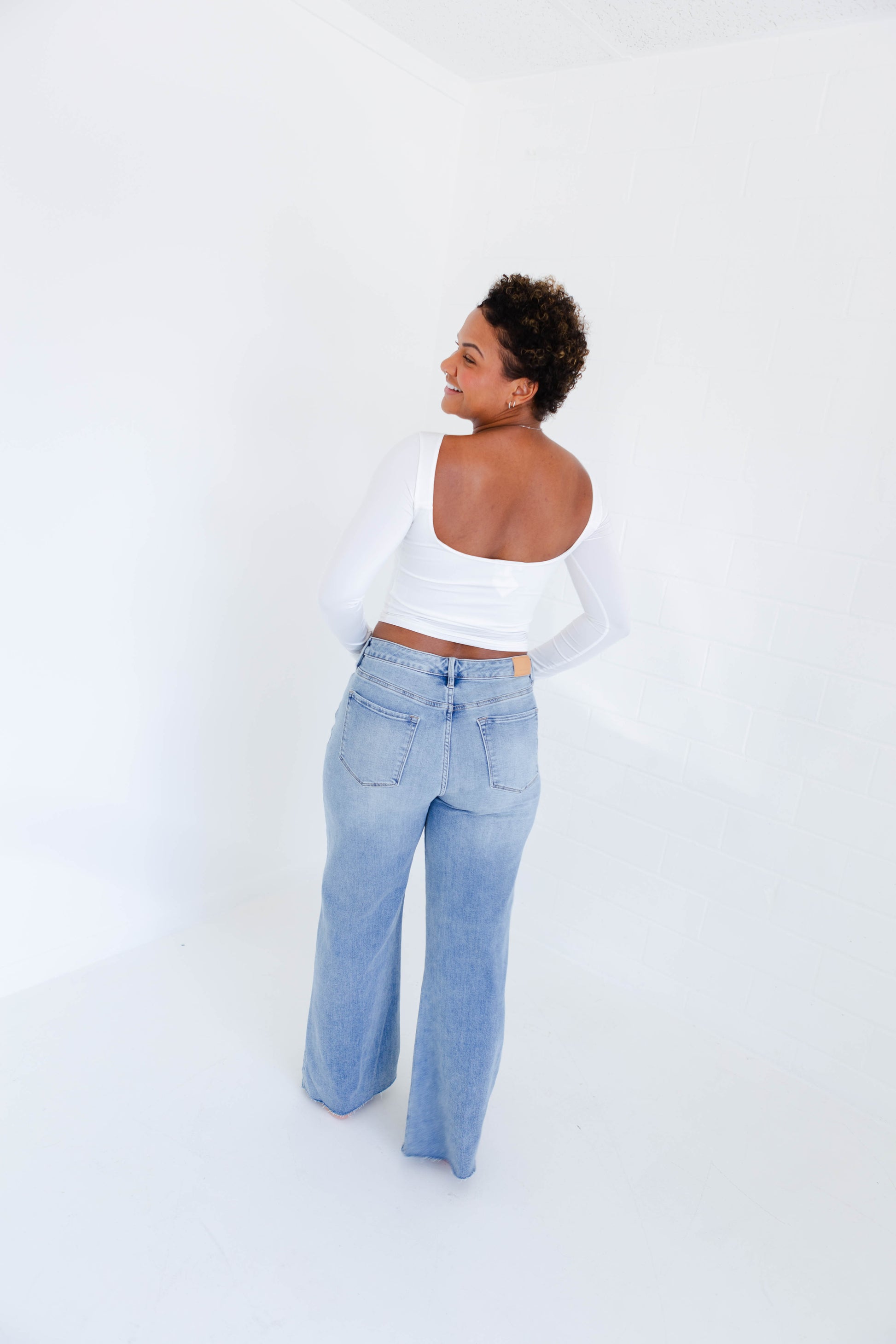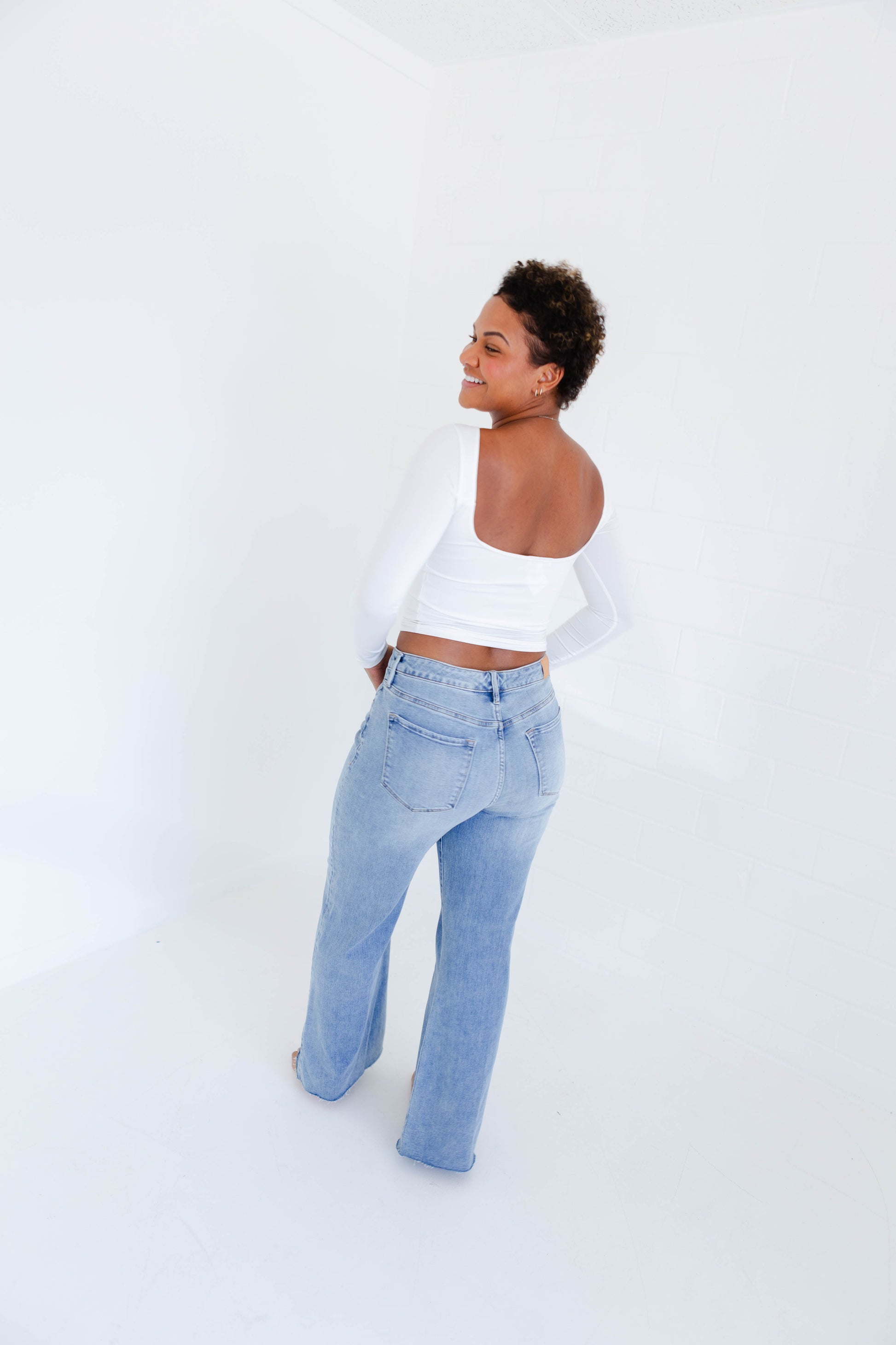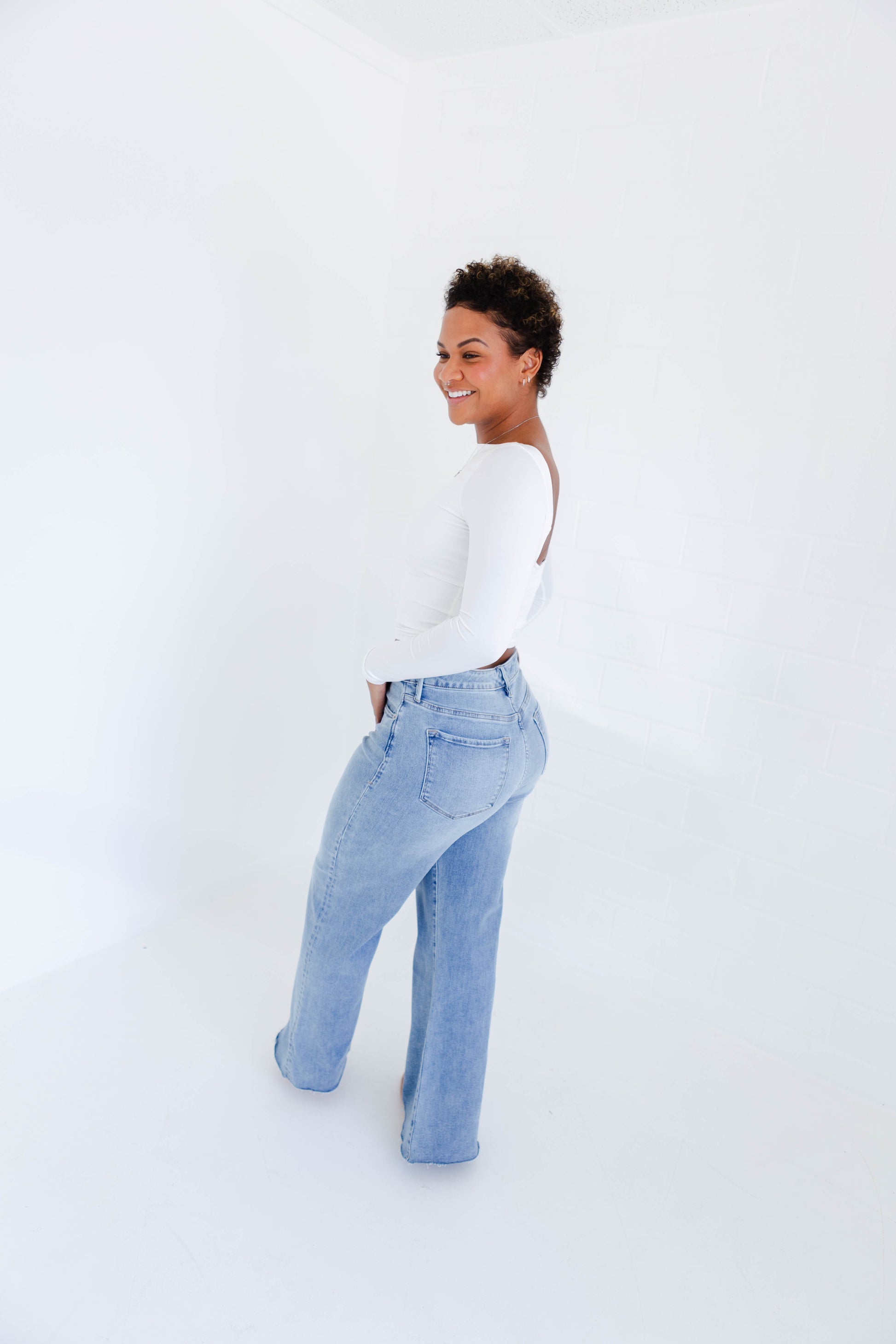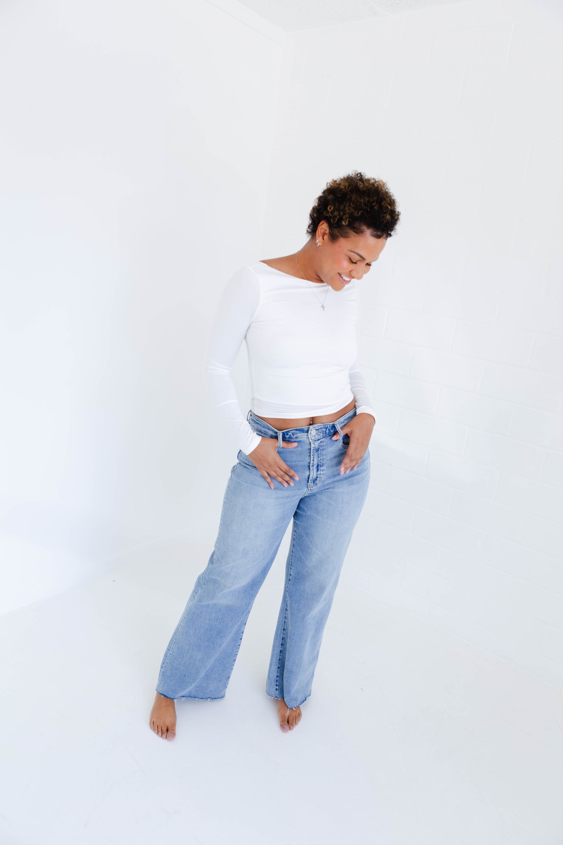 High rise wide leg jeans. It's cozy fit that sits at natural waist, embraces your natural curves and accentuates your hips and thigh. Full inseam on stretch denim accented with hand sanding hip whiskers & inseam chevrons, pocket grinding, tailor pressed seam lines, cut-off hem details, washed in complementary for any outings with buttery softness.
