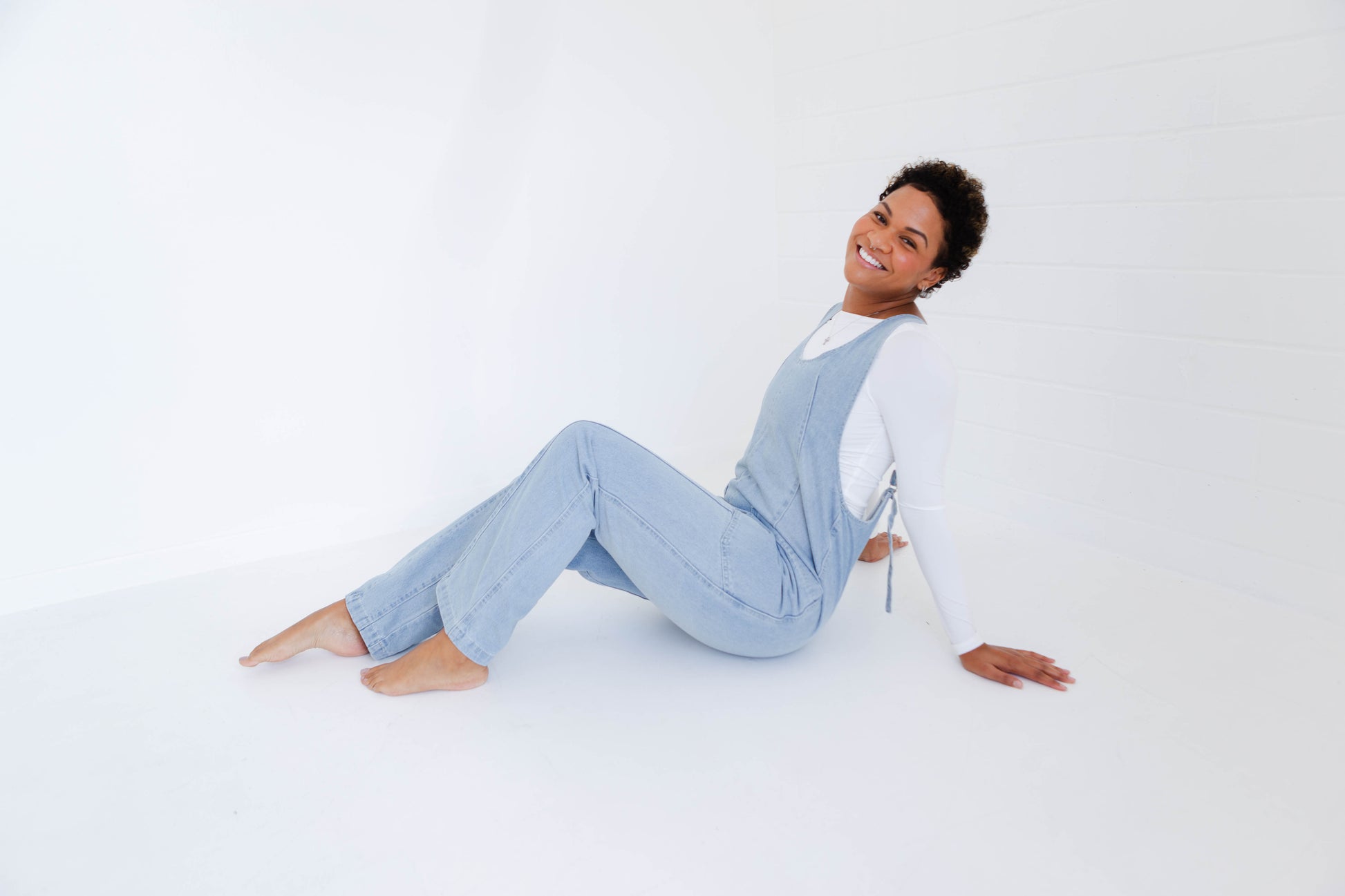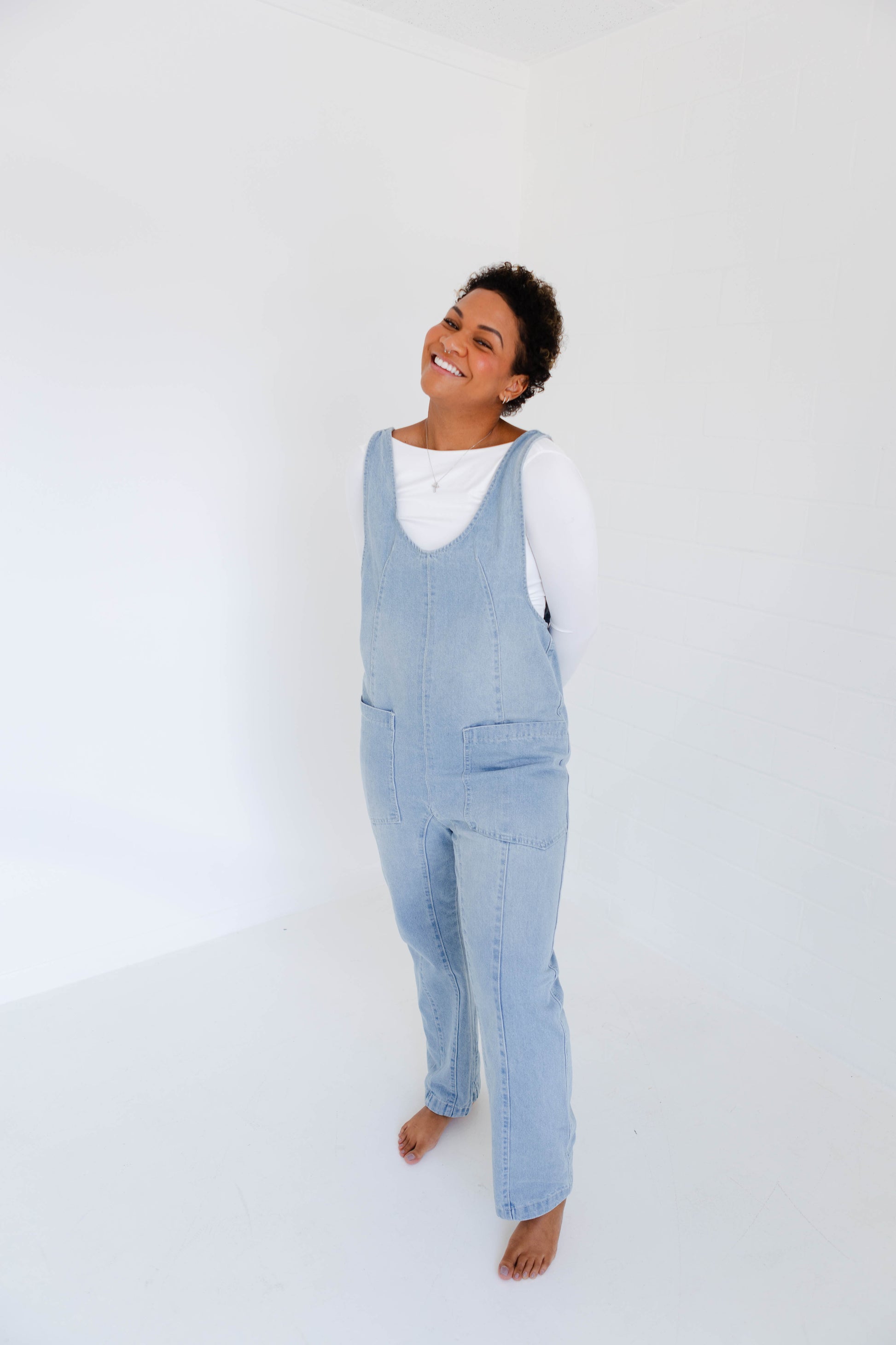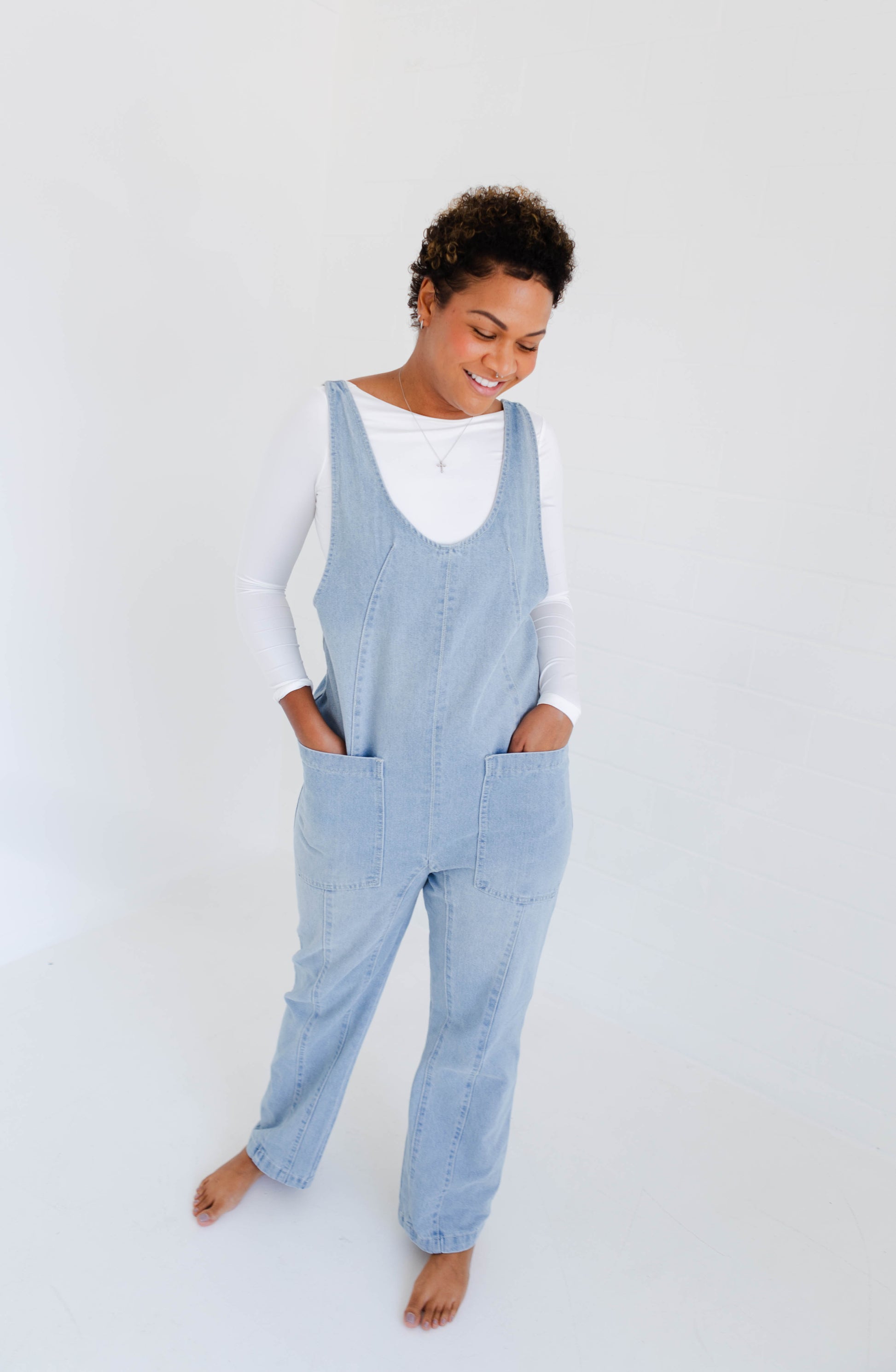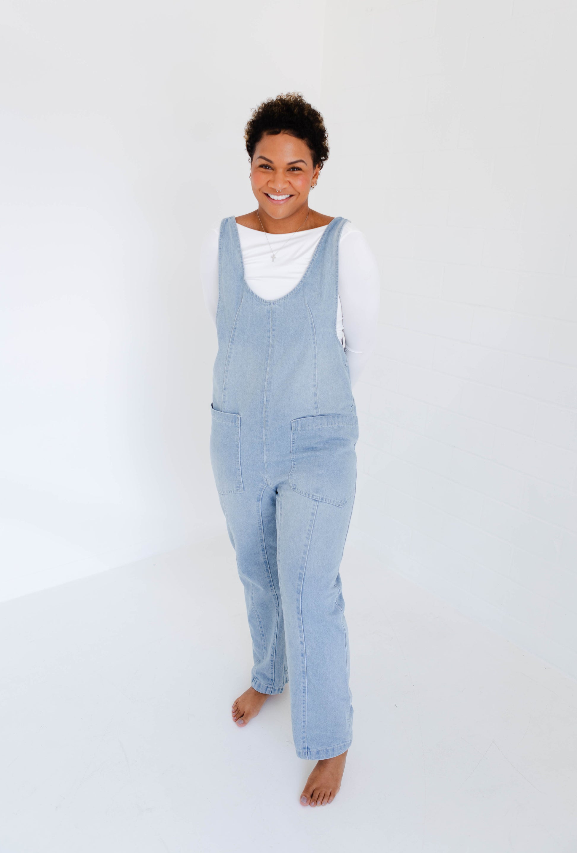Get ready for fall with our Denim Jumper Overall! This comfy piece will quickly become a staple in your wardrobe. With an open back design and available in a variety of sizes, it's the perfect addition to any outfit. (Natalia loves it and she's 5'8" wearing the large!)