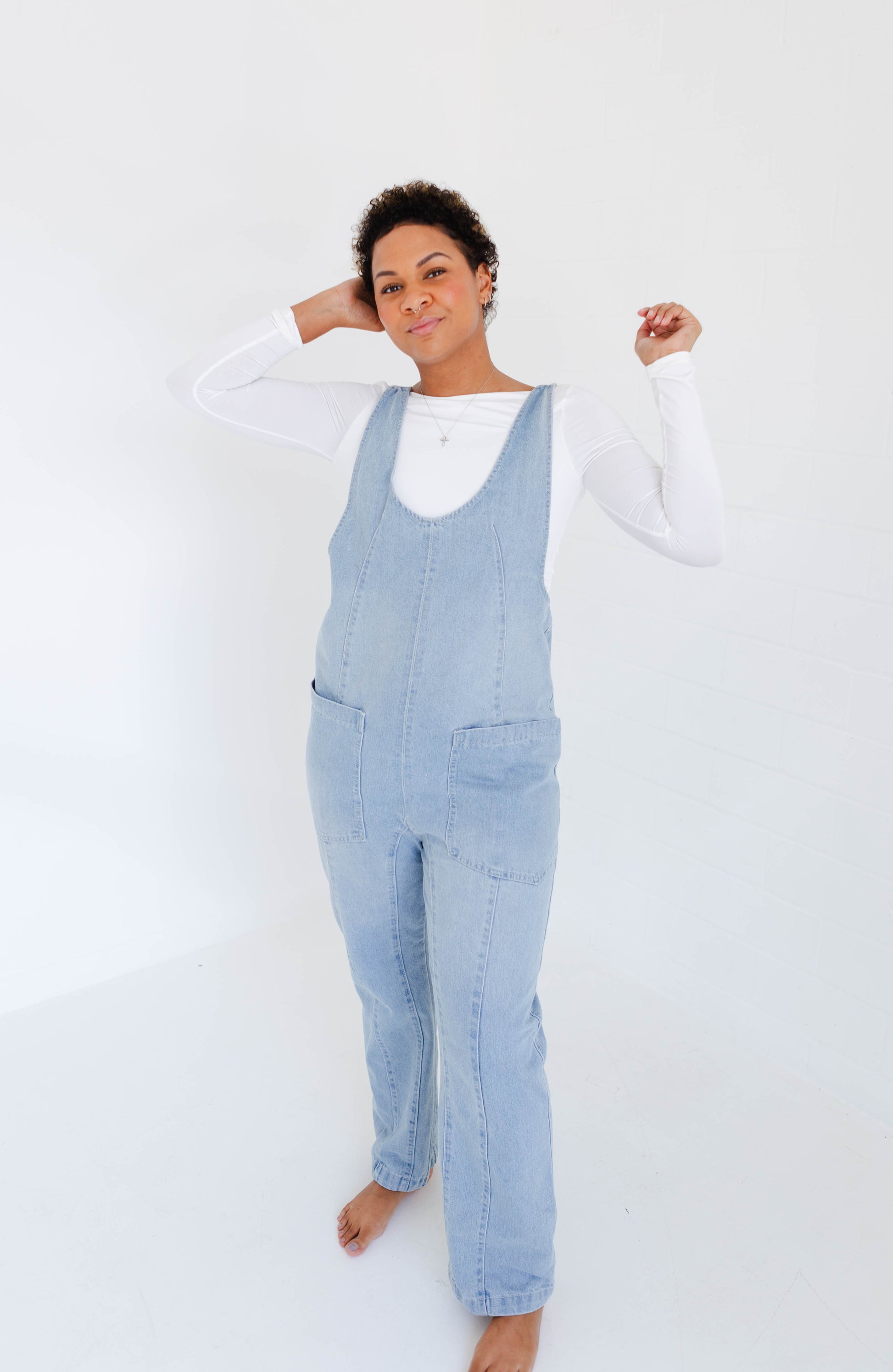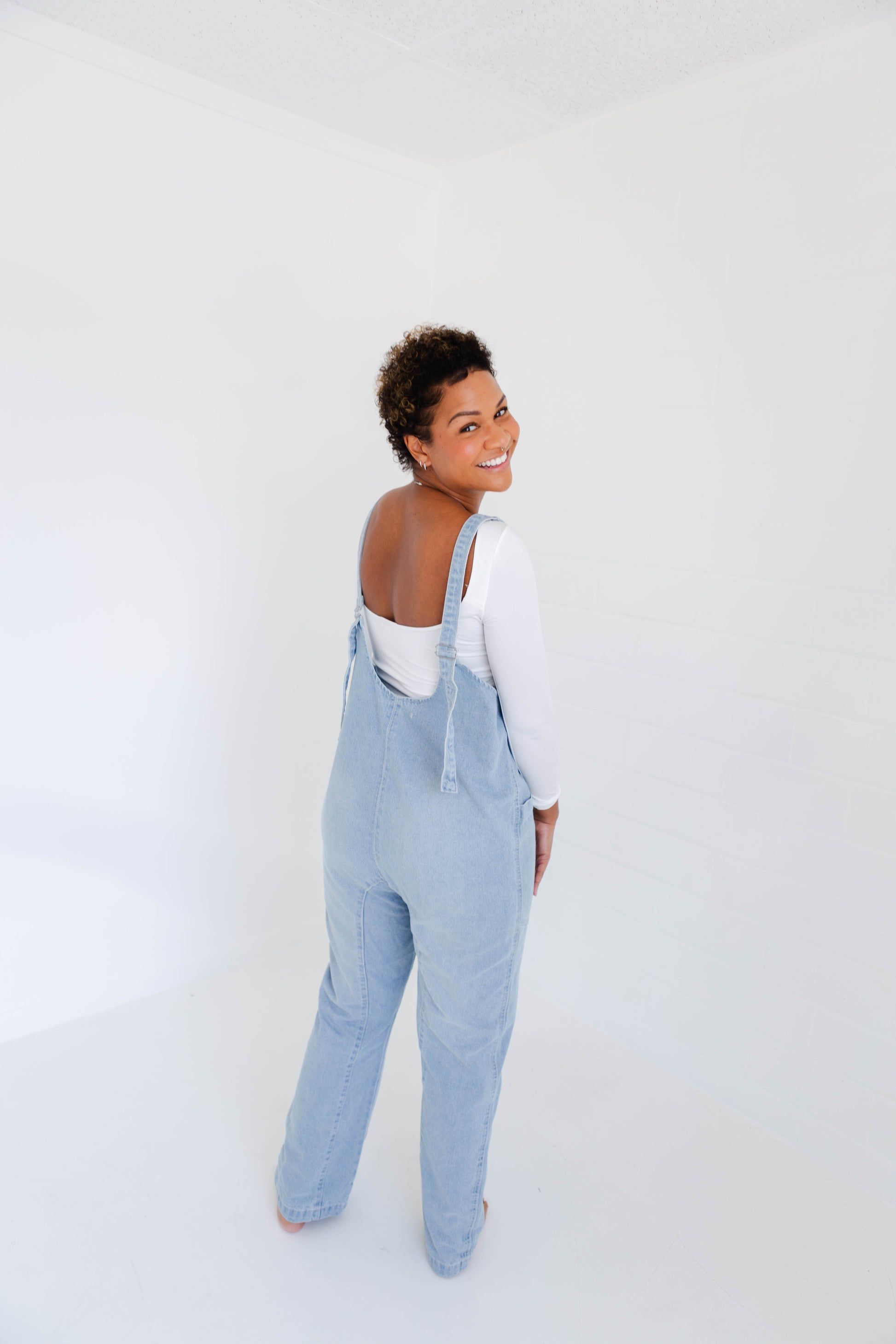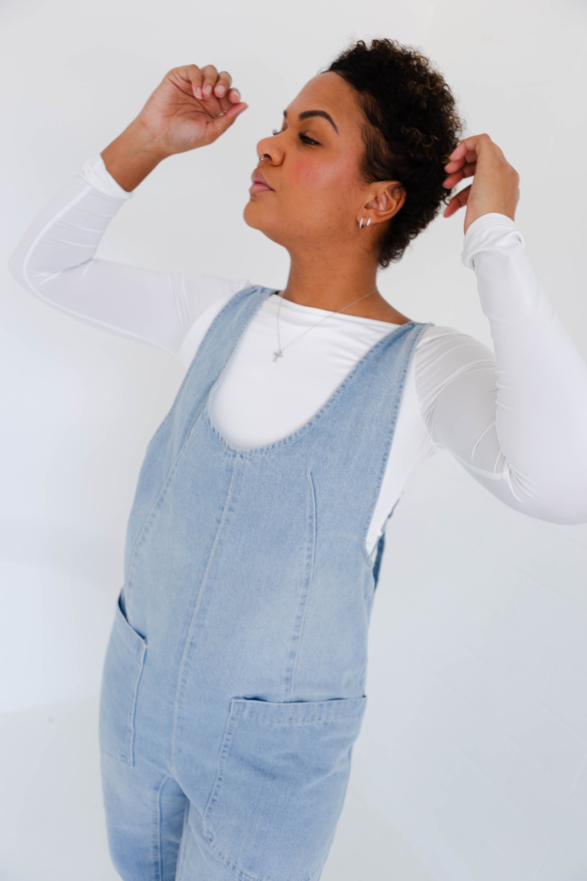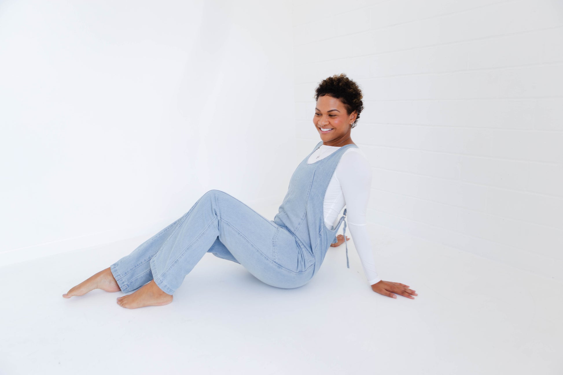 Get ready for fall with our Denim Jumper Overall! This comfy piece will quickly become a staple in your wardrobe. With an open back design and available in a variety of sizes, it's the perfect addition to any outfit. (Natalia loves it and she's 5'8" wearing the large!)