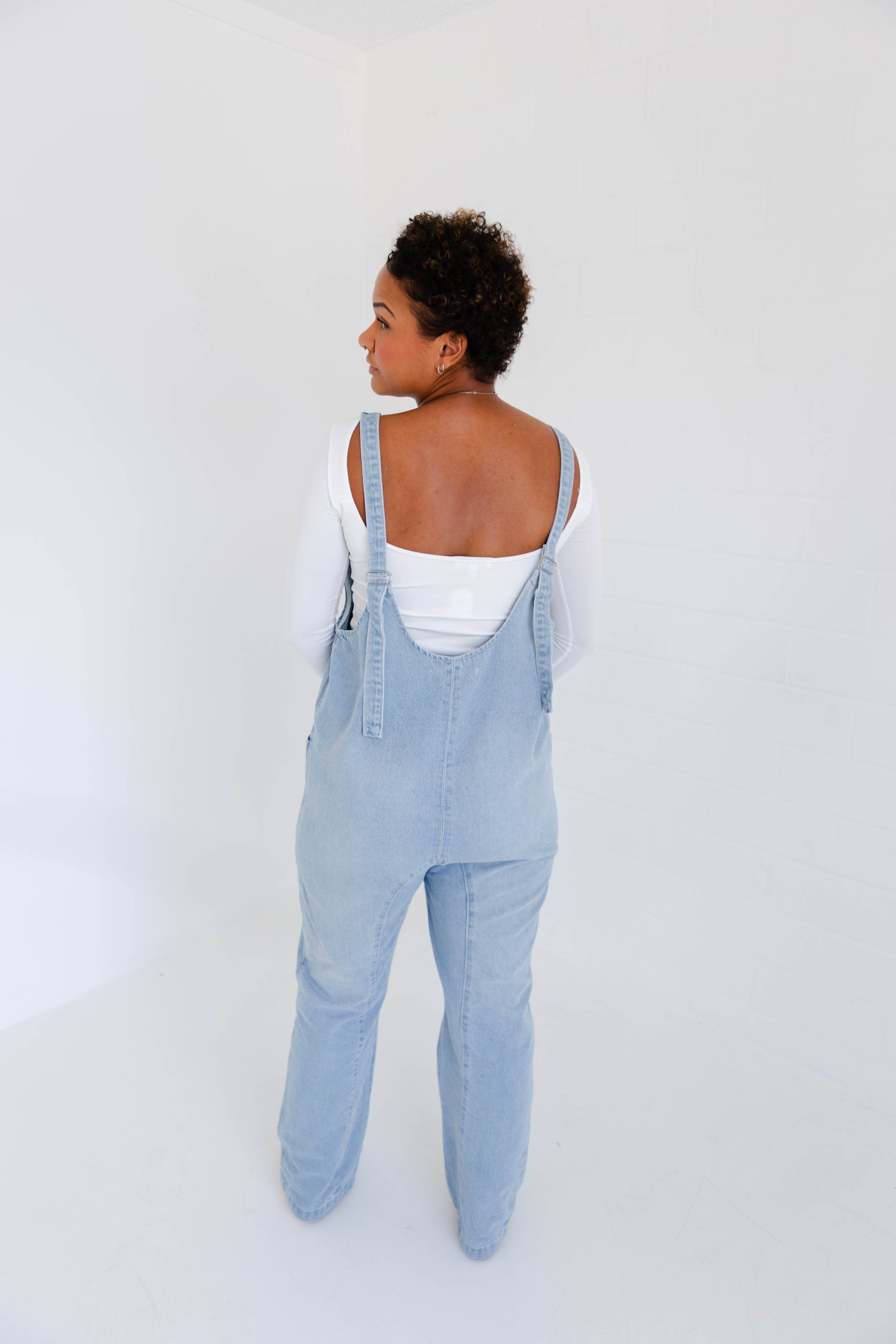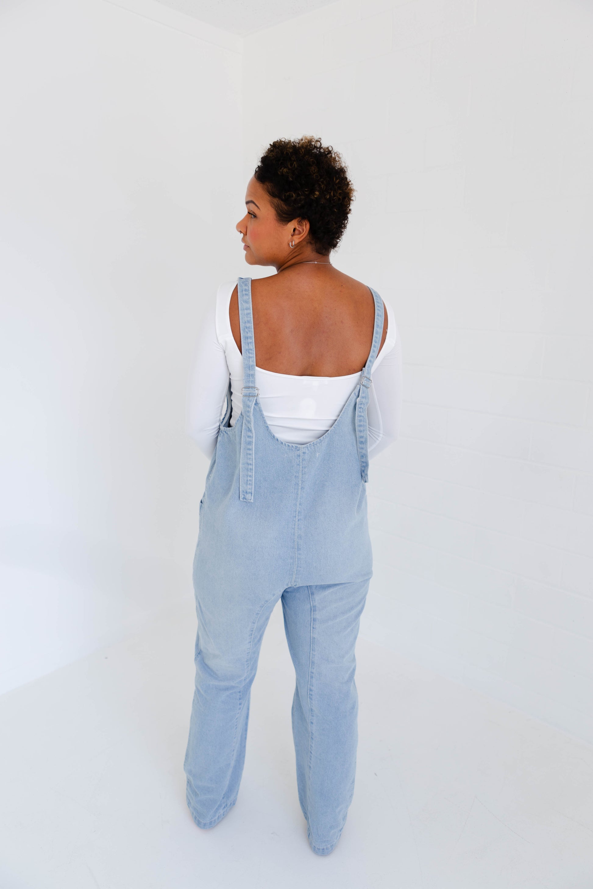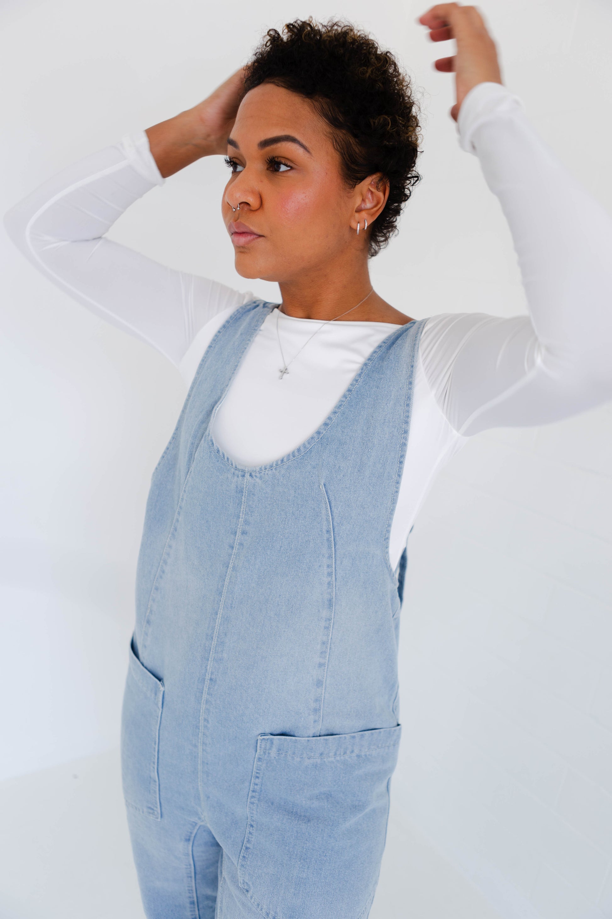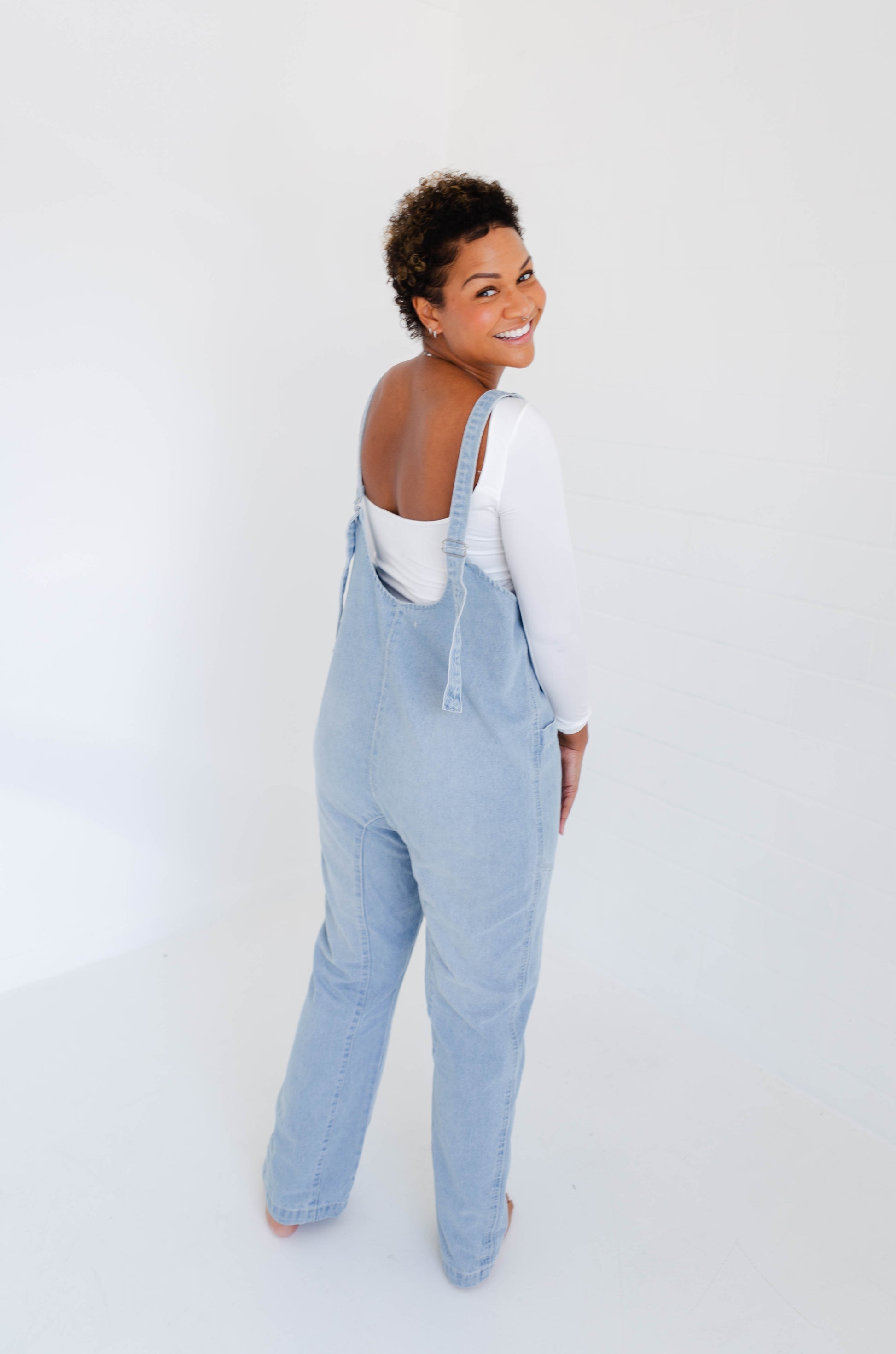 Get ready for fall with our Denim Jumper Overall! This comfy piece will quickly become a staple in your wardrobe. With an open back design and available in a variety of sizes, it's the perfect addition to any outfit. (Natalia loves it and she's 5'8" wearing the large!)
