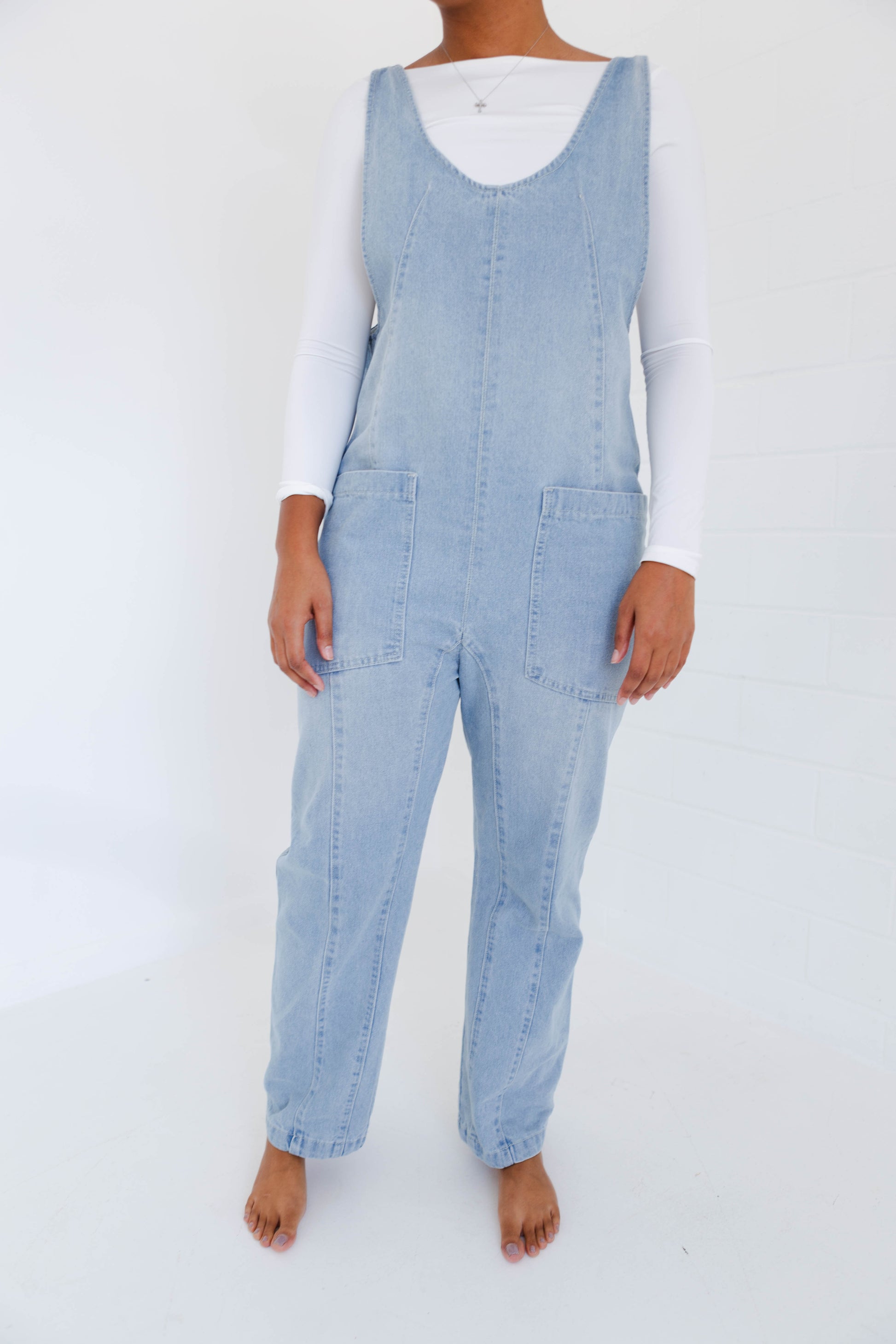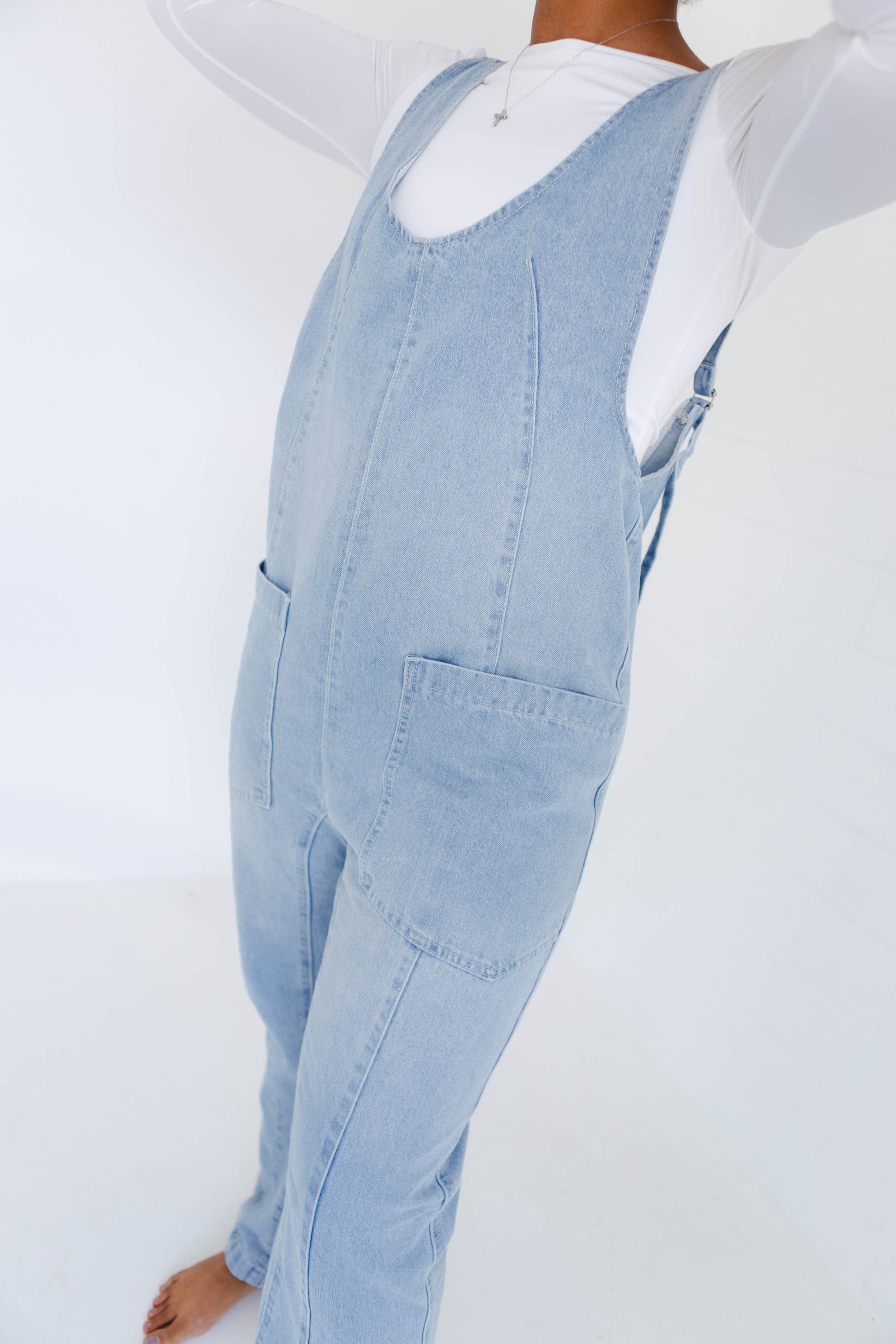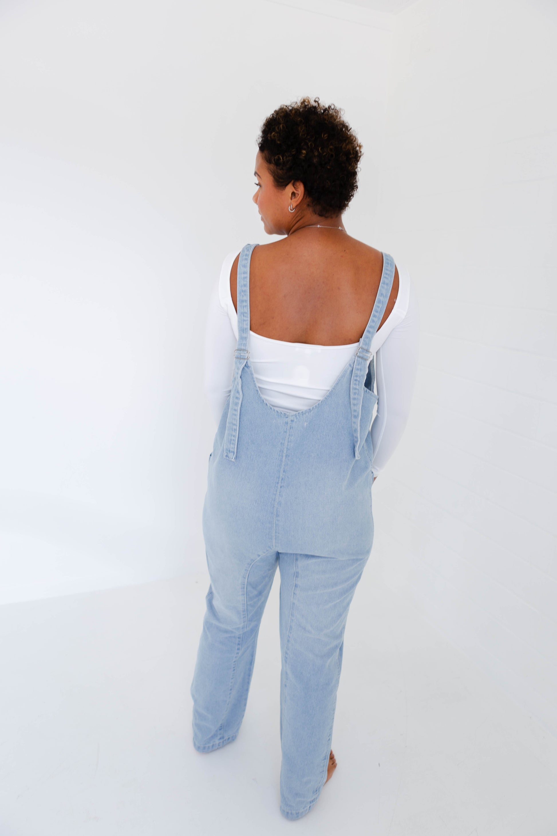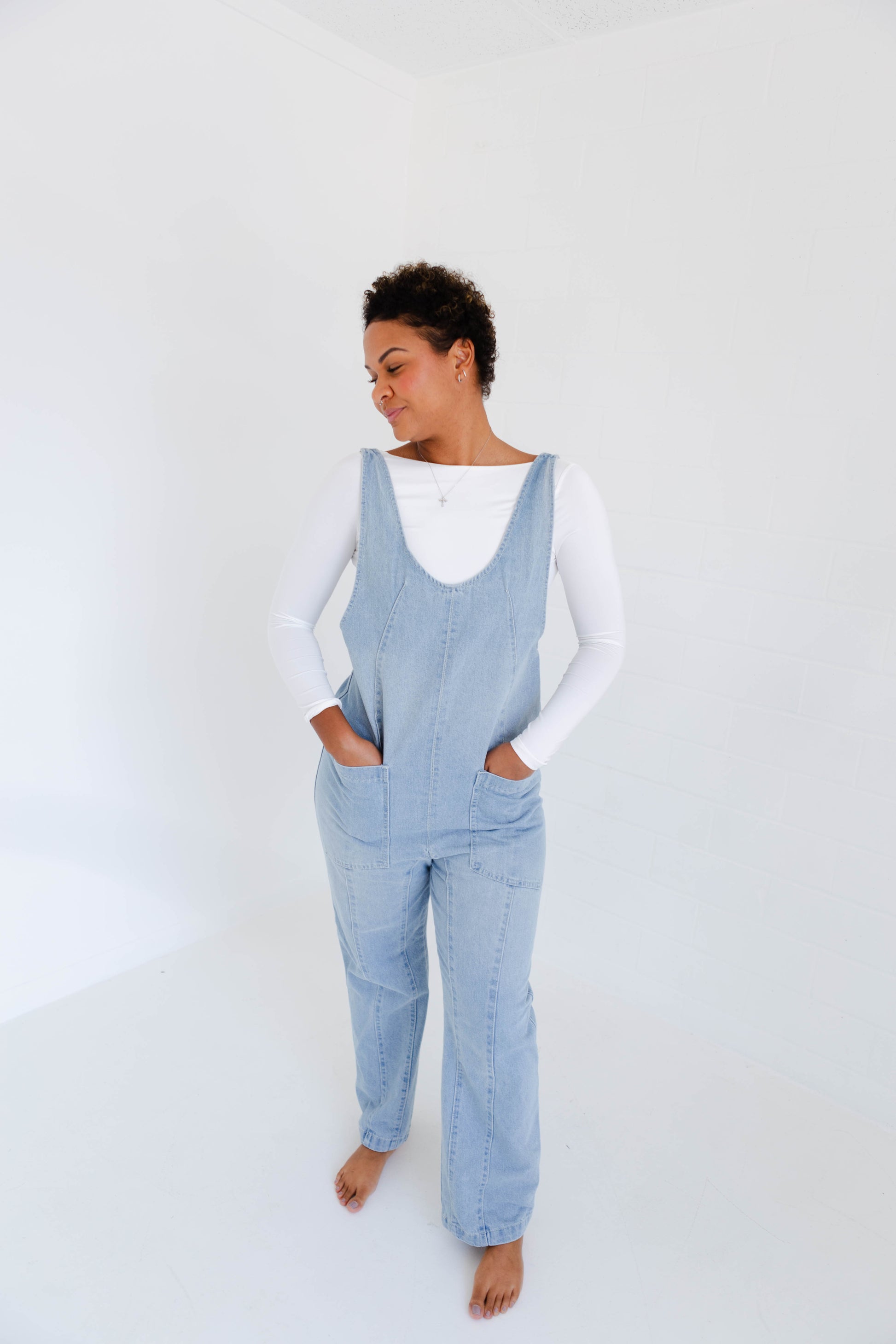 Get ready for fall with our Denim Jumper Overall! This comfy piece will quickly become a staple in your wardrobe. With an open back design and available in a variety of sizes, it's the perfect addition to any outfit. (Natalia loves it and she's 5'8" wearing the large!)