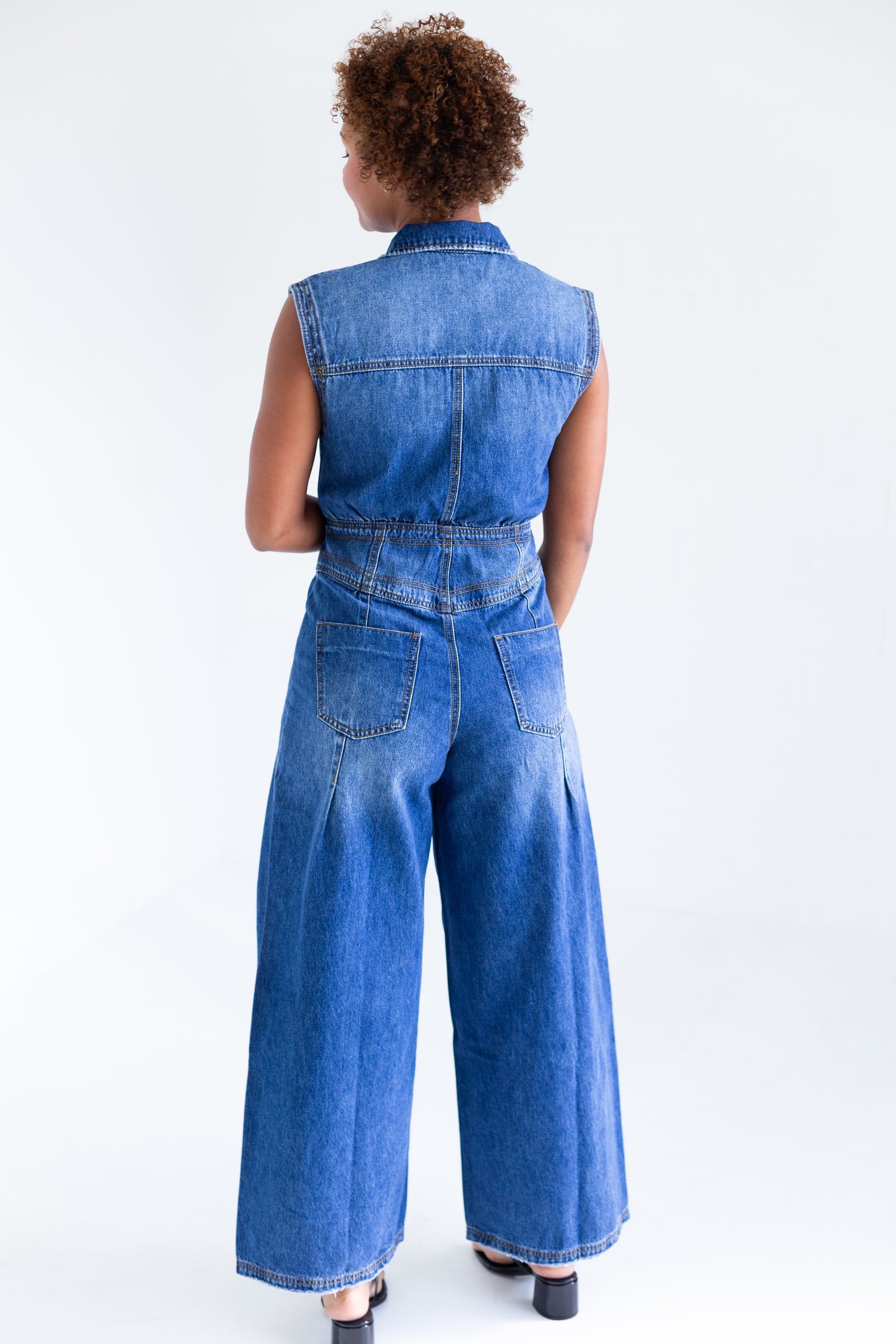 This denim sleeveless shirt jumper features a button-up front and a collared neckline. Its wide-leg design and pleated legs provide a comfortable and stylish fit. Perfect for a professional or casual look. Natalia is 5’8” wearing the small.