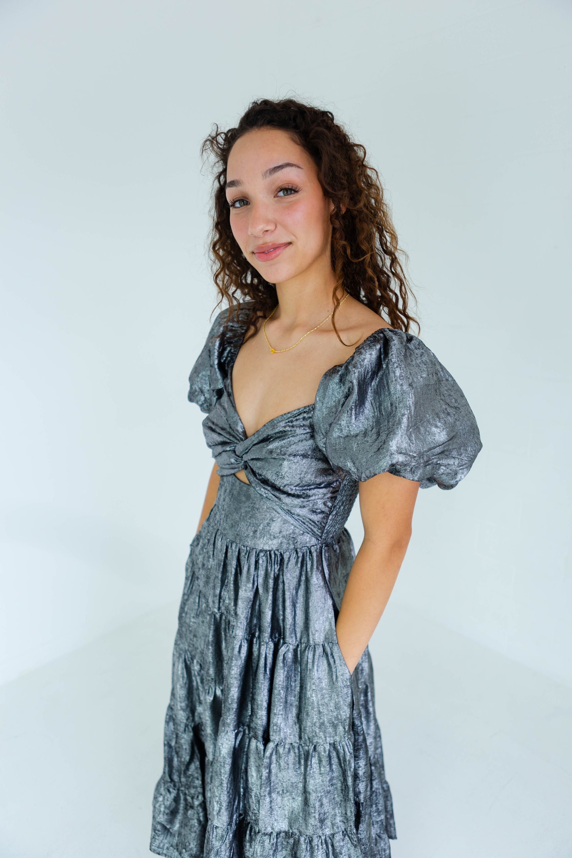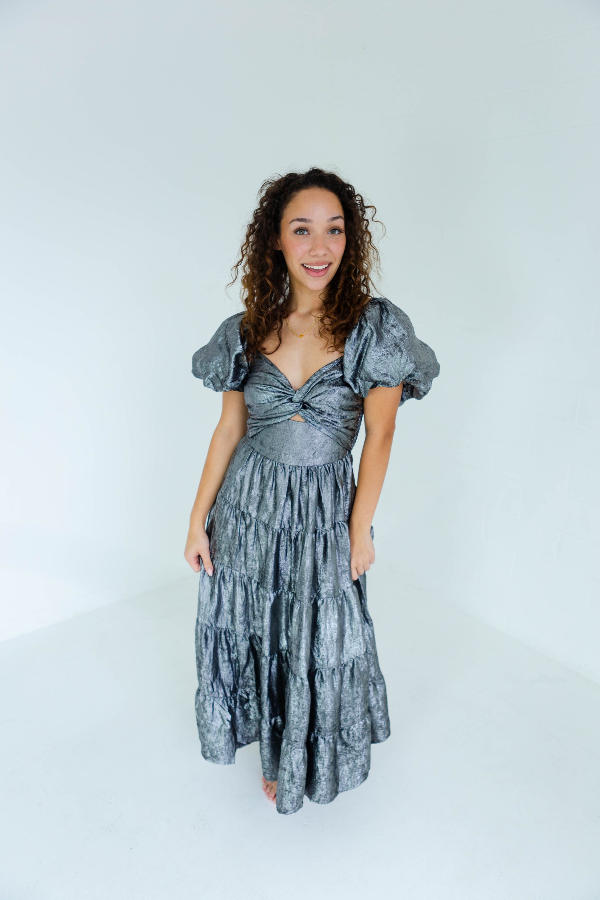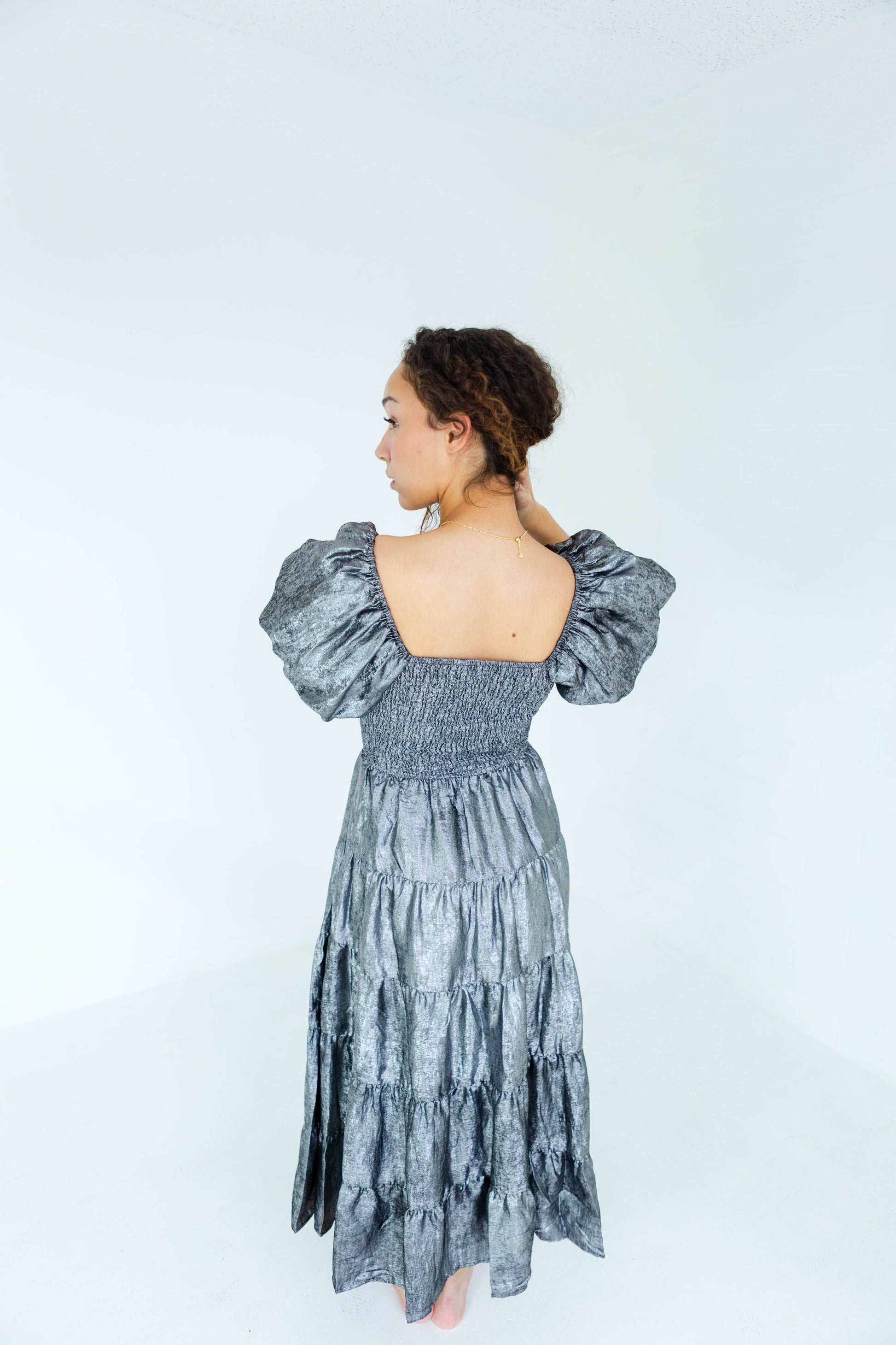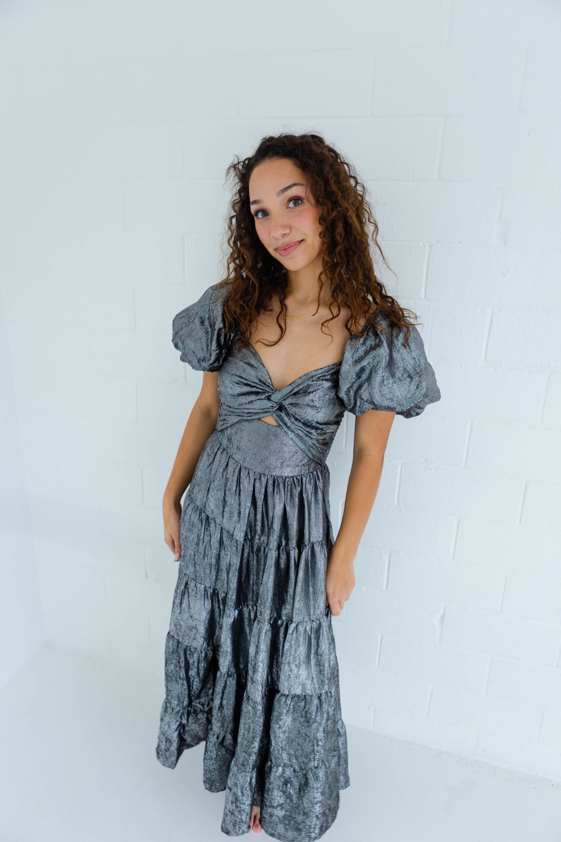 Get ready to turn heads in this Gunmetal Soft Woven Maxi Dress! With its trendy puff sleeves and unique peek-a-boo cut out, this dress exudes girly fun. The elastic backing on the bust provides both style and comfort, while the tiered skirt adds a touch of femininity. The silver color adds a bold touch. Don't miss out on this must-have dress for your wardrobe! Trinity is 5'6" wearing the small.