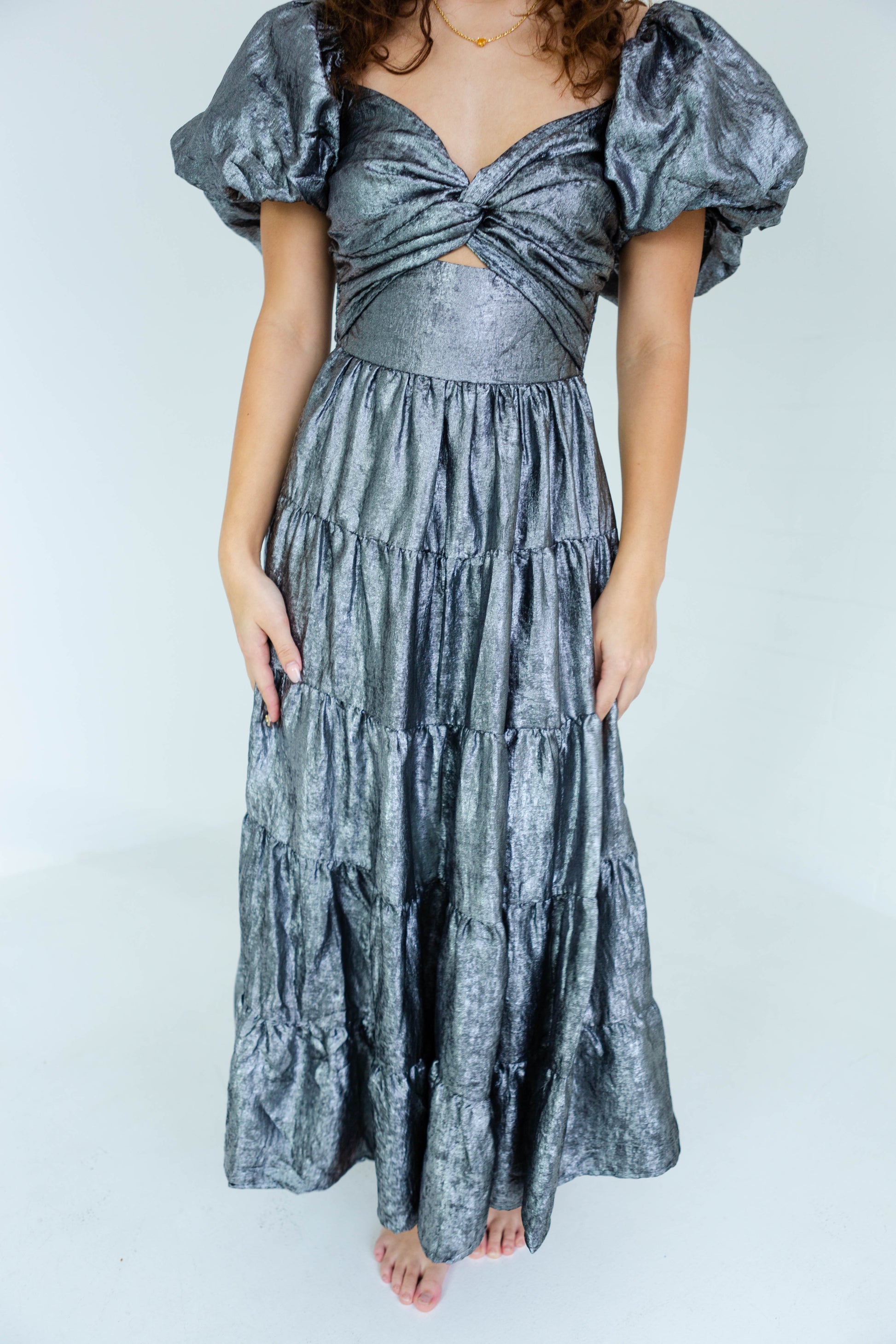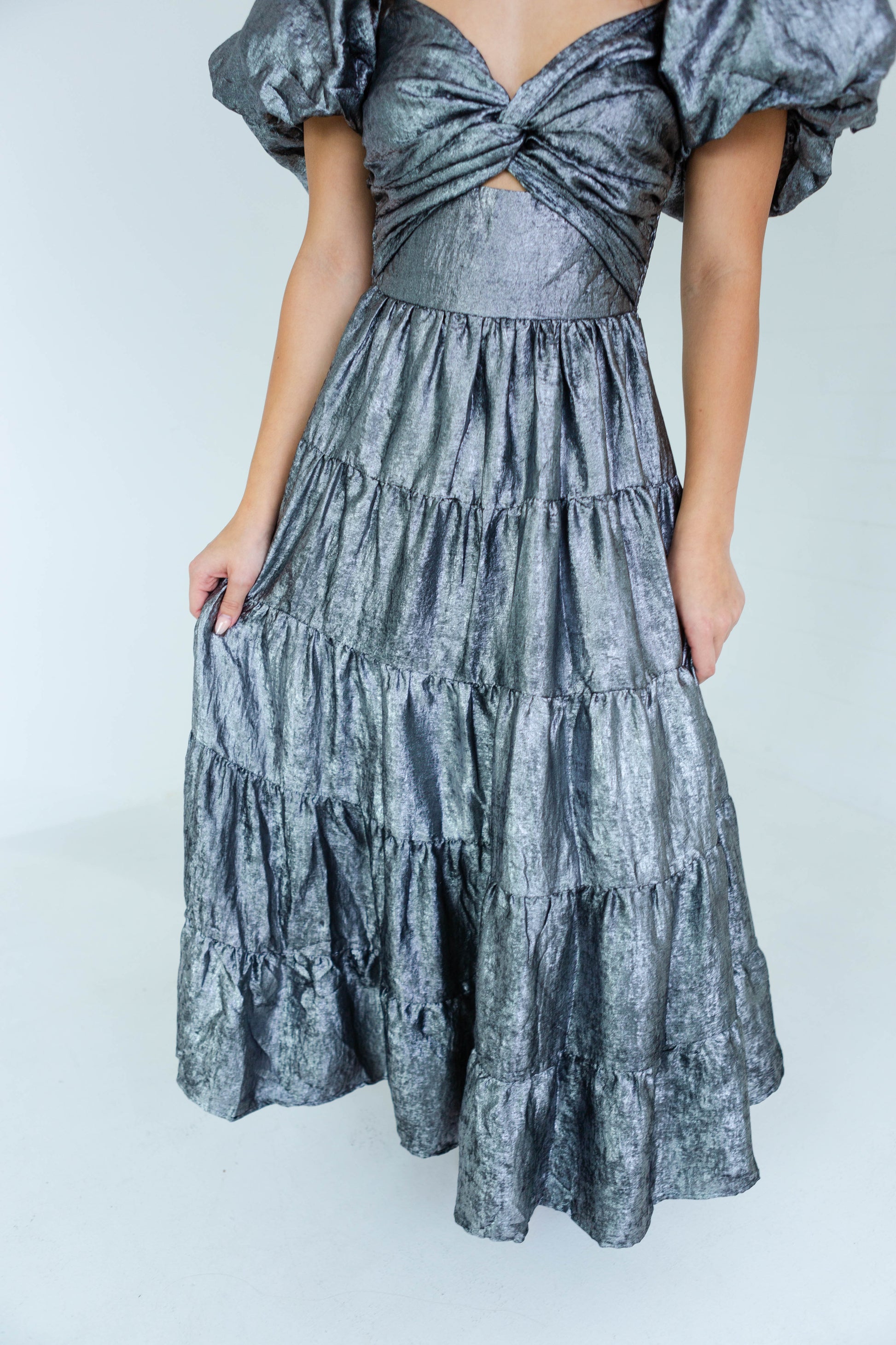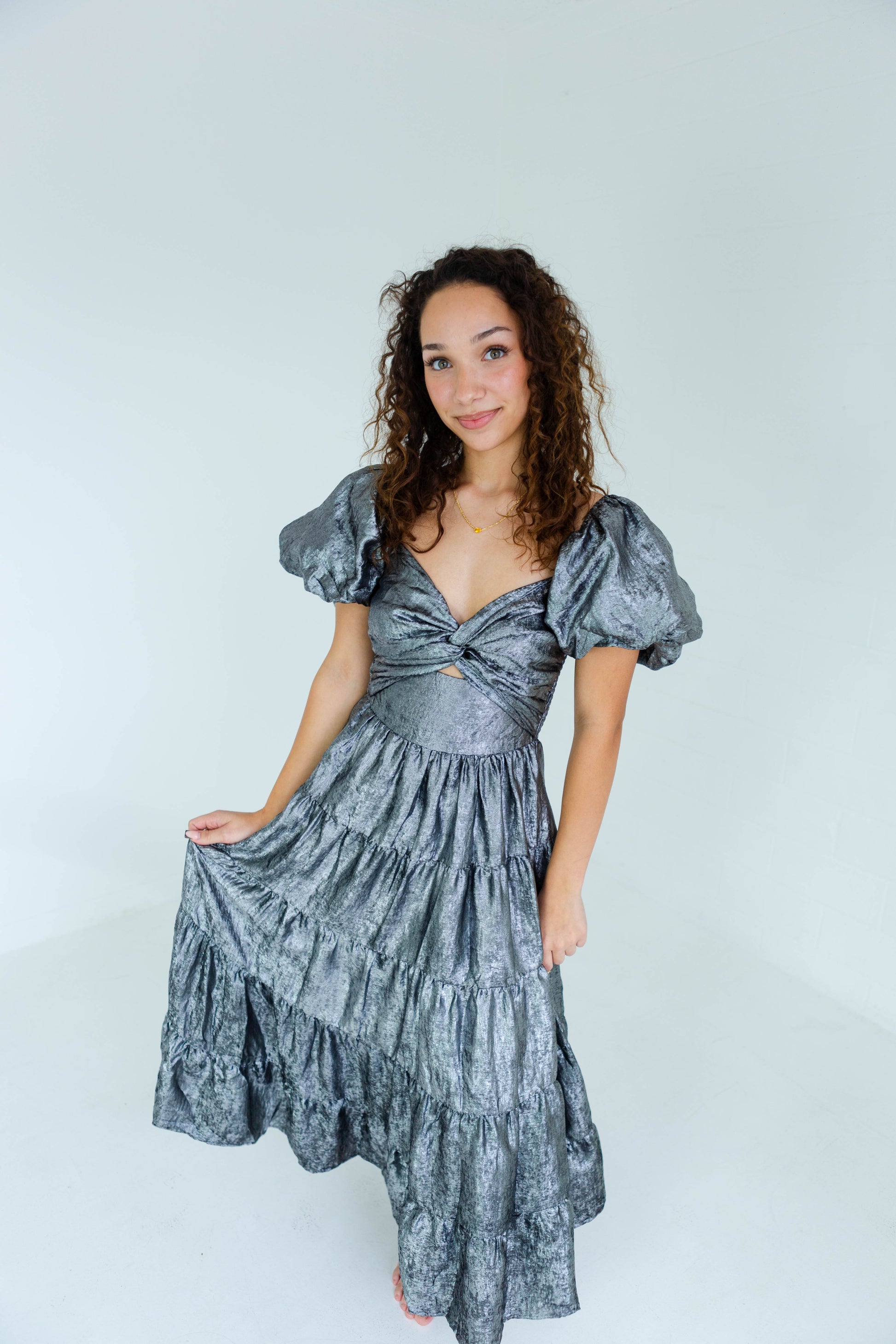 Get ready to turn heads in this Gunmetal Soft Woven Maxi Dress! With its trendy puff sleeves and unique peek-a-boo cut out, this dress exudes girly fun. The elastic backing on the bust provides both style and comfort, while the tiered skirt adds a touch of femininity. The silver color adds a bold touch. Don't miss out on this must-have dress for your wardrobe! Trinity is 5'6" wearing the small.