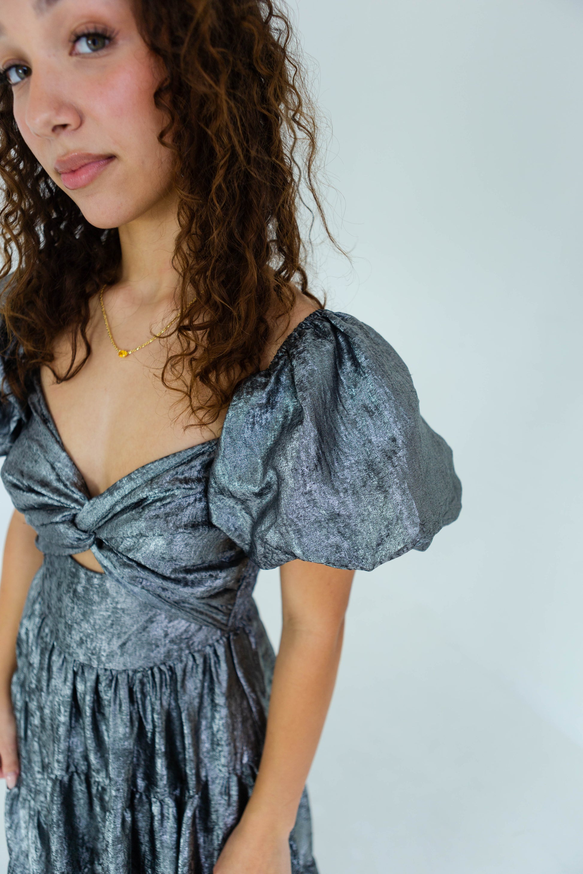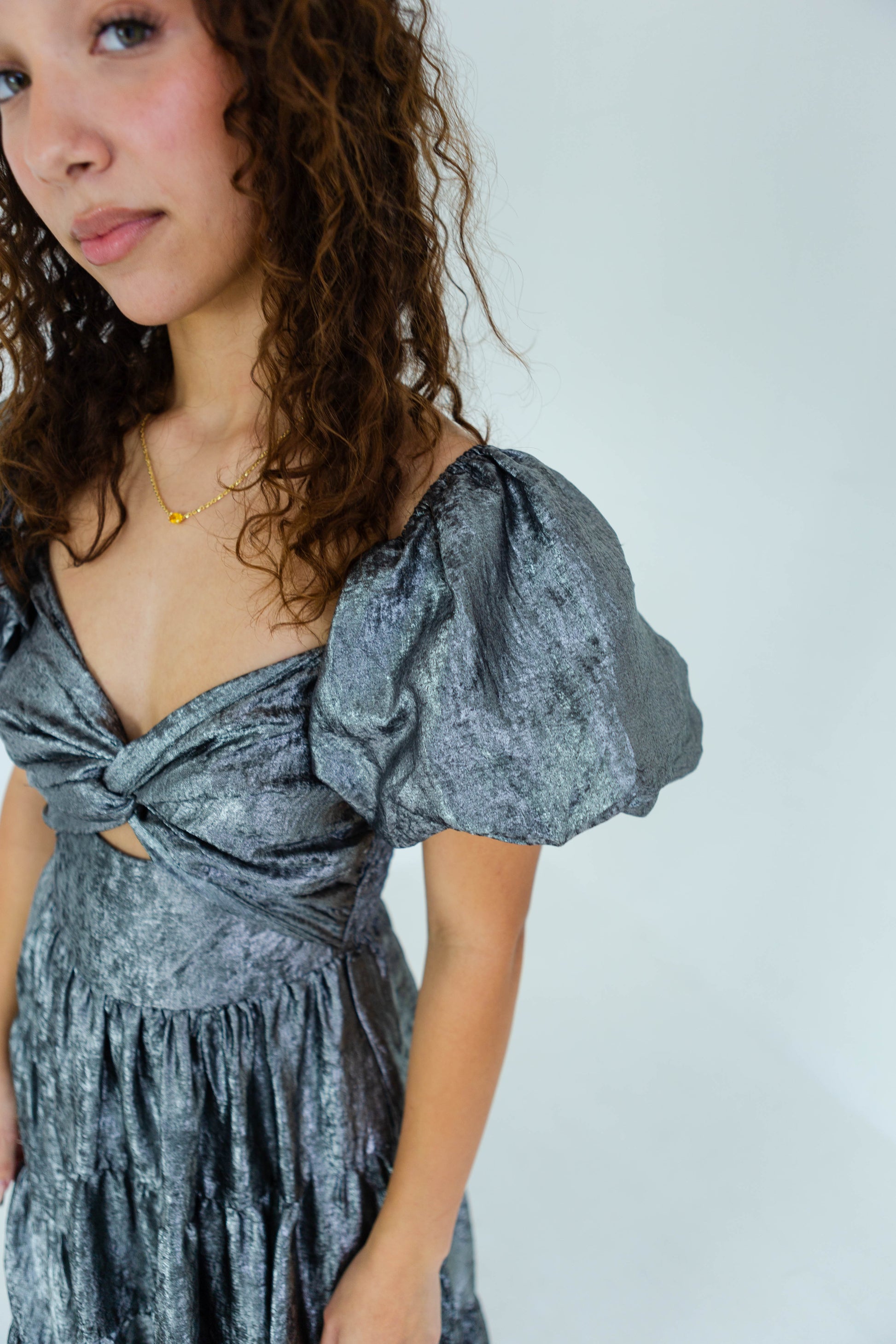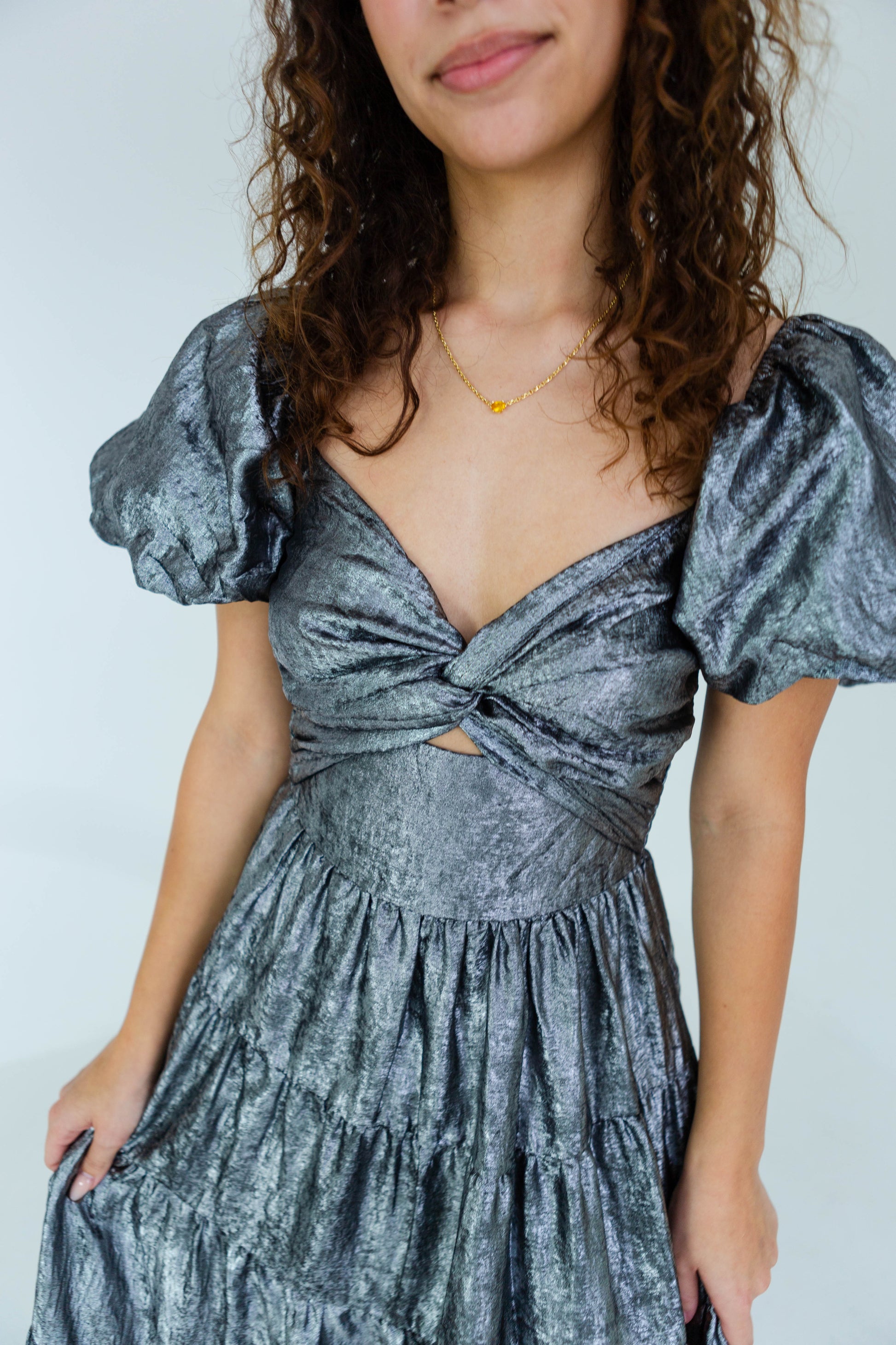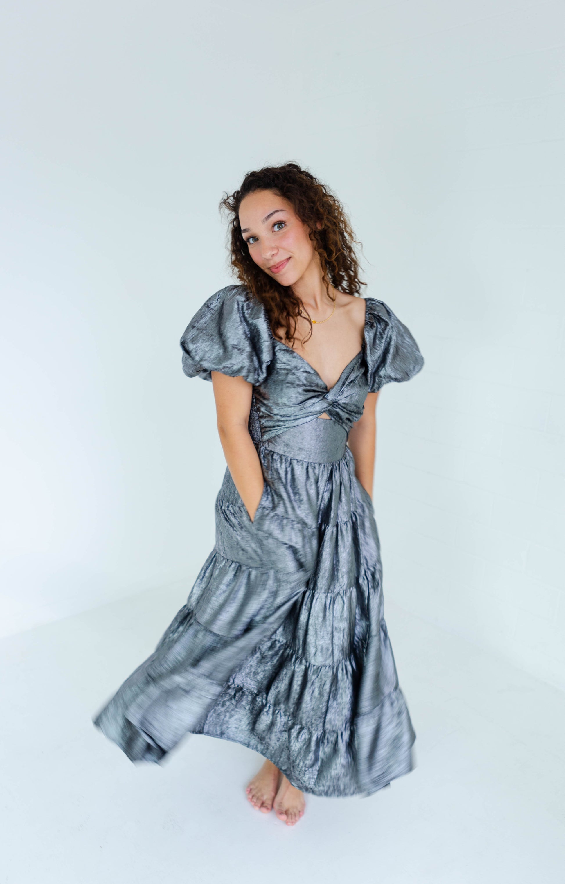 Get ready to turn heads in this Gunmetal Soft Woven Maxi Dress! With its trendy puff sleeves and unique peek-a-boo cut out, this dress exudes girly fun. The elastic backing on the bust provides both style and comfort, while the tiered skirt adds a touch of femininity. The silver color adds a bold touch. Don't miss out on this must-have dress for your wardrobe! Trinity is 5'6" wearing the small.