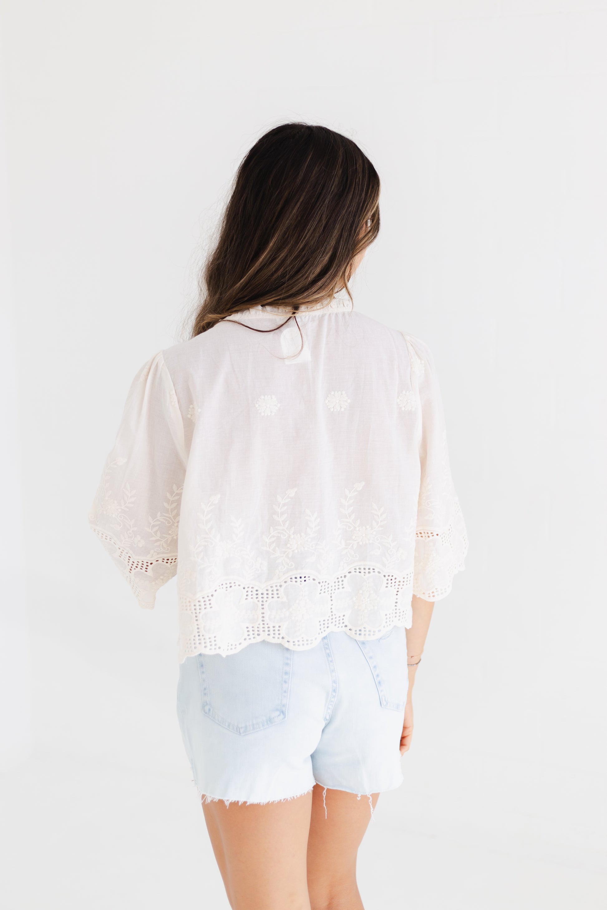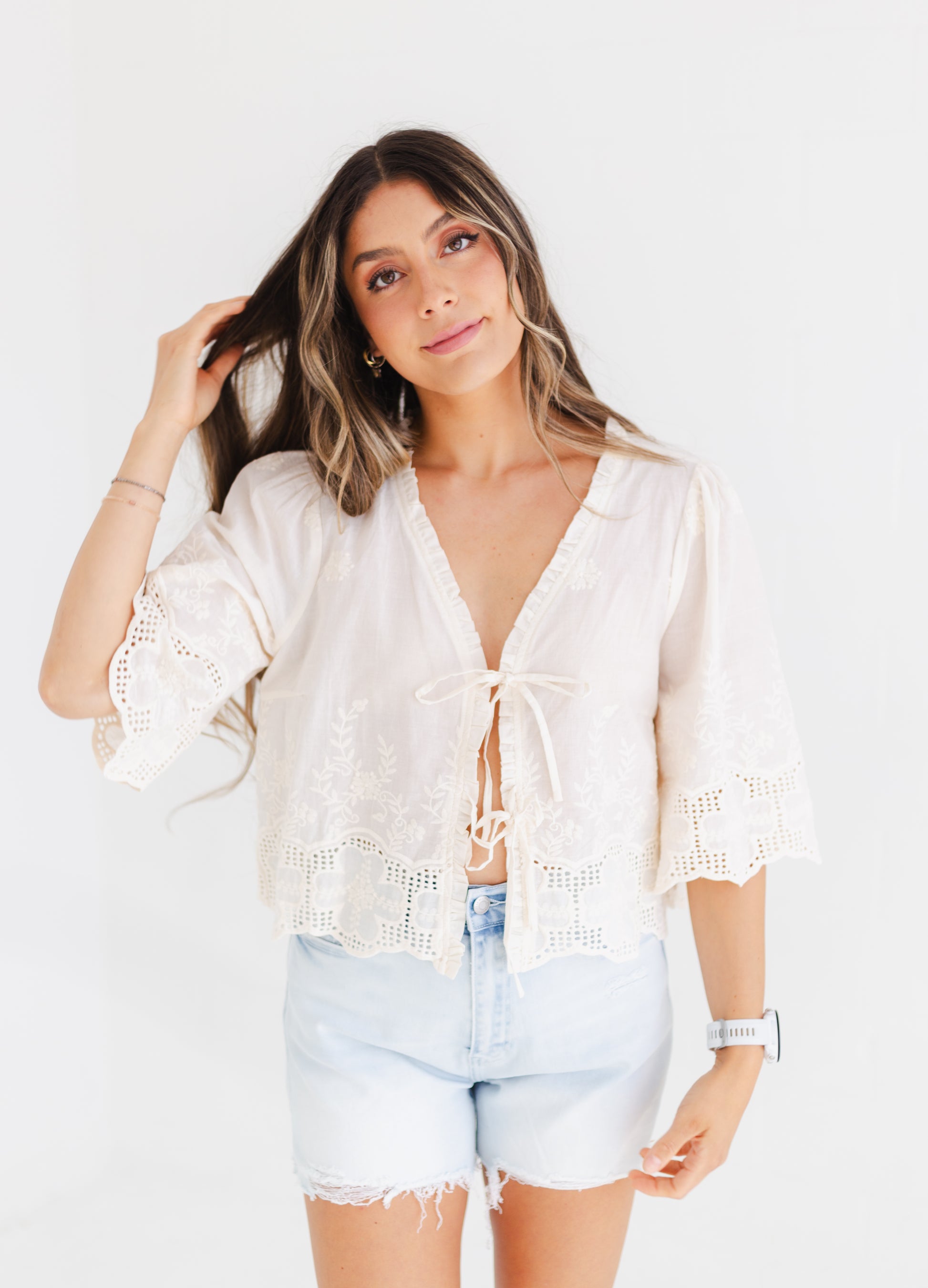 This Ivory Floral Embroidery Tie Front Blouse brings fresh, feminine vibes with delicate floral stitching and a charming scallop edge. The relaxed fit and 3/4 flutter sleeves keep it breezy and cute, while the tie front adds a playful, trendy touch perfect for casual days or brunch dates.
