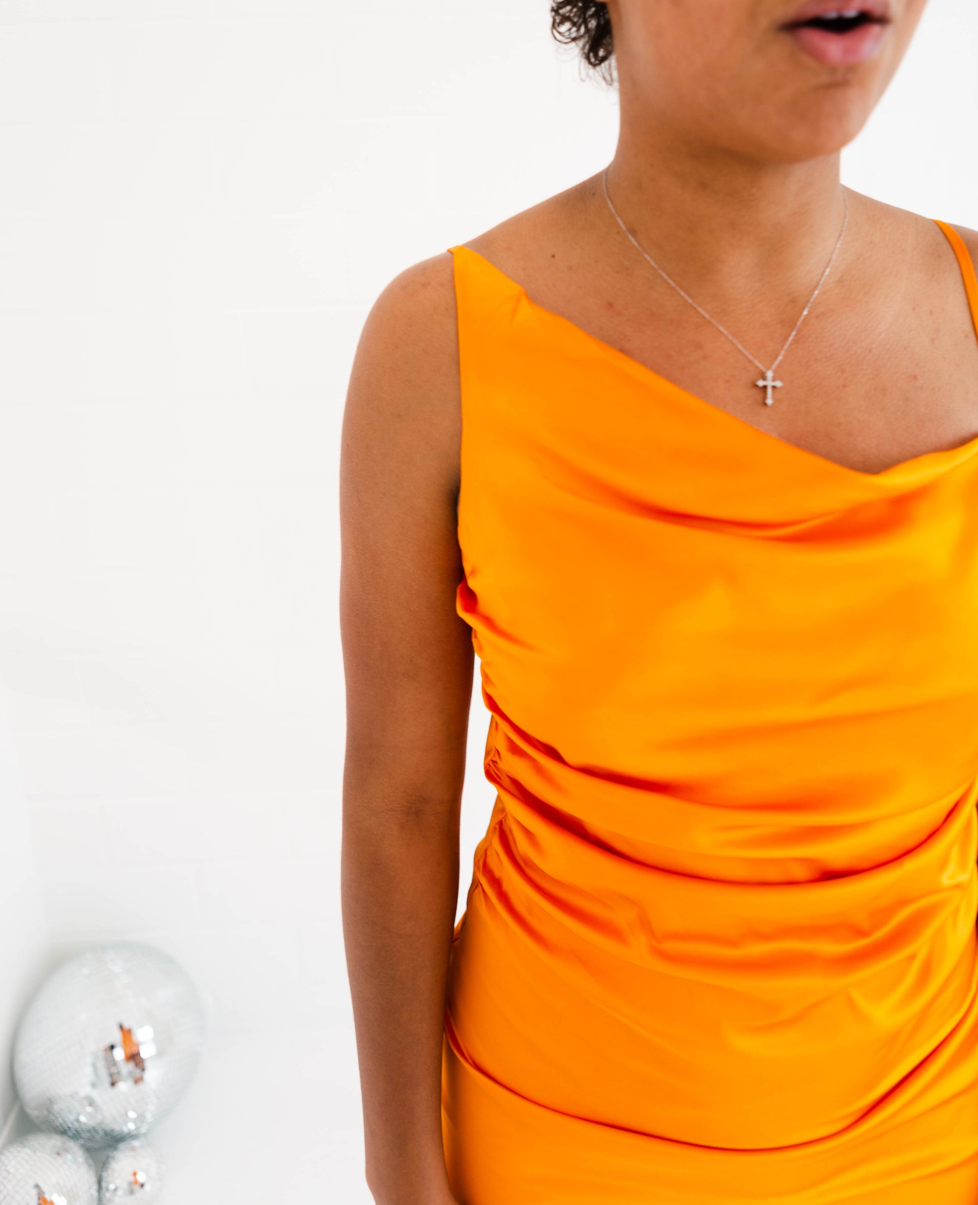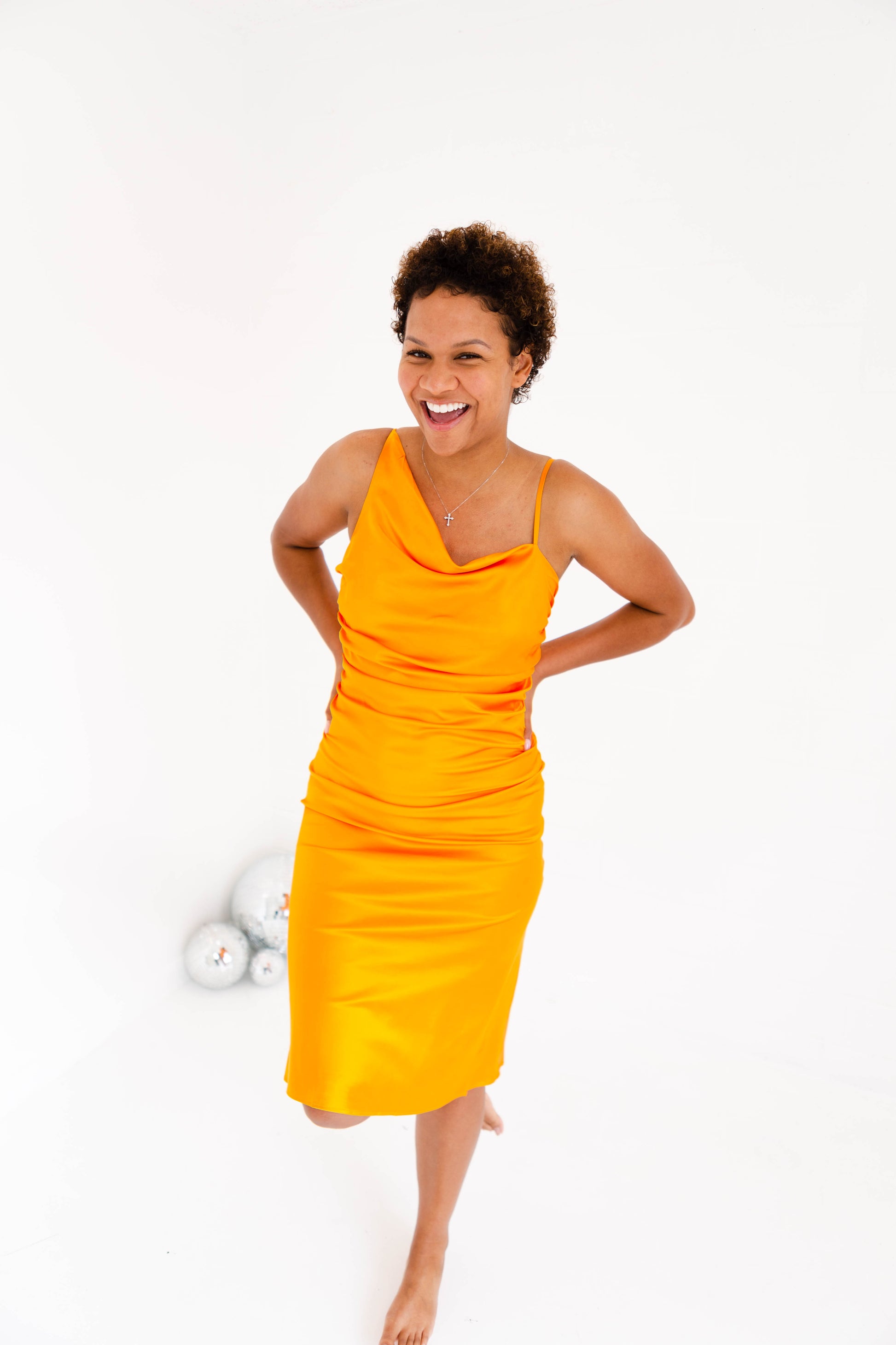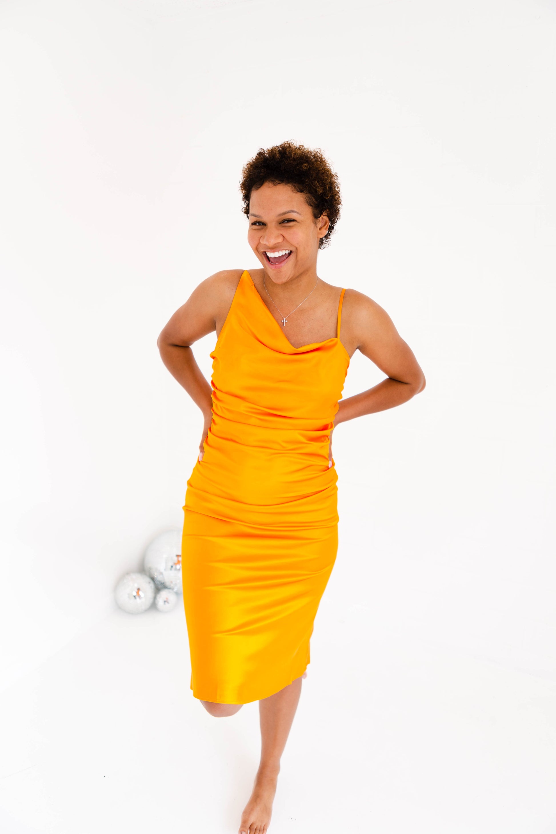 Introducing the Pierre Tangerine Gathered Dress - perfect for all your summery soirees! This swoon-worthy midi features chic satin fabric, adjustable straps, and a fit that will make you feel like a day-one date night queen. Natalia is 5'7" and loved it so much she got it in a small - so get ready to wow 'em!