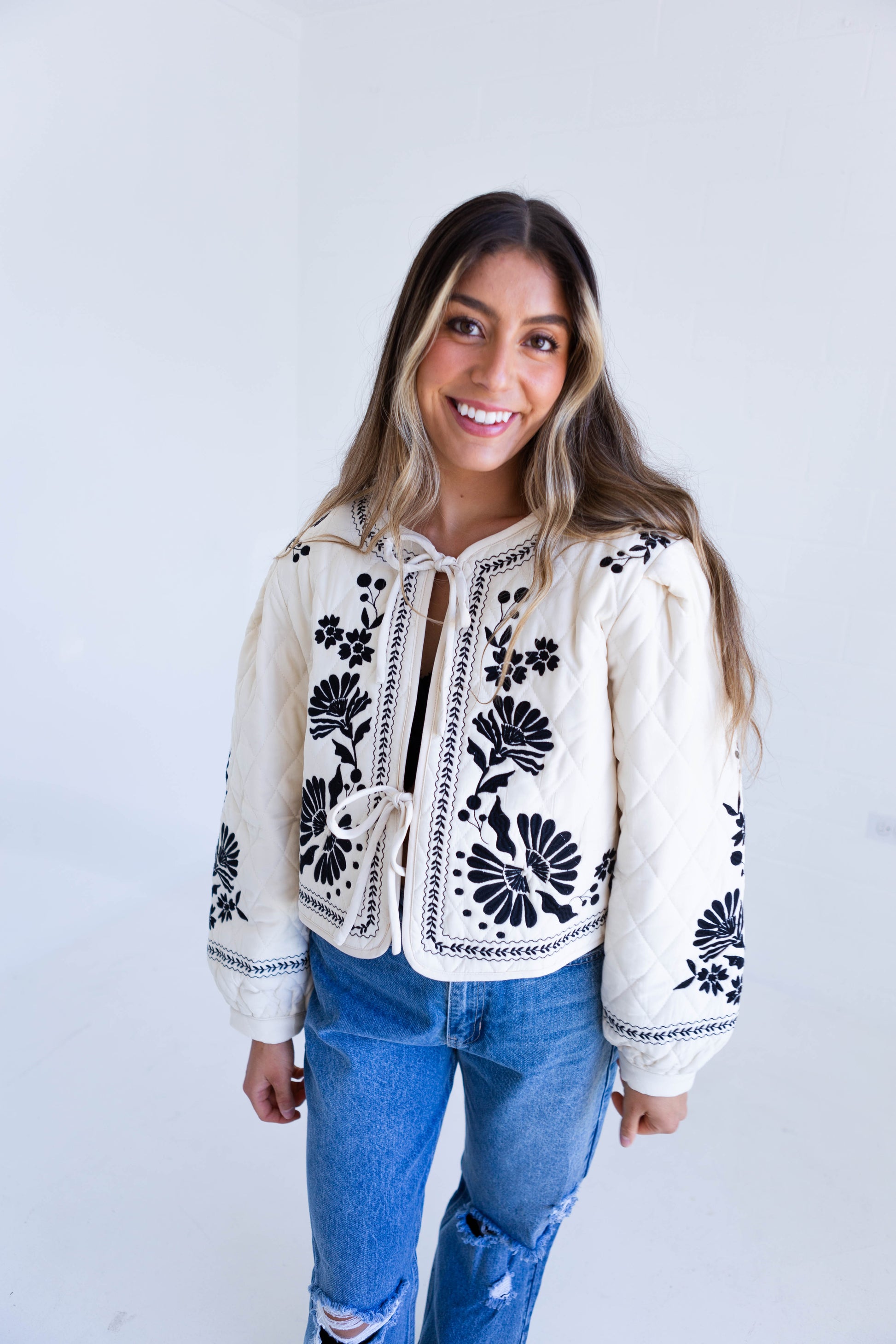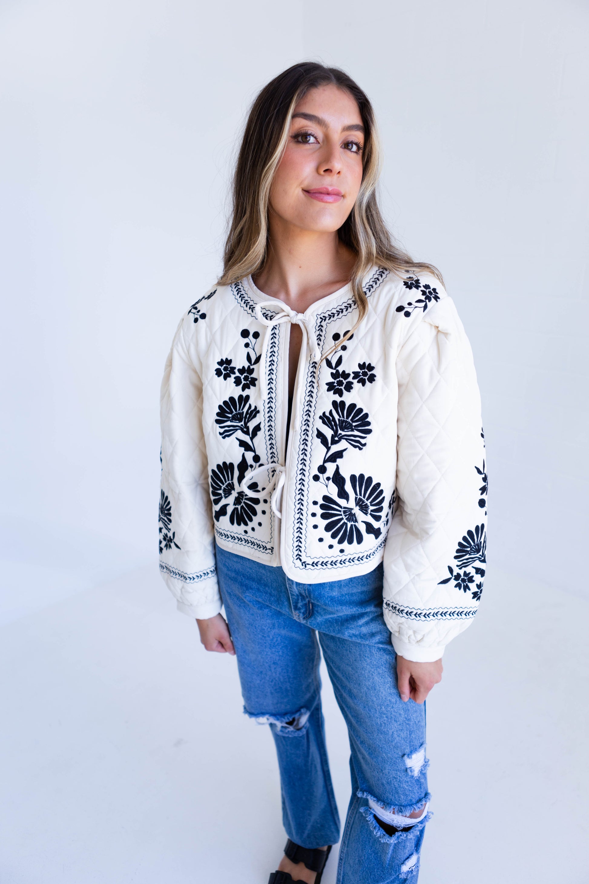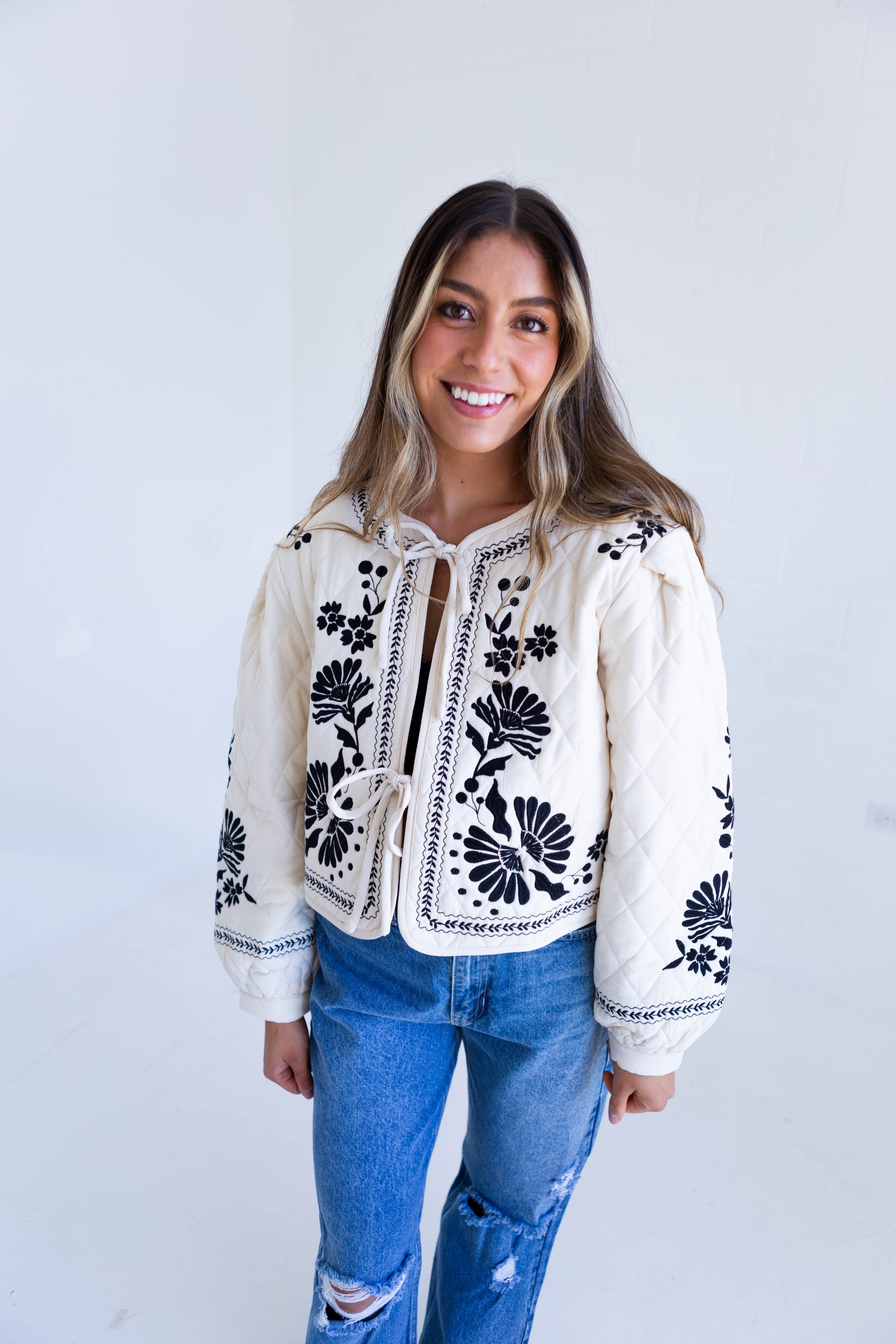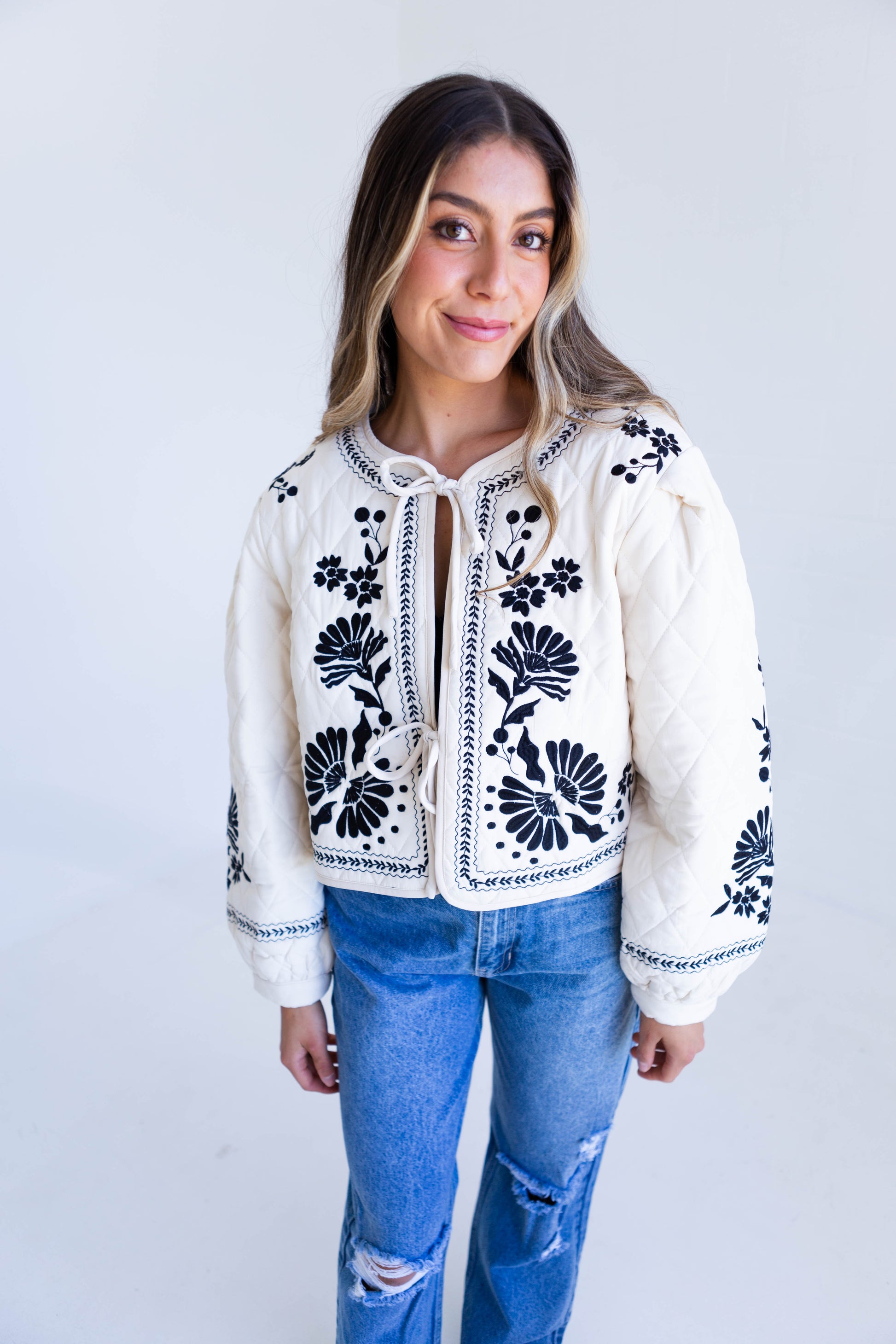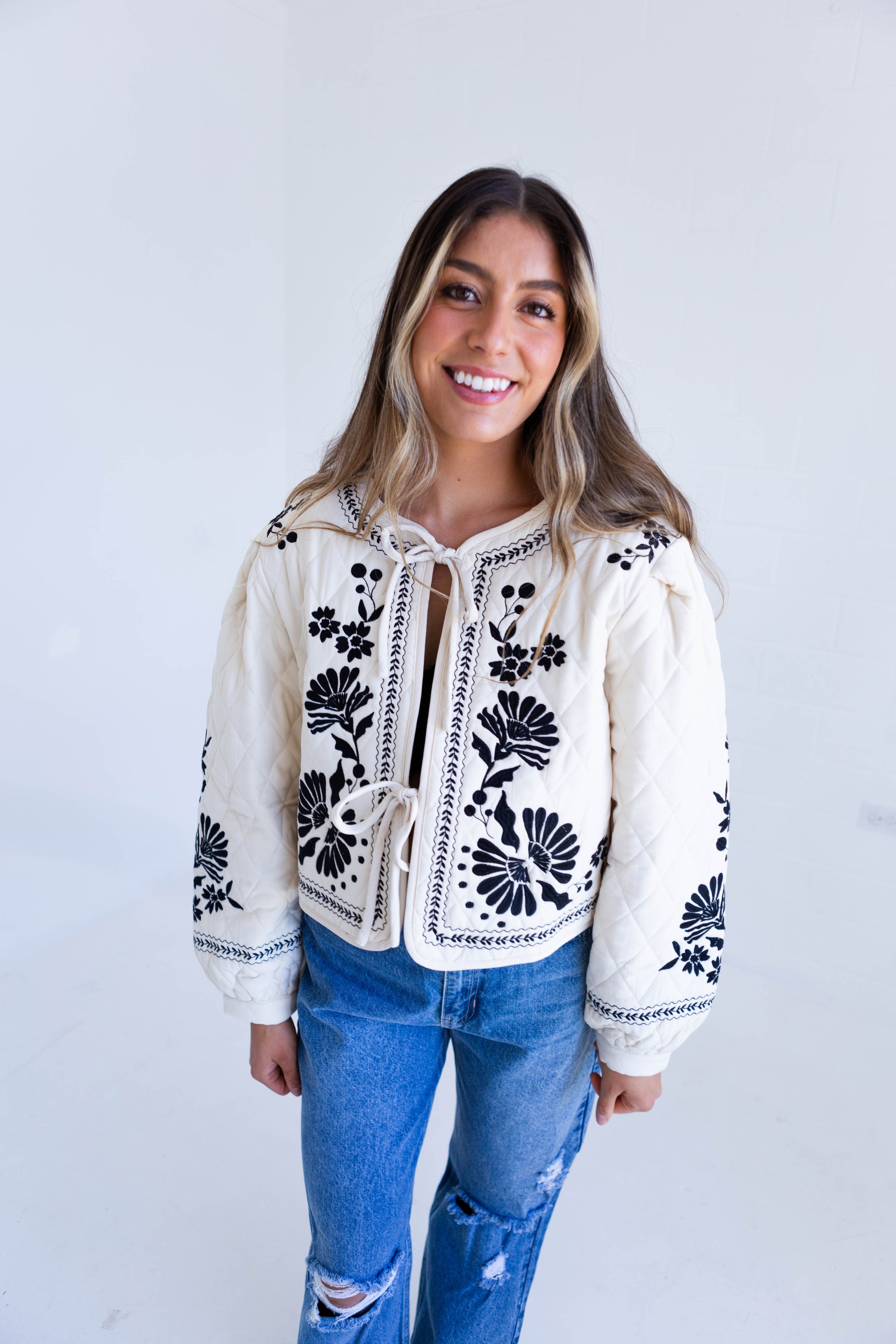 This Light Taupe Embroidered Quilted Jacket is the perfect holiday must-have. With its bow tie closure, it adds a touch of luxury to any outfit. Lightweight and comfortable, it's perfect for any girly fun occasion. Ashley is 5'5" wearing the small.