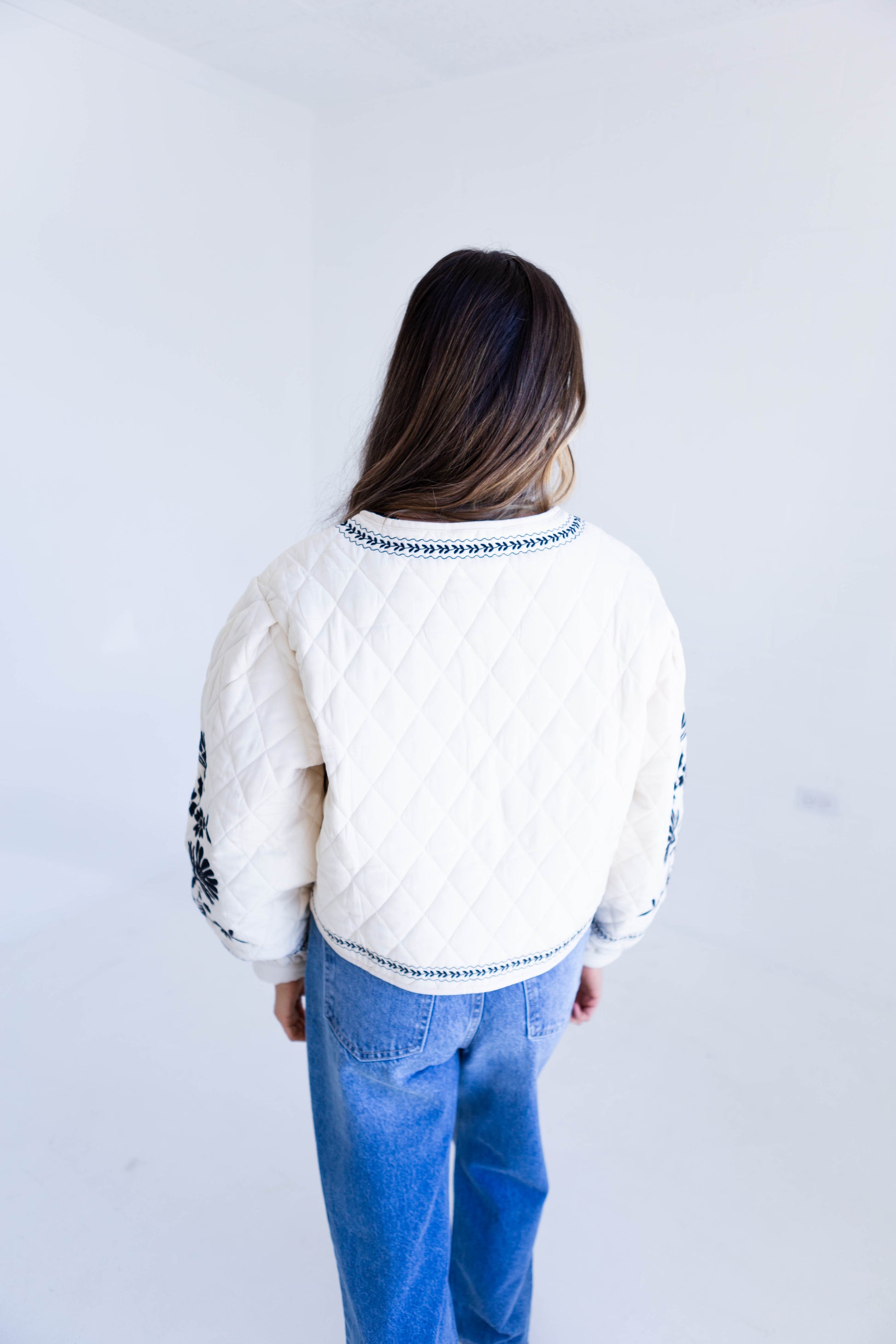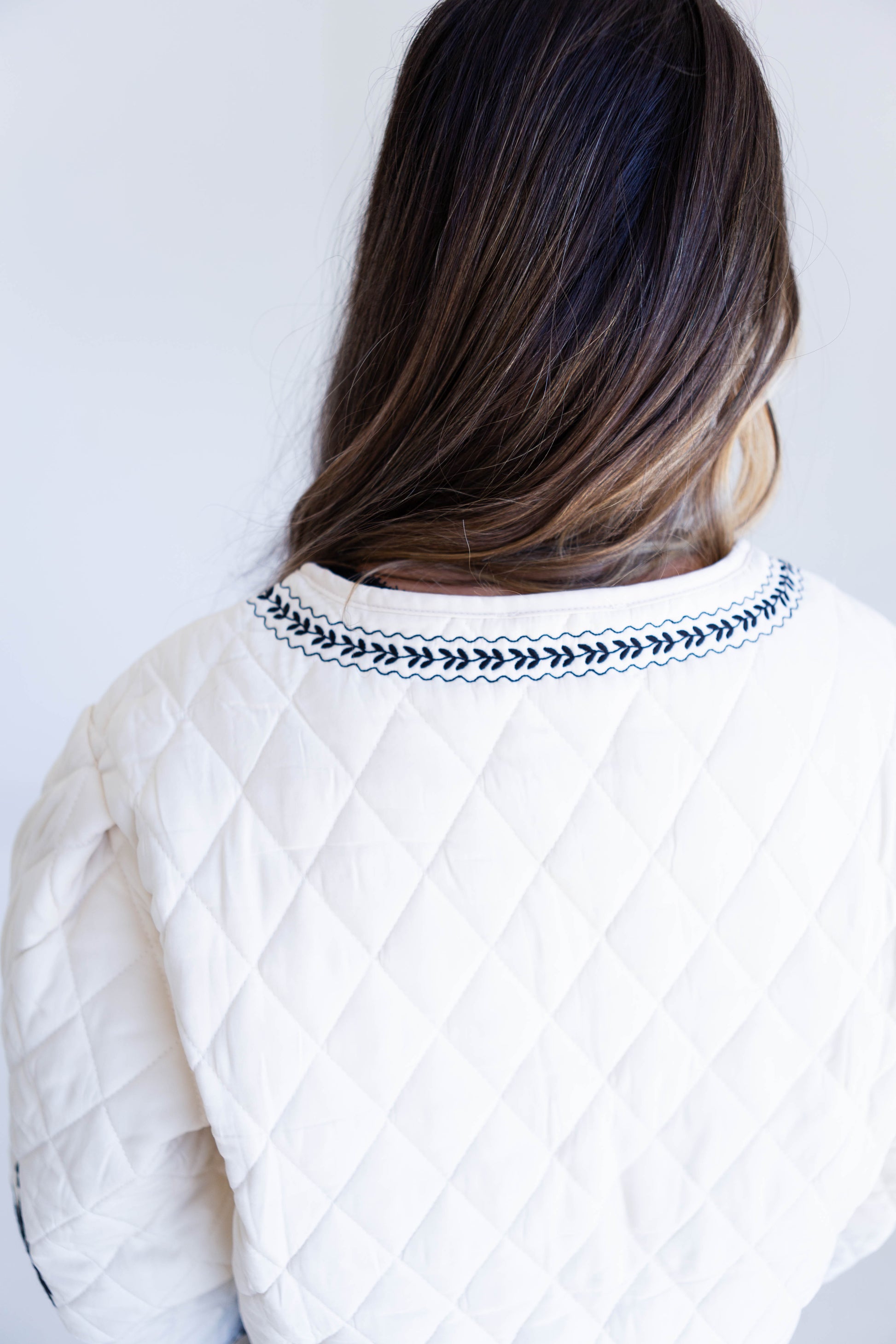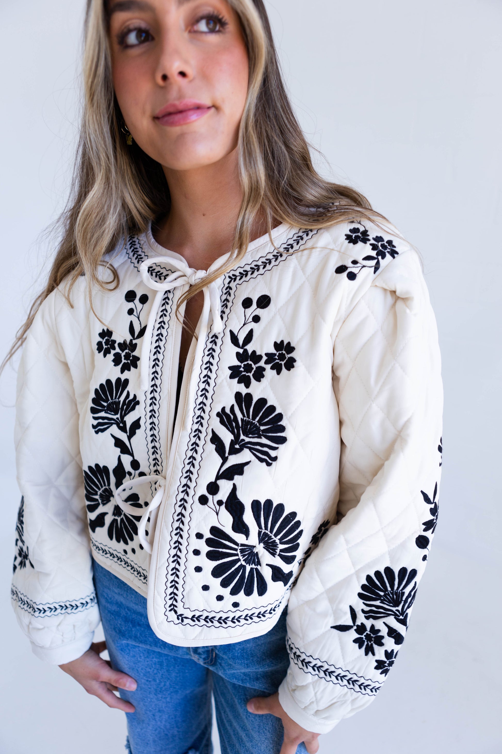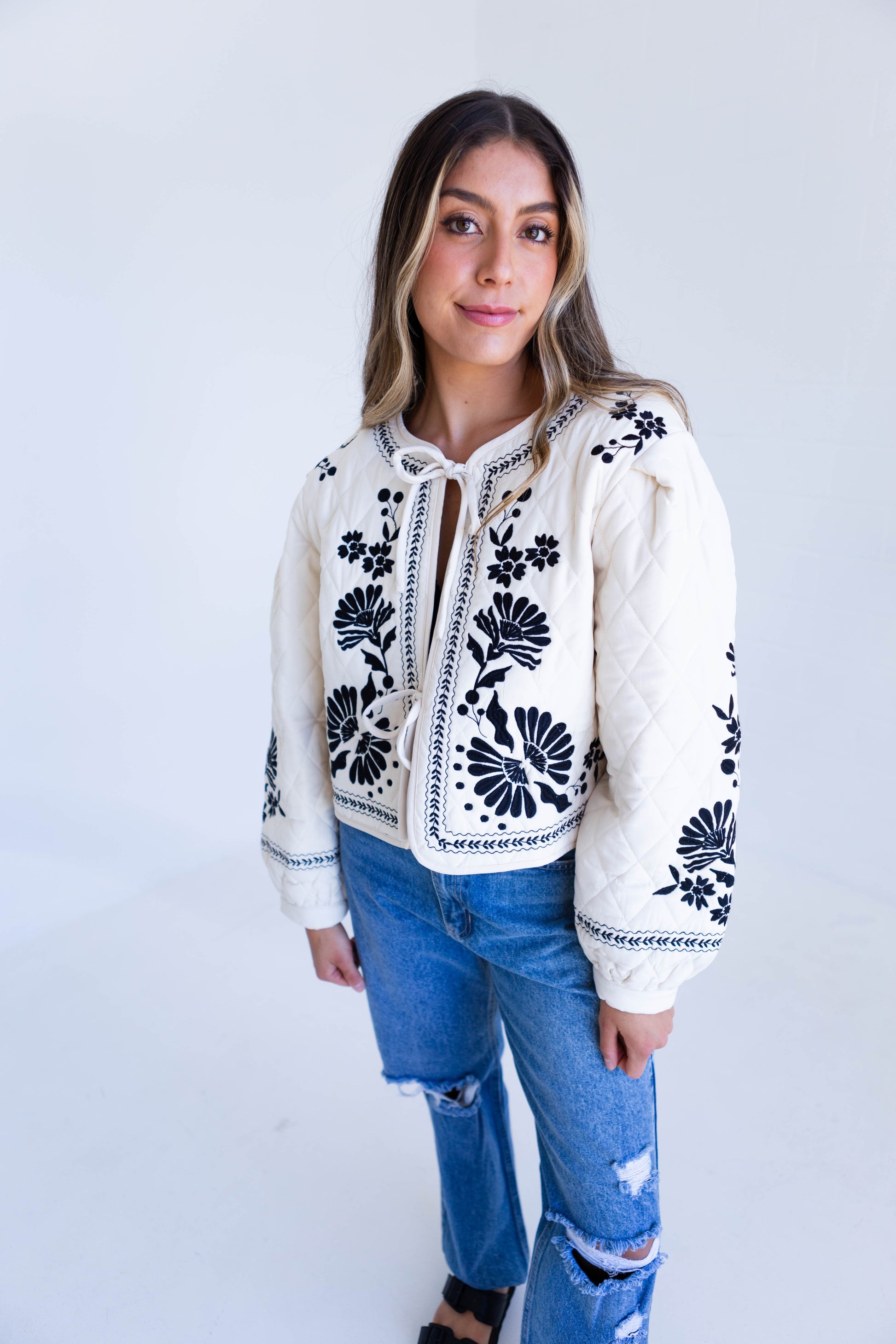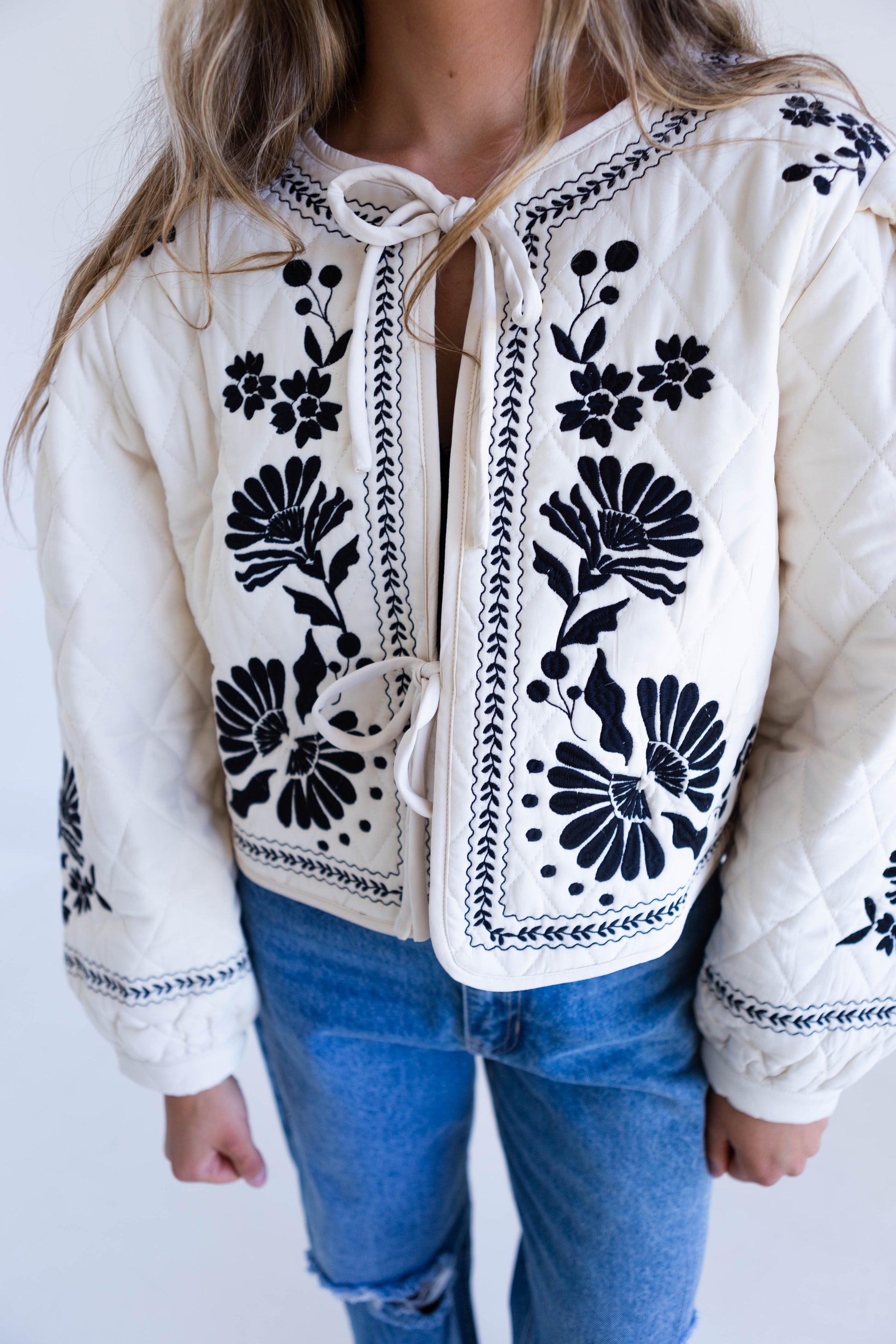 This Light Taupe Embroidered Quilted Jacket is the perfect holiday must-have. With its bow tie closure, it adds a touch of luxury to any outfit. Lightweight and comfortable, it's perfect for any girly fun occasion. Ashley is 5'5" wearing the small.
