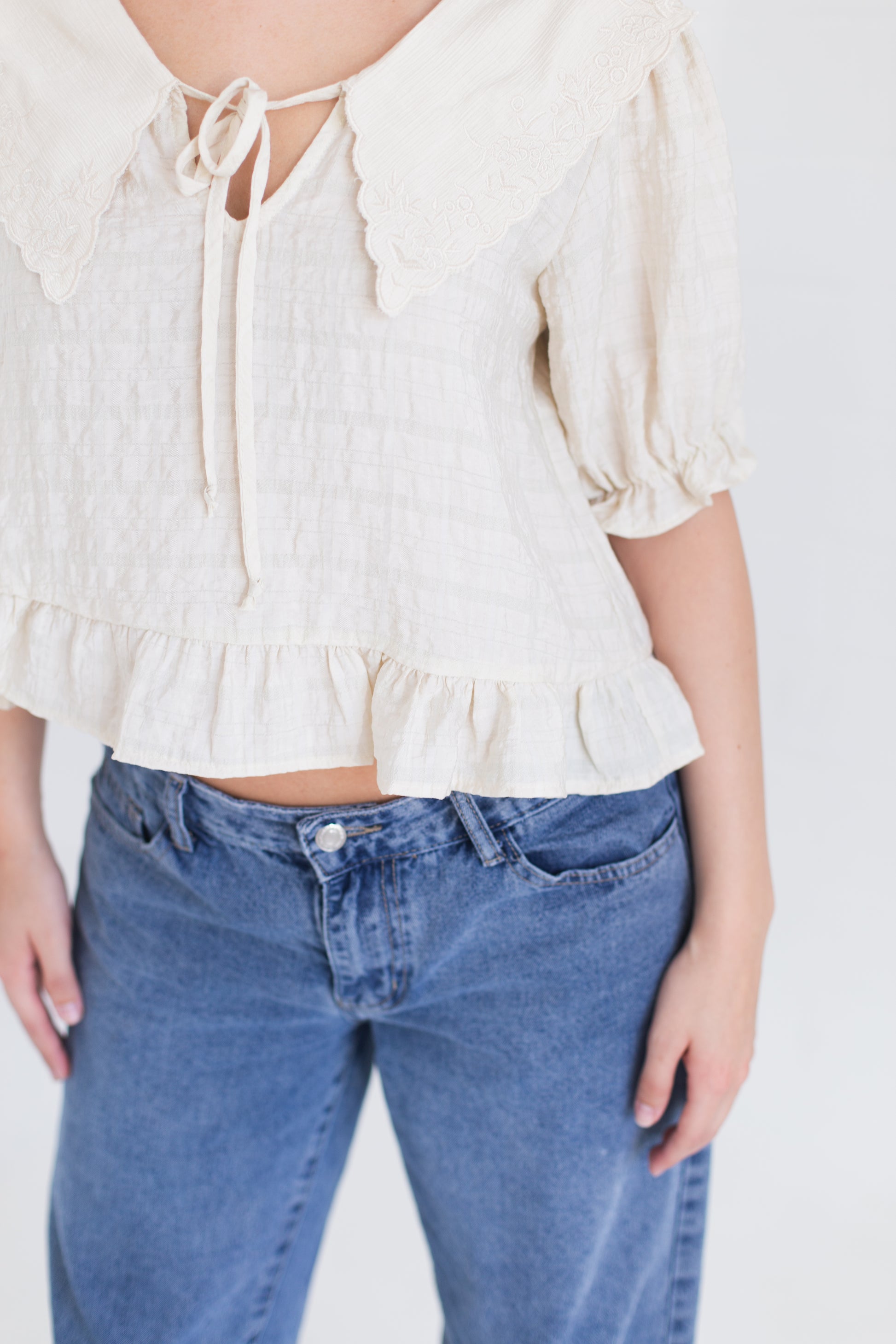 This Natural Fablewood Embroidered Collar Top features a lightweight woven blend of rayon and Tencel for a soft, breathable feel. Its wide collar and delicate embroidery add a charming, vintage-inspired touch, while the V-neck and front tie strap detail bring playful femininity. Perfect for sunny days, this short sleeve blouse pairs effortlessly with your favorite jeans or skirts for a fresh, youthful look.