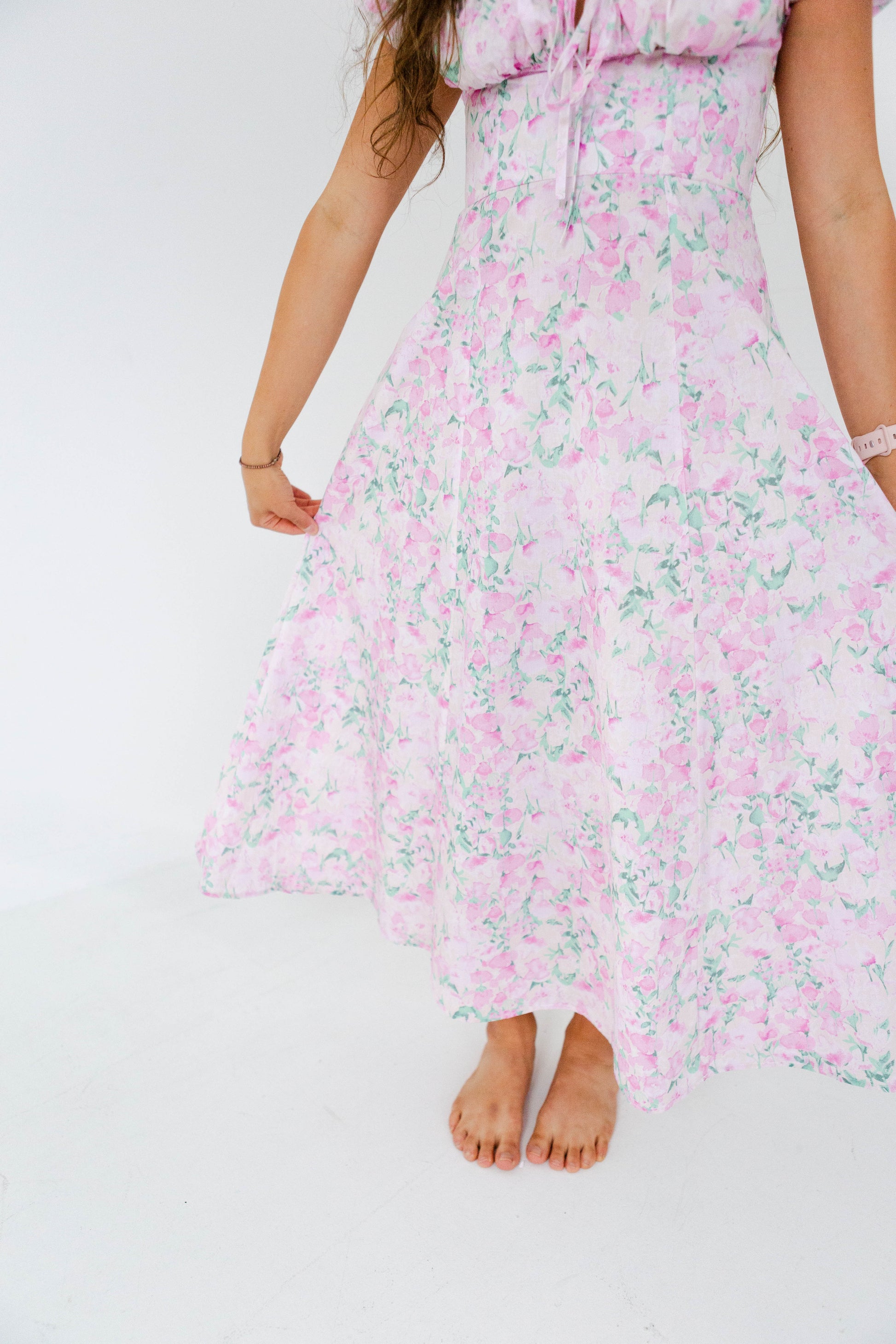 Indulge in luxury with our Pink Floral Printed Puff Sleeve Midi Dress. The corset top, boned for structure, and tie bust provide a flattering silhouette, while the puff sleeve adds a touch of sophisticated femininity. This elegant midi dress is perfect for any occasion. Ashley is 5'5" wearing a small.
