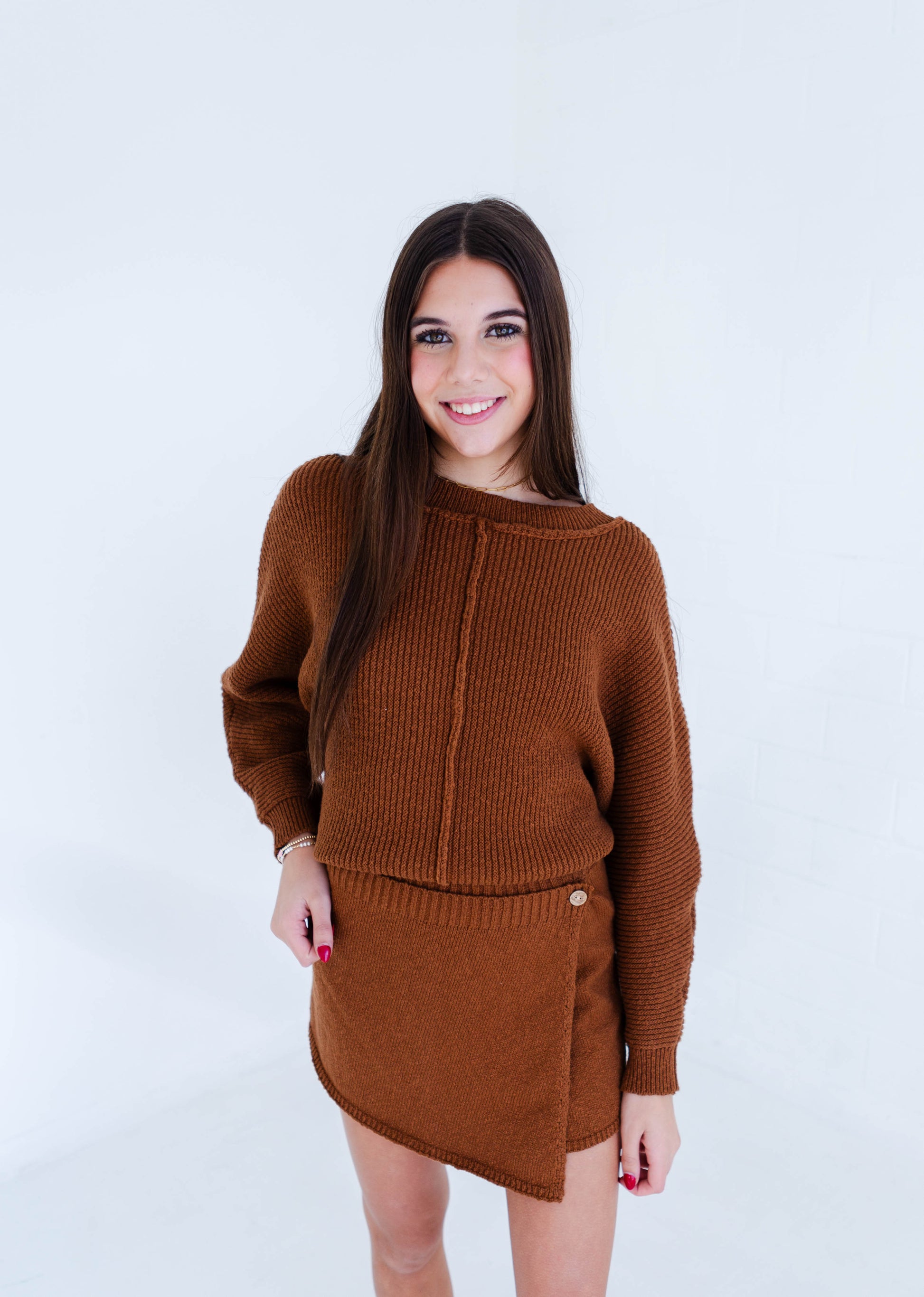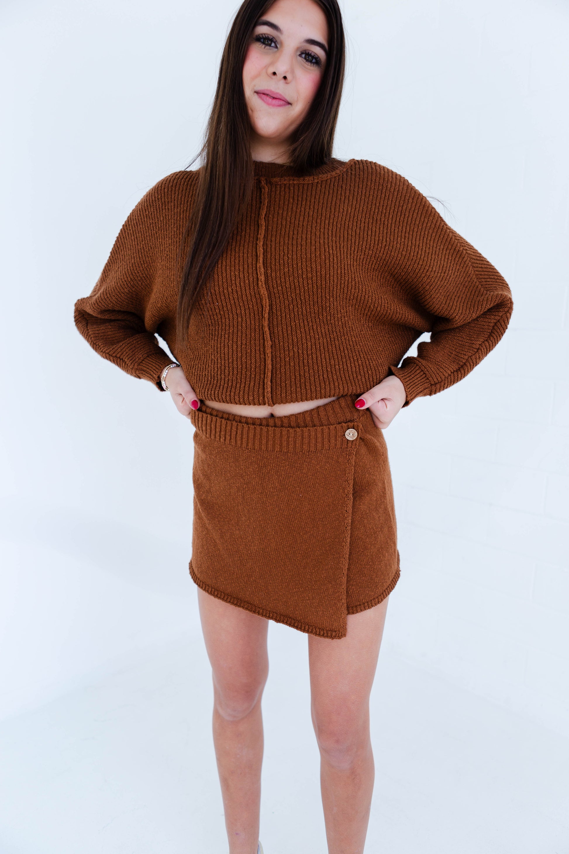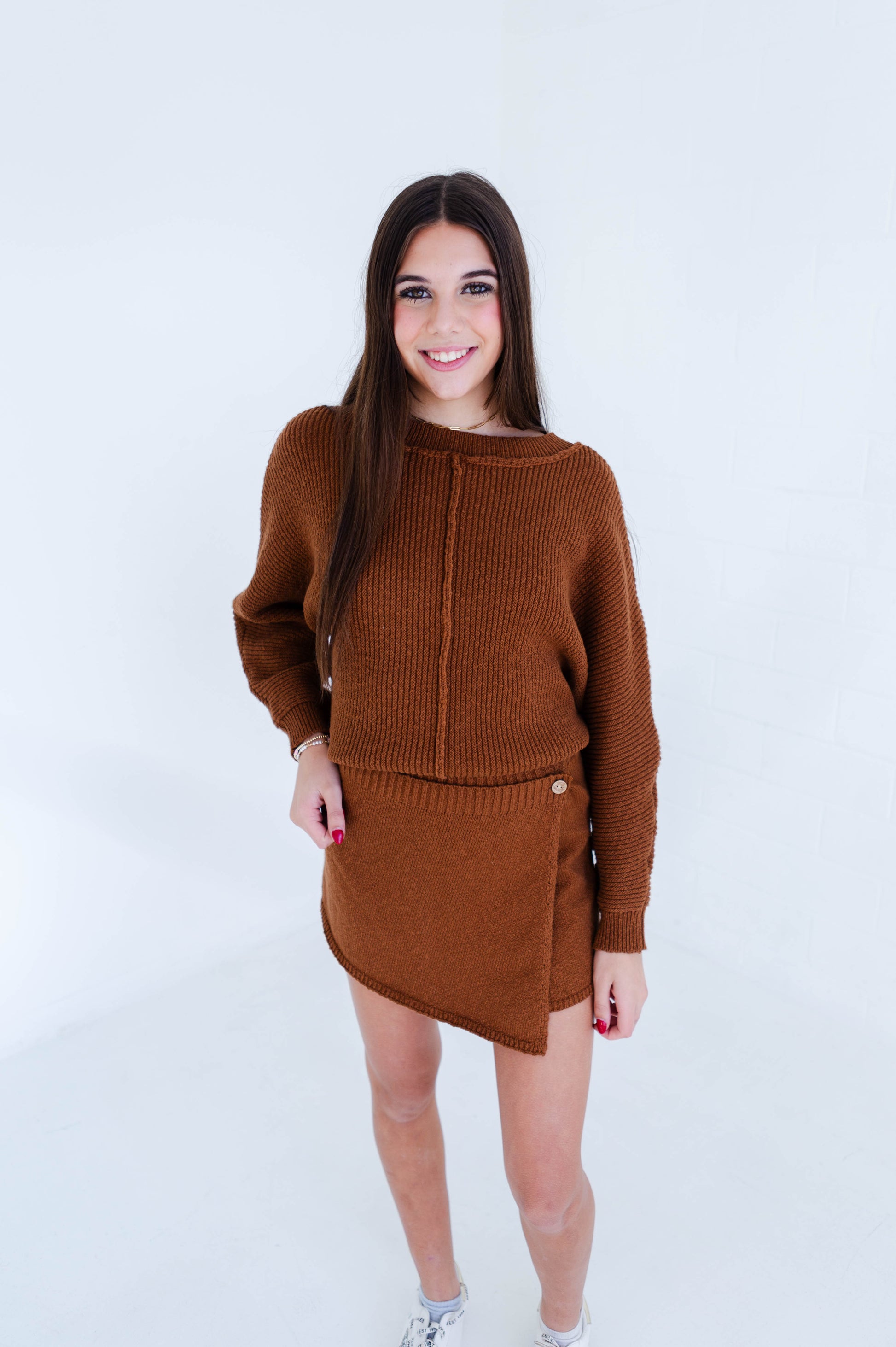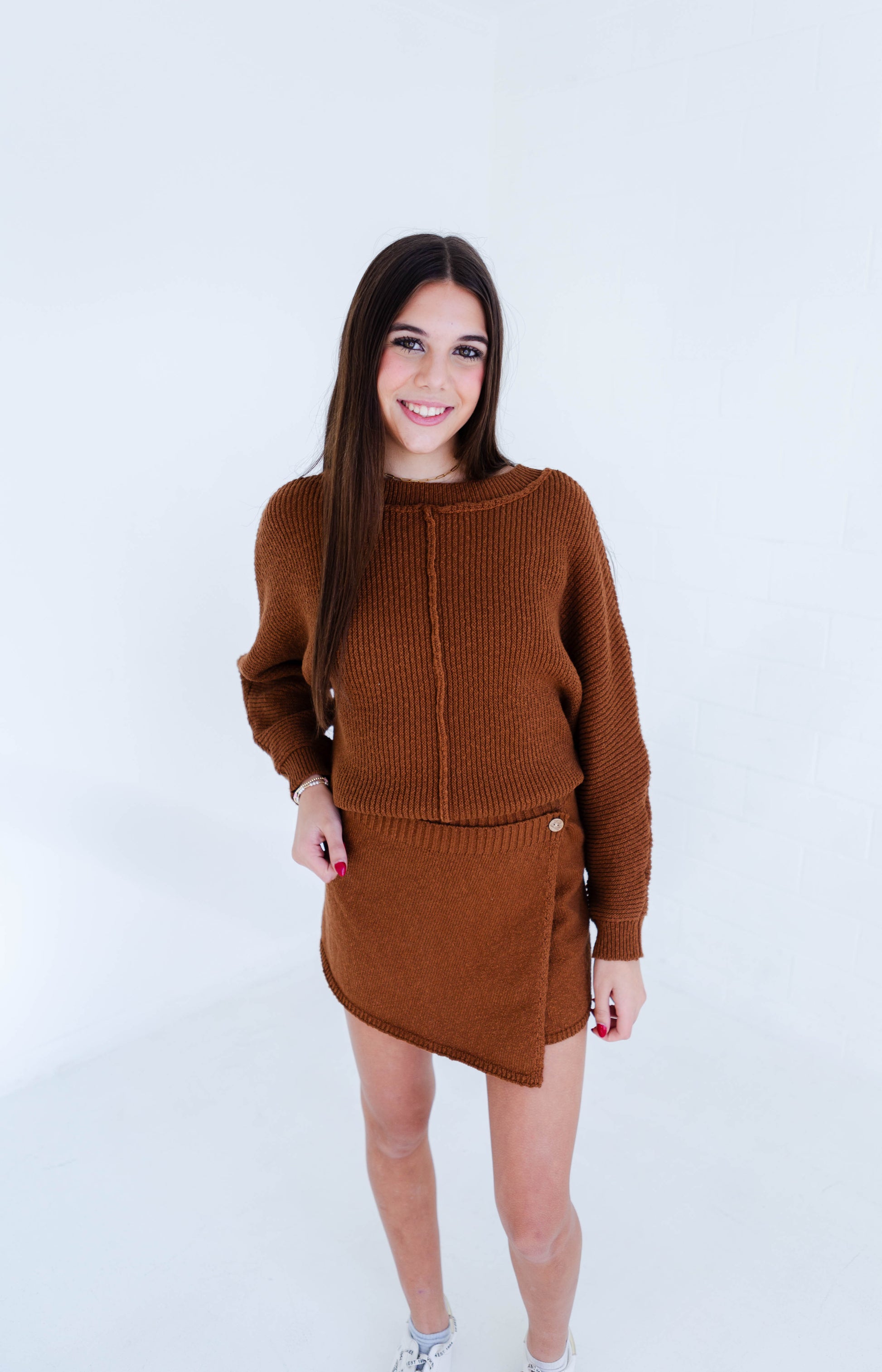 This Rust Sweater & Skort Set is perfect for any occasion! The knit sweater and skirt provide a cozy and stylish look, while the button closure on the skort adds a touch of charm. With reverse stitching on the sweater, you'll stand out in comfort and style. KK is 5'5" wearing the small.