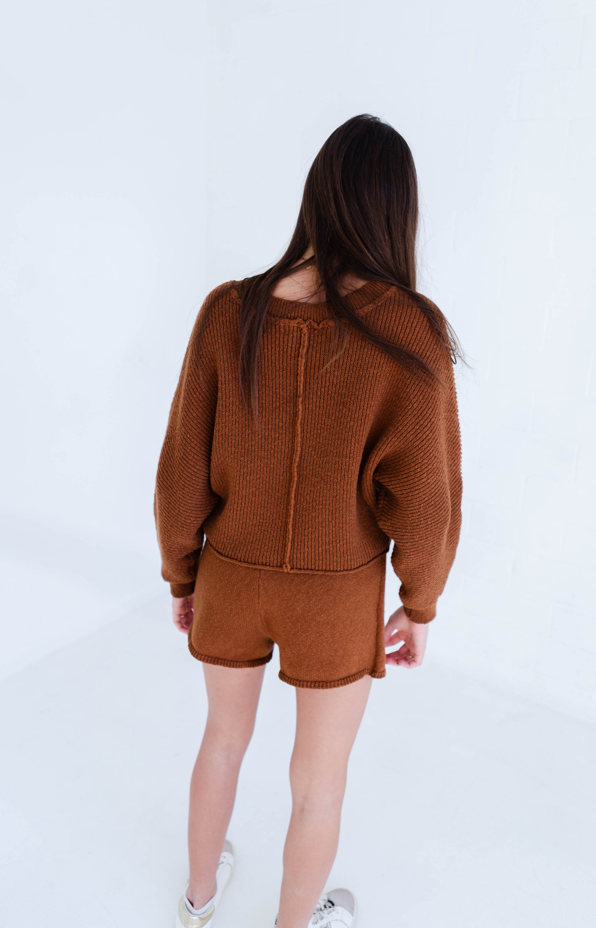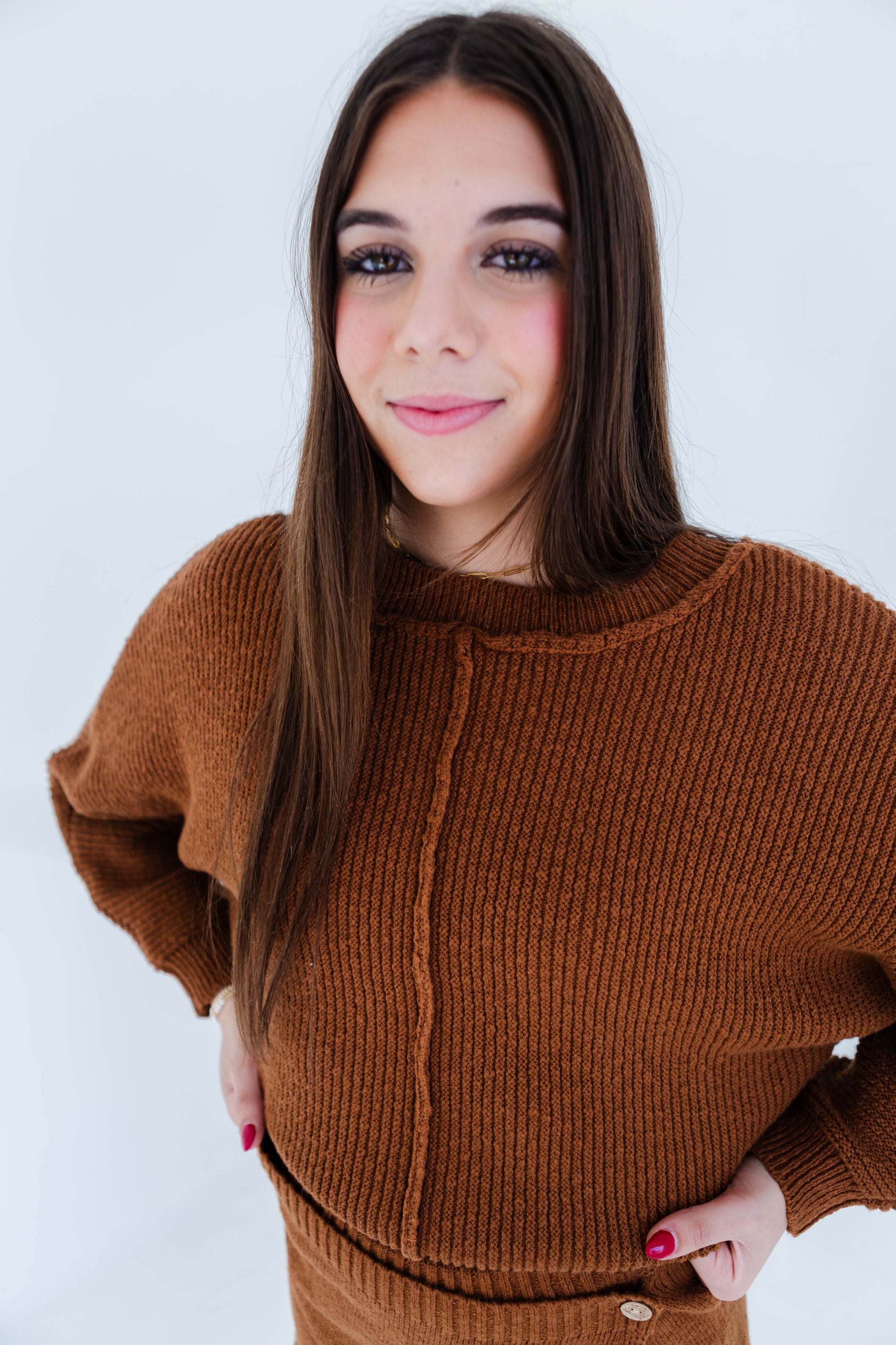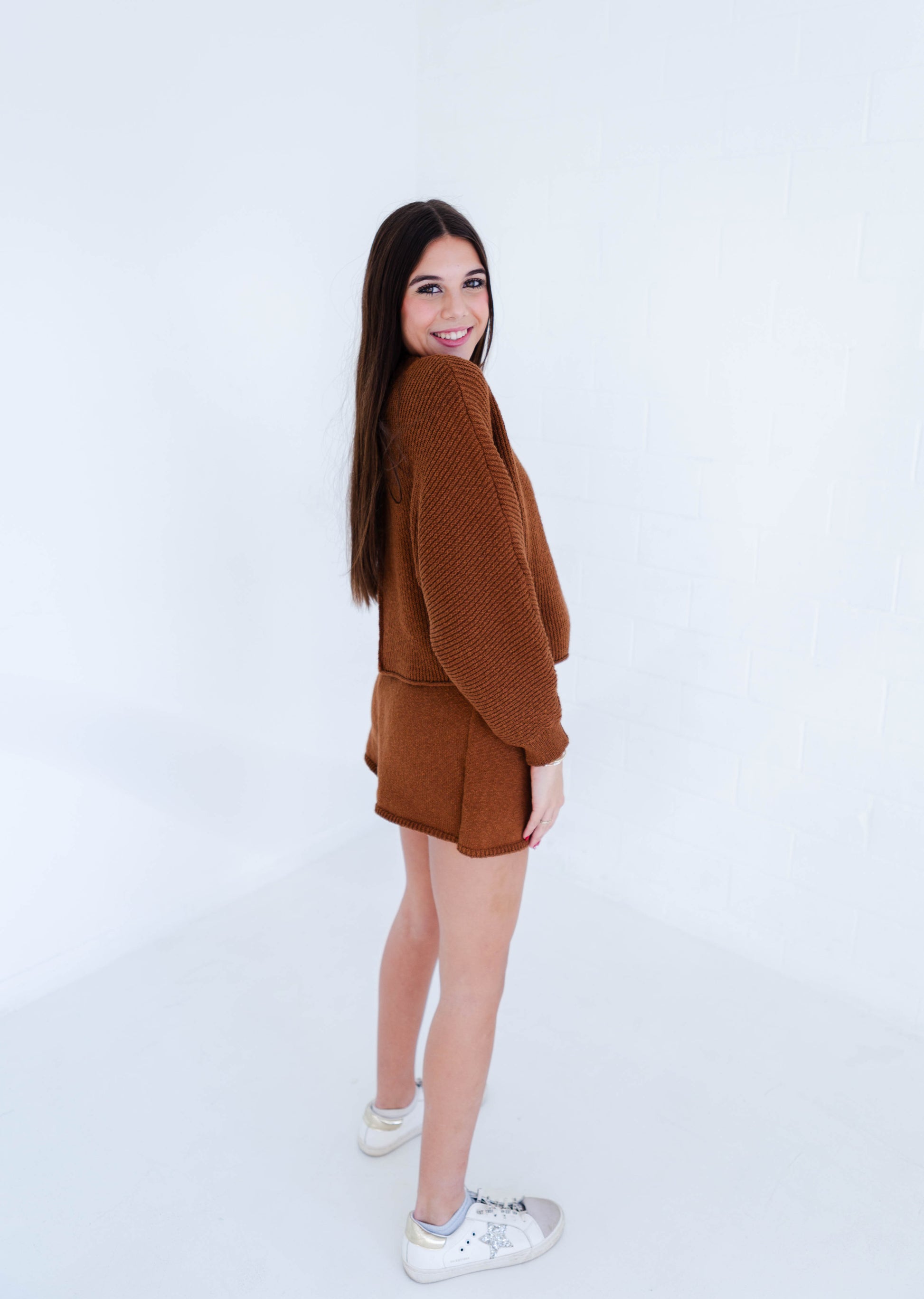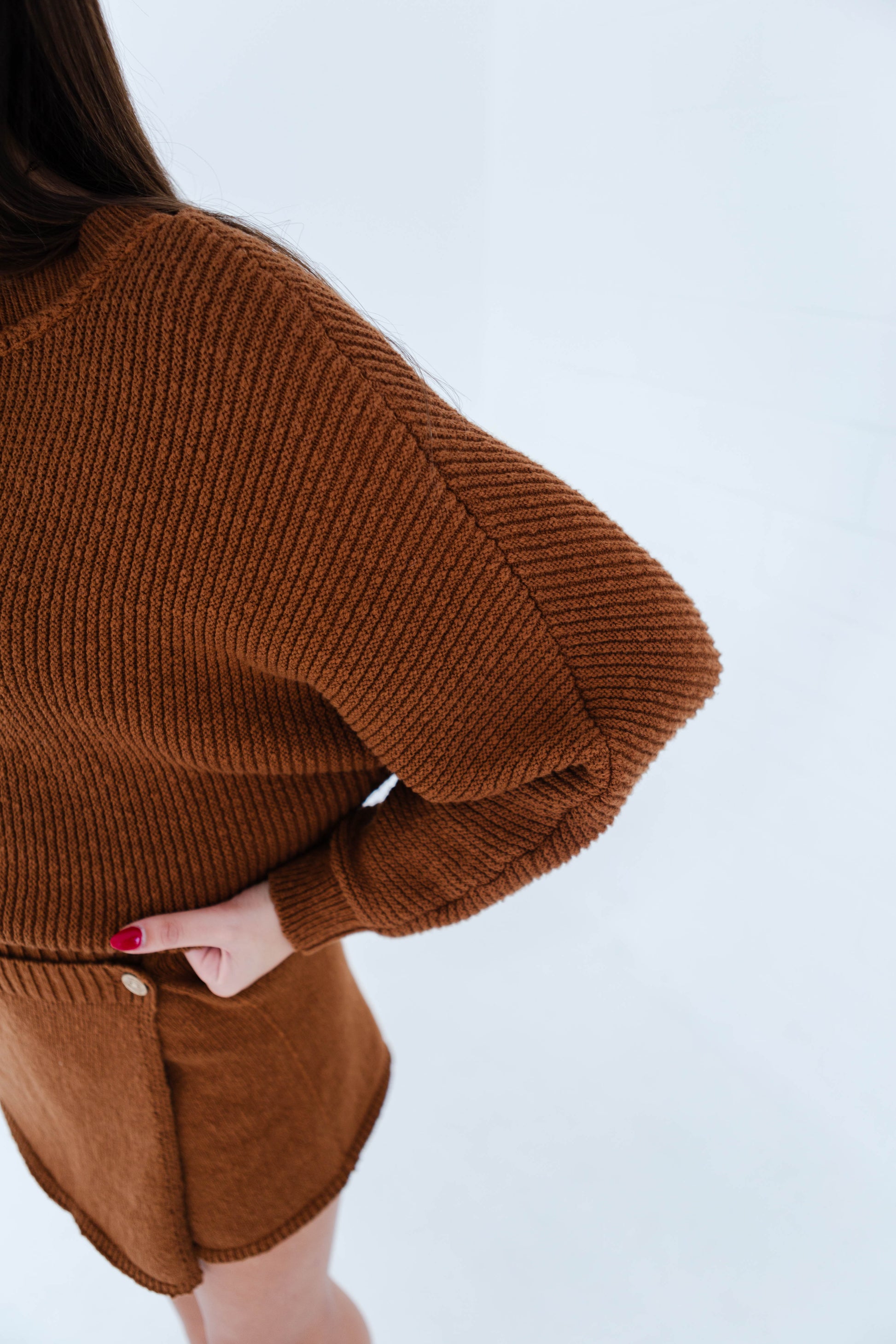 This Rust Sweater & Skort Set is perfect for any occasion! The knit sweater and skirt provide a cozy and stylish look, while the button closure on the skort adds a touch of charm. With reverse stitching on the sweater, you'll stand out in comfort and style. KK is 5'5" wearing the small.