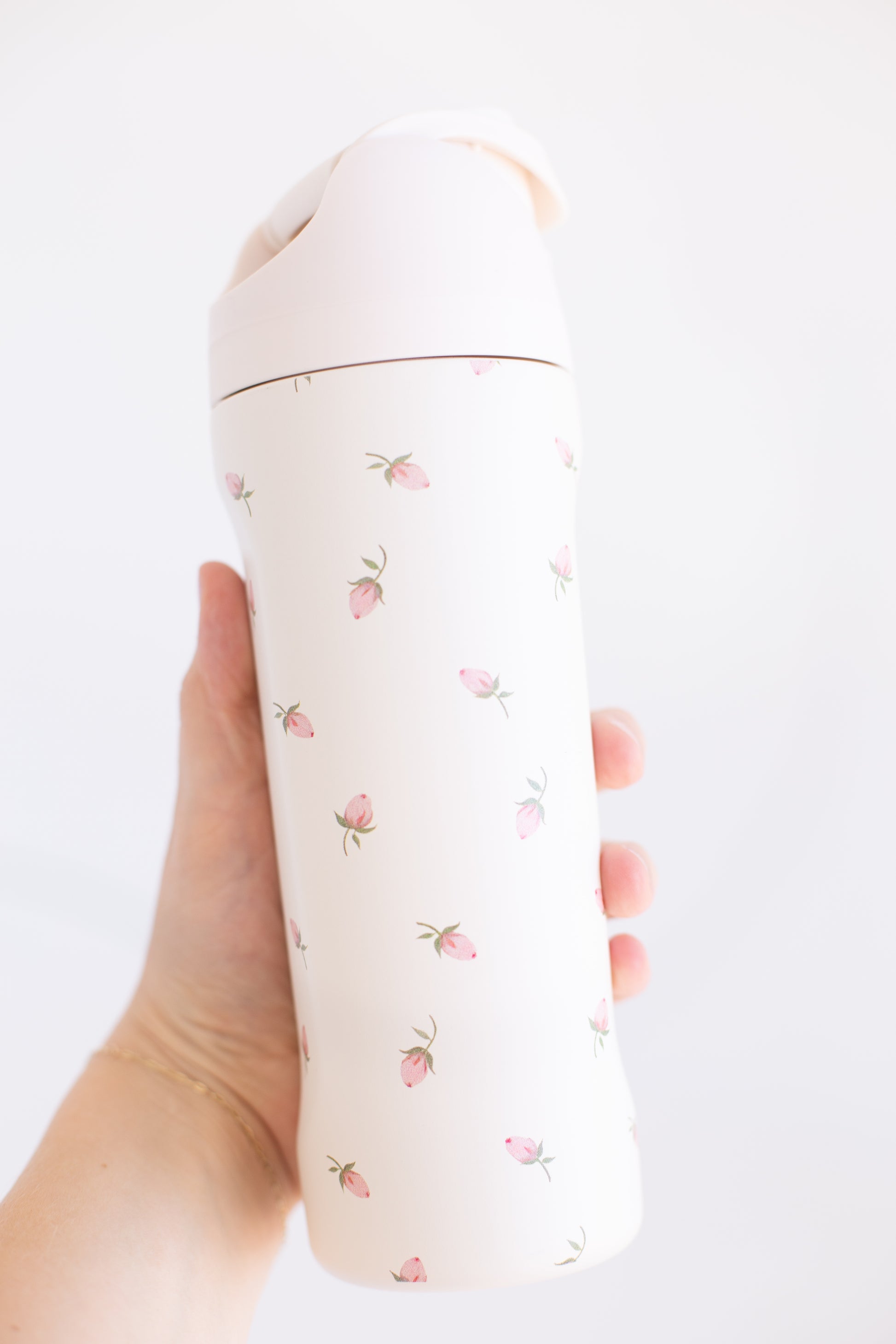 Quench your thirst with our floral water bottle featuring a snap closure lid and straw for easy sipping. Stay refreshed on the go with this sweet accessory. (Water not included, unfortunately.)