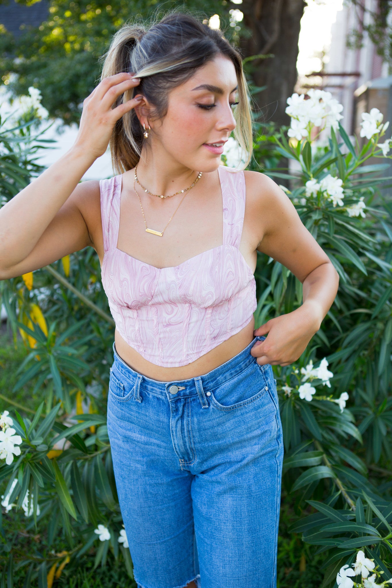 Model: 5'5" wearing the small Product Description: - Crop - Stretch Material on back