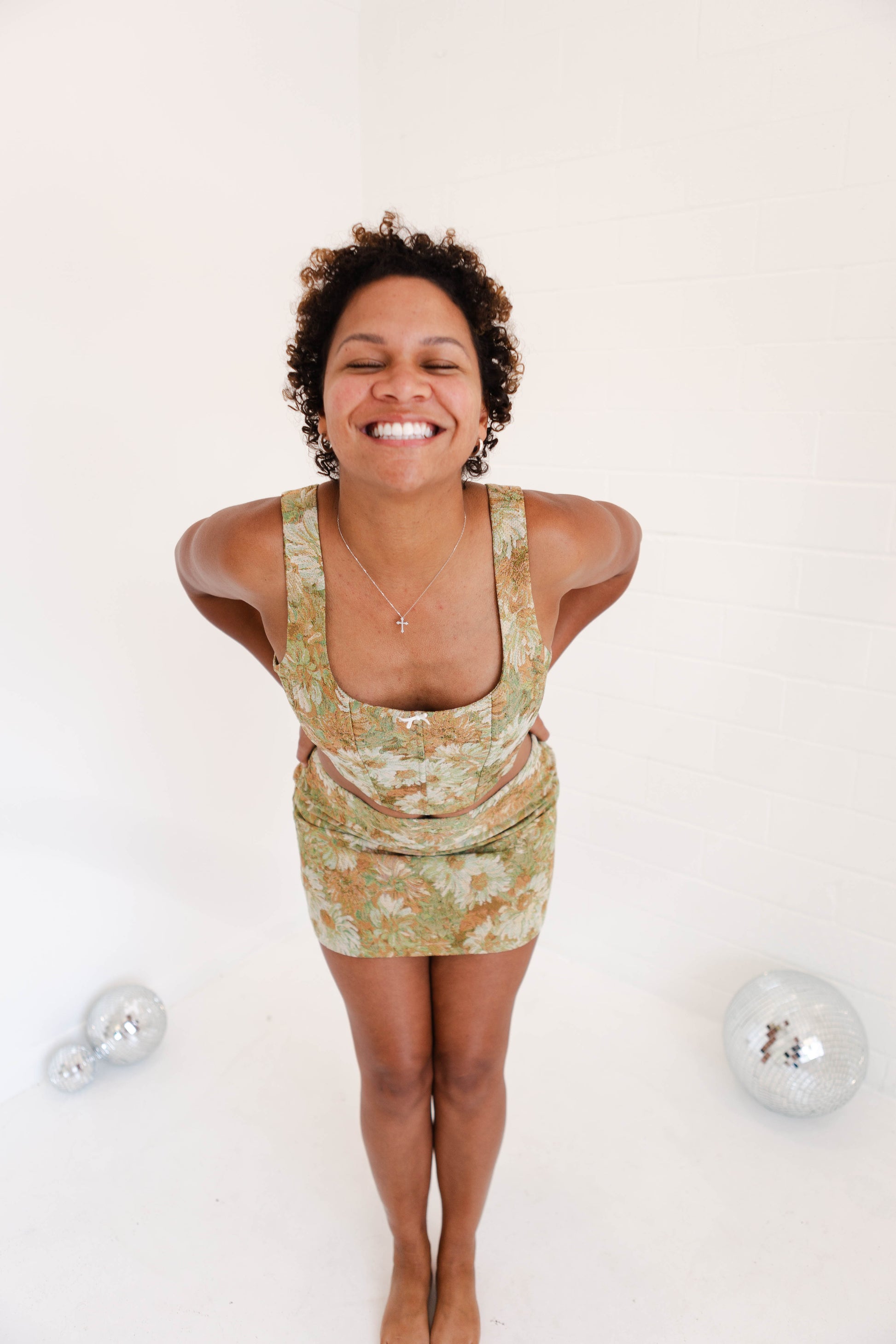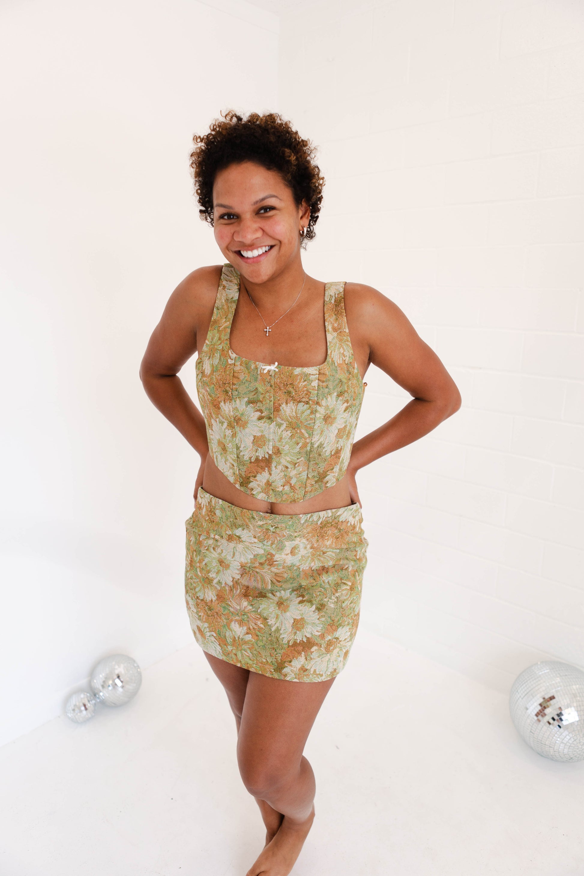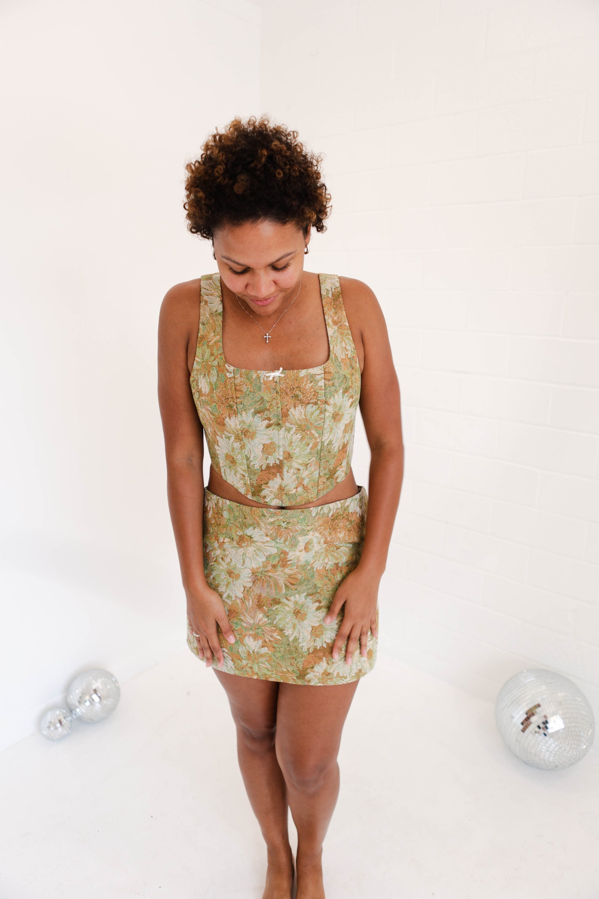 Bring out your inner bohemian fashionista with The Jacquard Set! With a modern twist on a vintage floral print, the combo of green and orange will have you looking like a boho queen. Add this fall wonder to your wardrobe for a style-packed look! The top features a boned corset structure that zips up in the back and the skirt is a mini skirt with a zip up fastener in the back. Natalia is wearing the medium top and medium skirt and is 5'7" for reference.