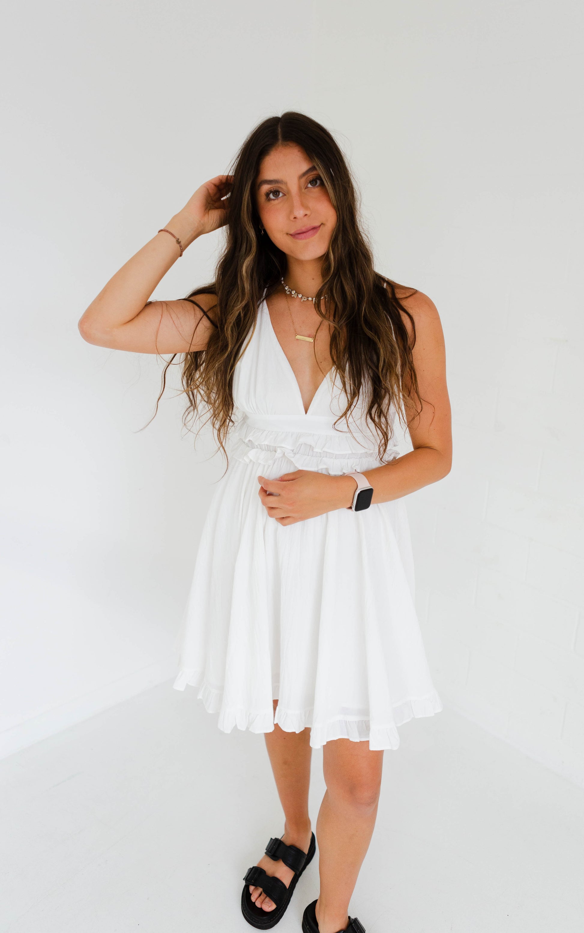 Elevate your summer wardrobe with our White Ruffled Detailed Camisole Dress. This v neck mini dress features a tie back for a perfect fit and exudes an air of refinement. Embrace the season in style with this must-have addition to your exclusive collection. Ashley is 5'5" wearing a small.