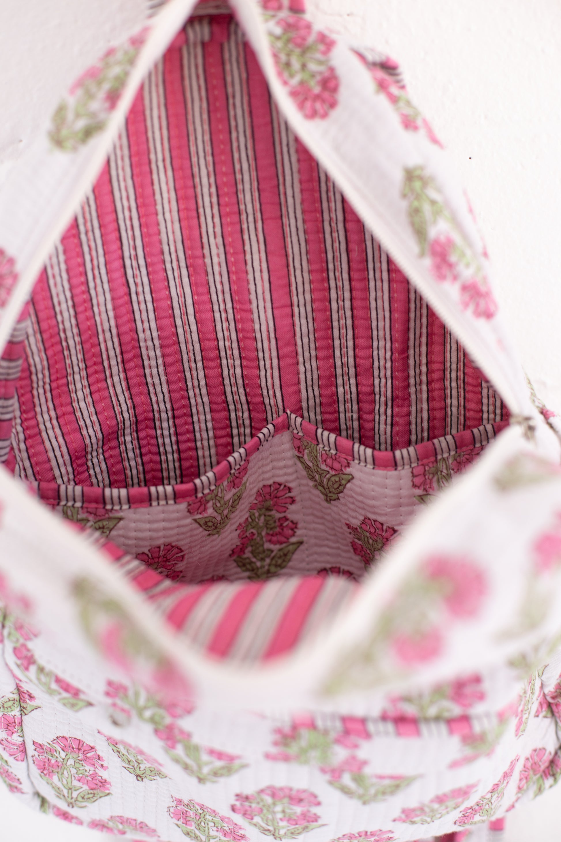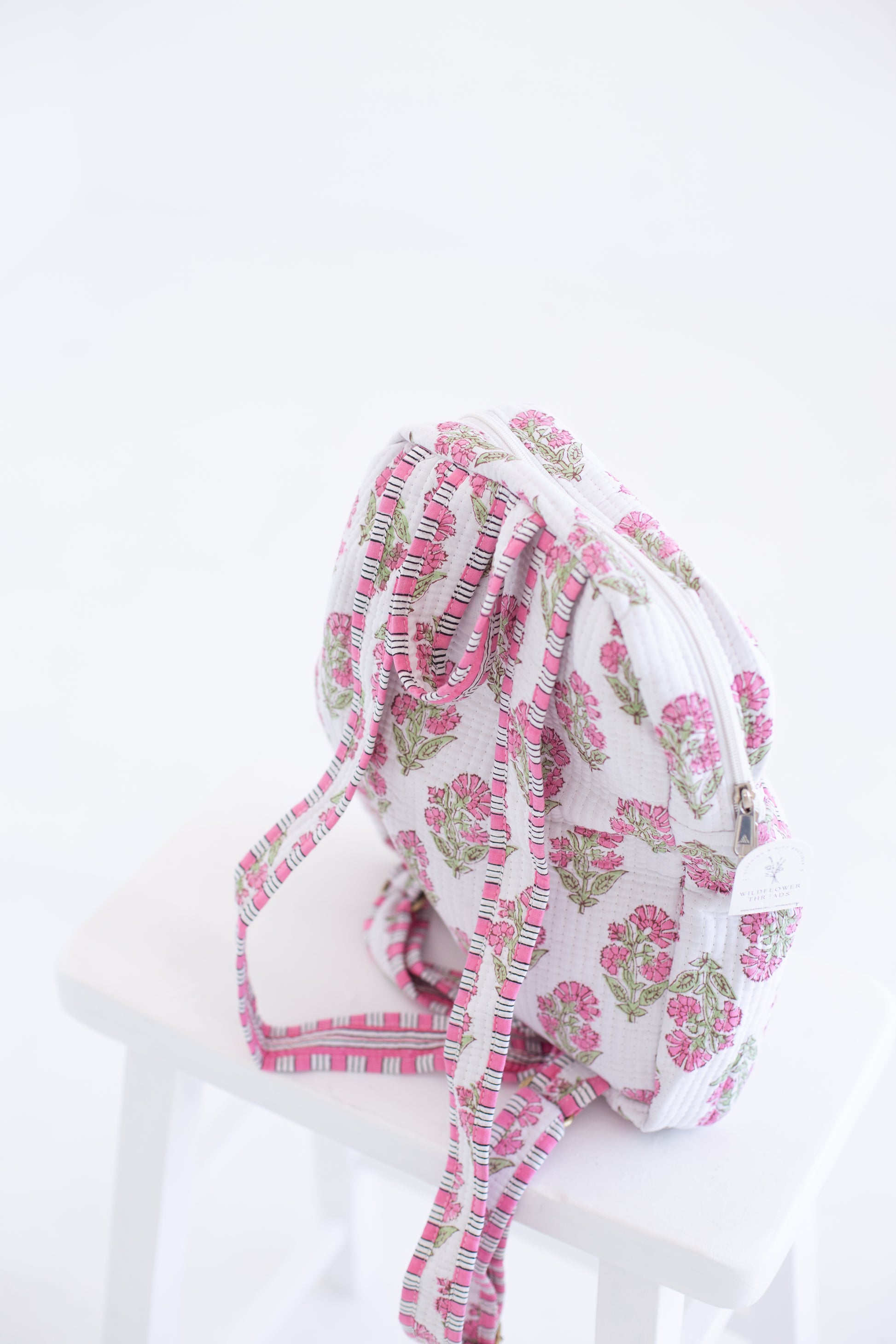 Brighten up your everyday with this charming white and pink floral print backpack. Featuring a cheerful hand-block inspired pattern, this lightweight bag is as pretty as it is practical. Padded straps keep you comfy on the go, while the roomy interior and front zip pocket make it easy to keep everything organized. Whether you’re heading to class, the gym, or weekend adventures, this backpack adds a fresh pop of color to any outfit. A feel-good favorite for school days, travel days, or every day. 13" x 11"